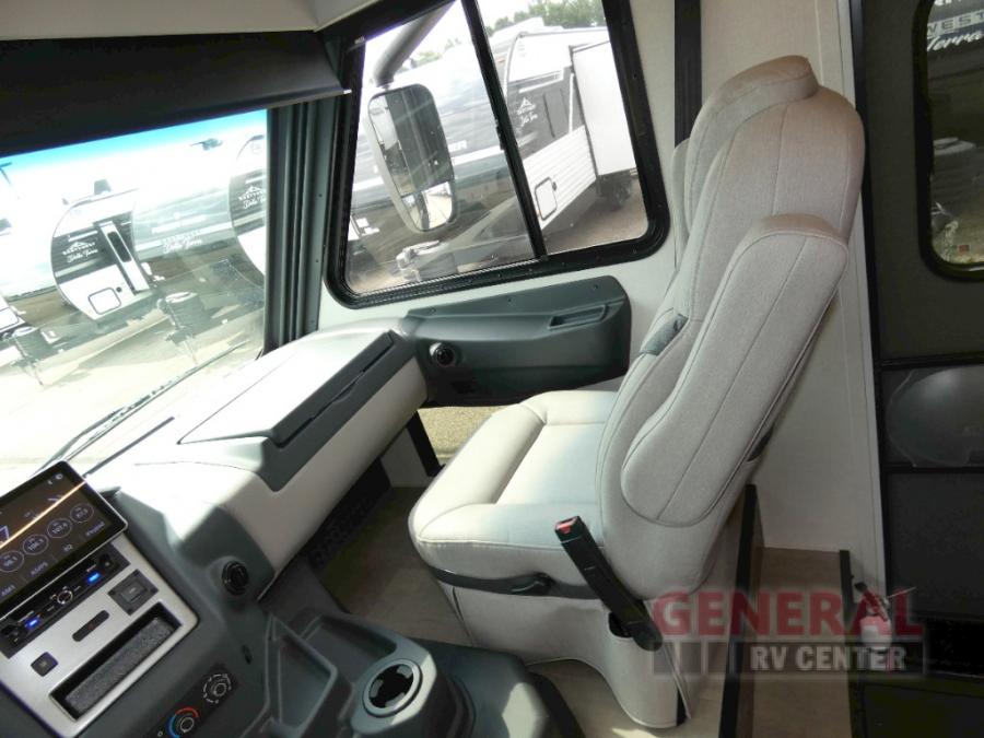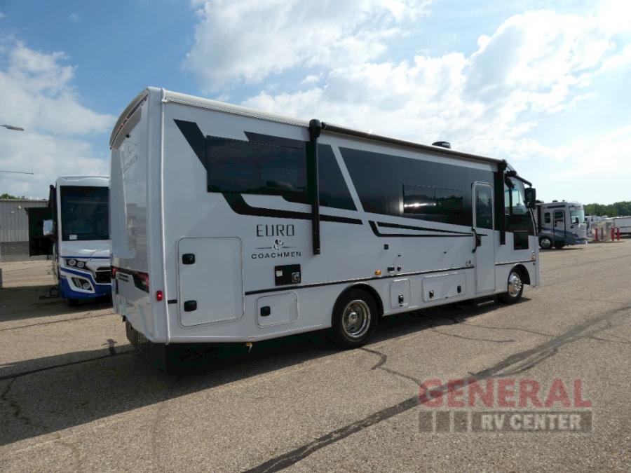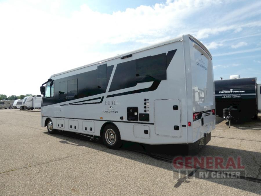 Enjoy the compact and stylish look of a European coach with the Euro Class A gas motorhome by Coachmen RV! There is a fiberglass front cap and a Ford F53 7.3L V8 chassis that will add to the life of your RV. The driver will love having a back up monitor with side view cameras, and the passenger can use the computer workstation to work remotely if needed. There is also traction control, cruise control, plus a tilt and telescoping steering wheel that will make the drive that much easier. An exterior propane hook-up also comes standard, along with radius trunk doors for your gear, and exterior storage for your outdoor gear. Head inside to find modern features, like the stainless steel appliances, square windows with day/night shades, and the list goes on!