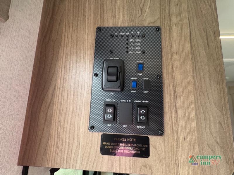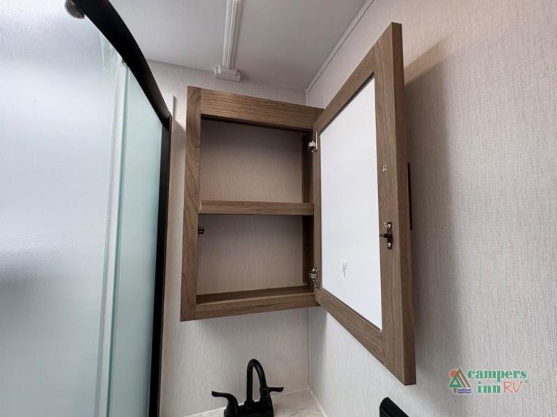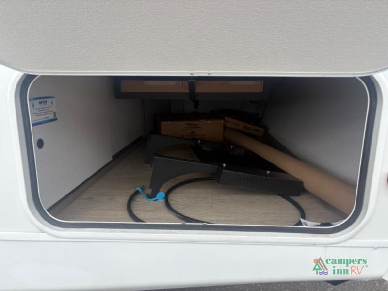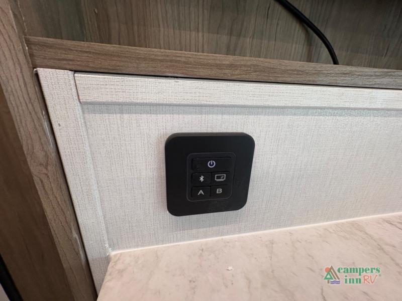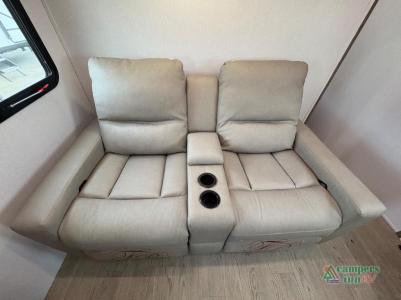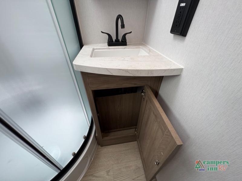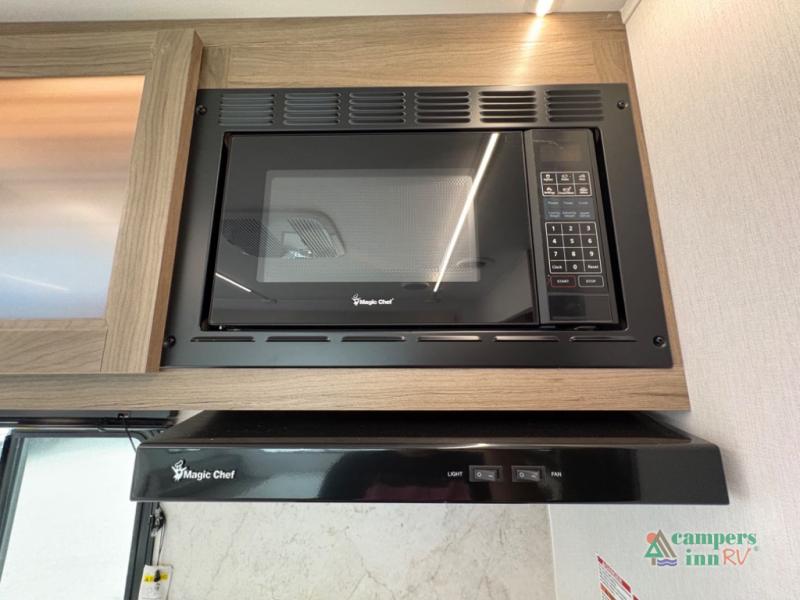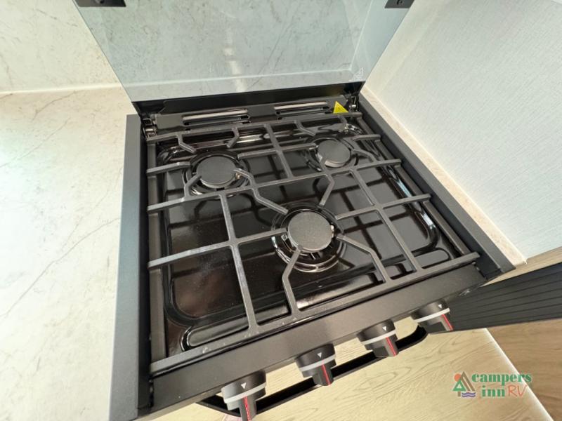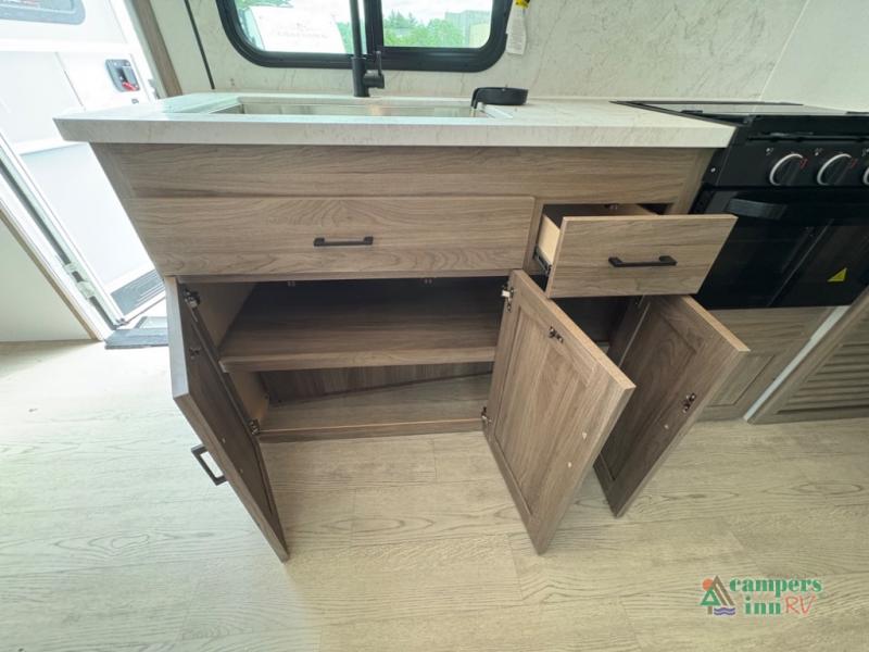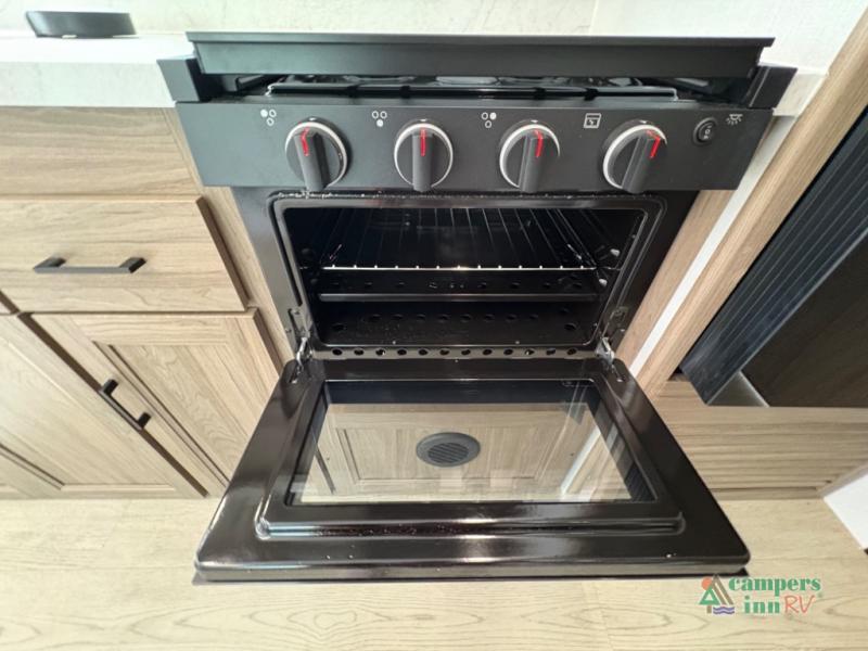 Exterior Amenities: Includes a full camp kitchen with a refrigerator, sink, and stove, as well as a power tongue jack and back-up camera prep.