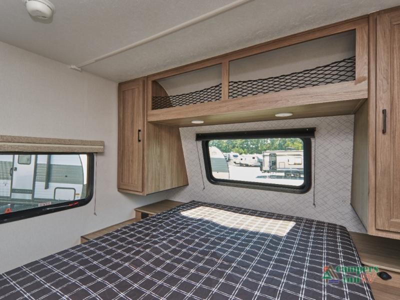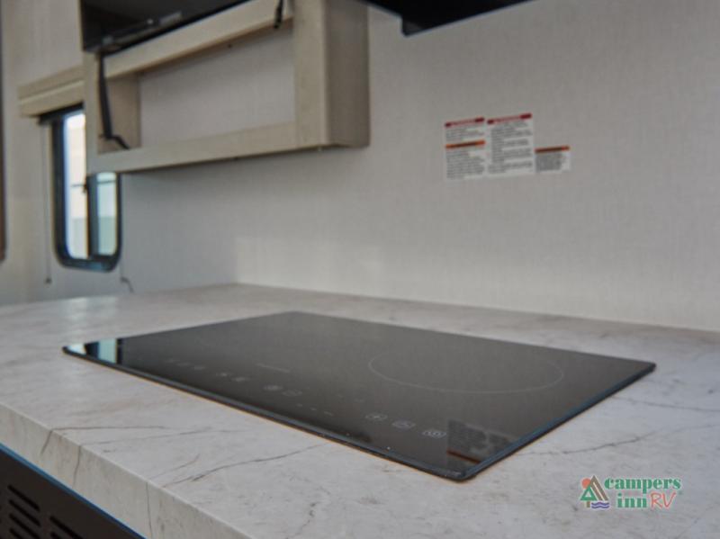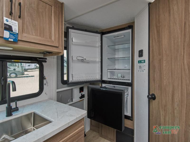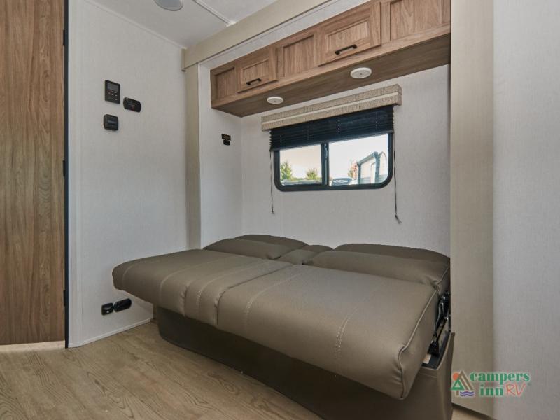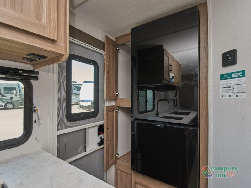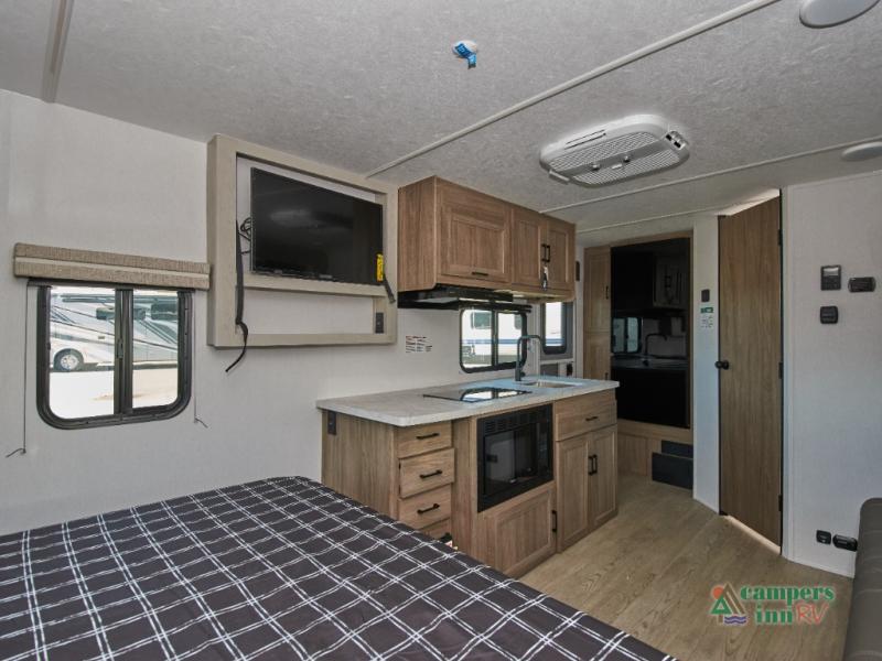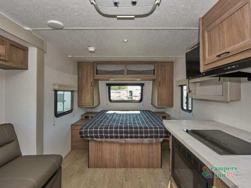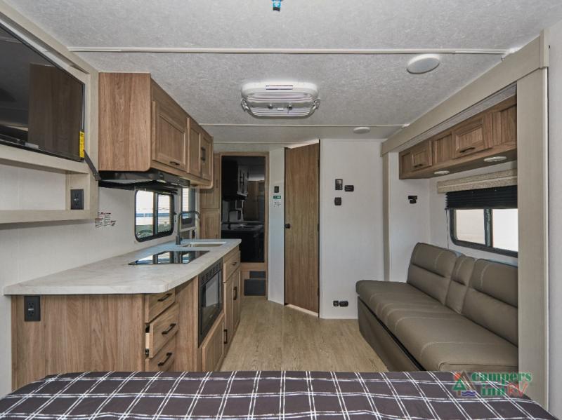 Step inside and you’ll find a bright, inviting interior with all the essentials to make your travels enjoyable. The modern kitchen is equipped with a two-burner cooktop, refrigerator, microwave, and plenty of storage, so you can prepare your favorite meals no matter where you roam. After a long day of exploring, relax in the cozy dinette that easily converts into extra sleeping space or unwind in the private queen bed area designed for restful nights.