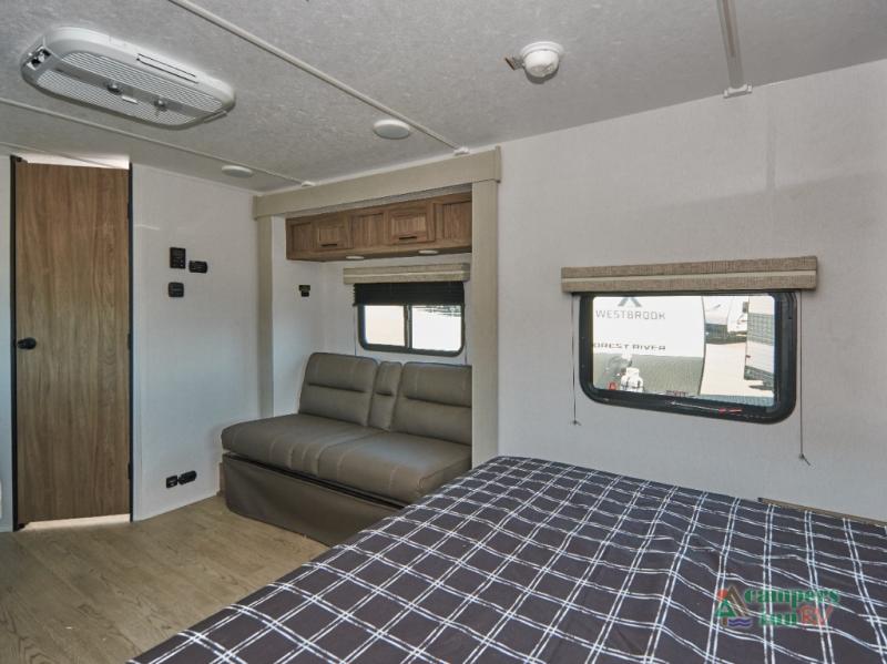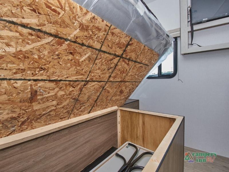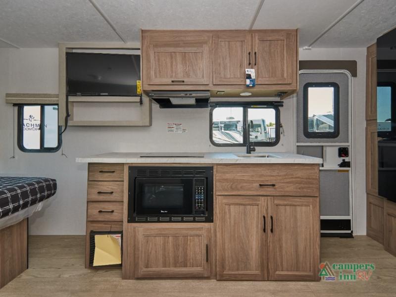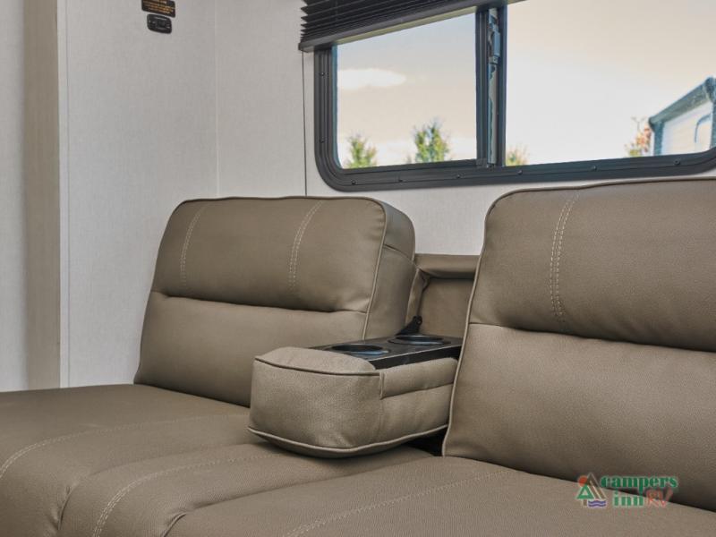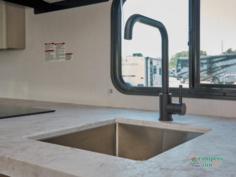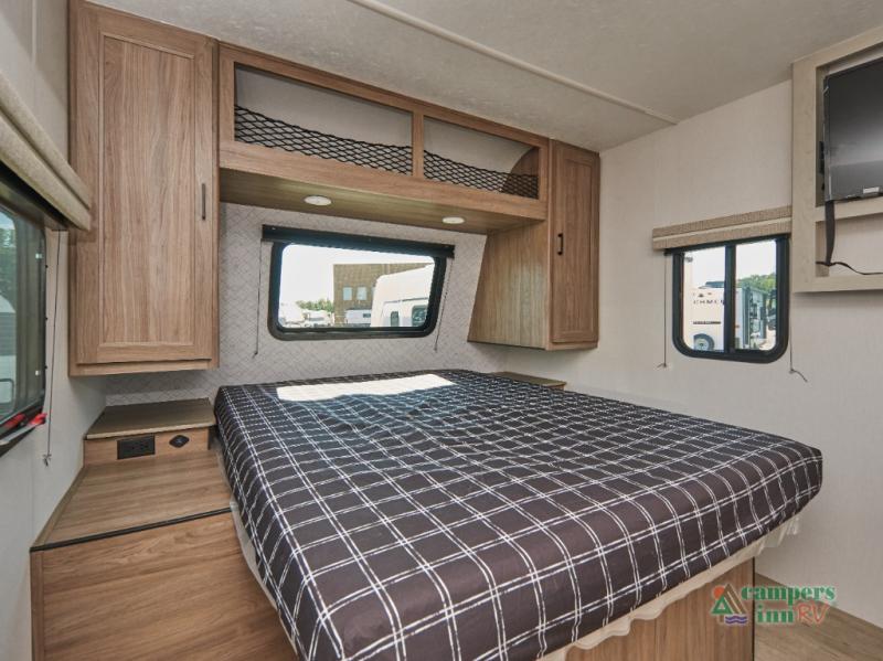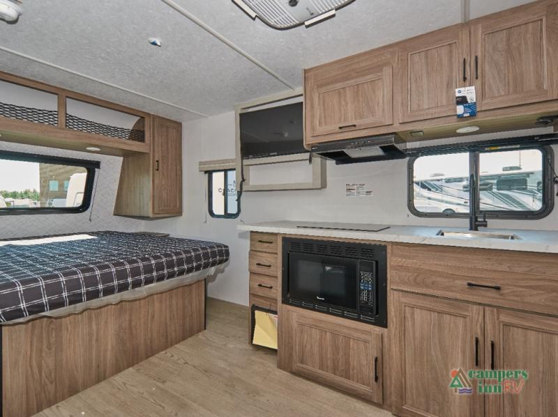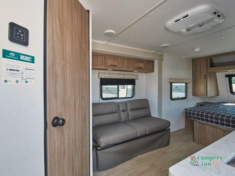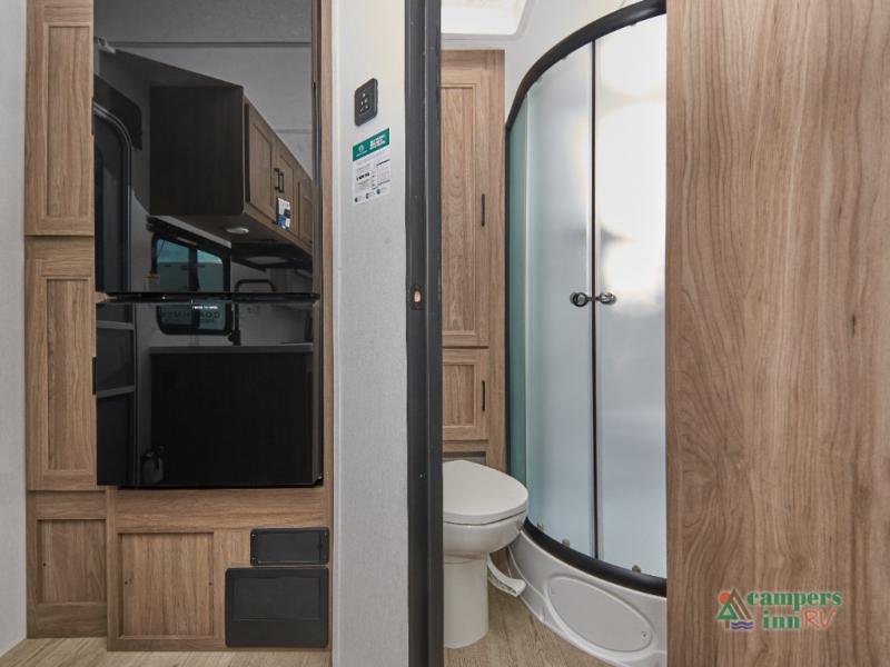 Step inside and you’ll find a bright, inviting interior with all the essentials to make your travels enjoyable. The modern kitchen is equipped with a two-burner cooktop, refrigerator, microwave, and plenty of storage, so you can prepare your favorite meals no matter where you roam. After a long day of exploring, relax in the cozy dinette that easily converts into extra sleeping space or unwind in the private queen bed area designed for restful nights.