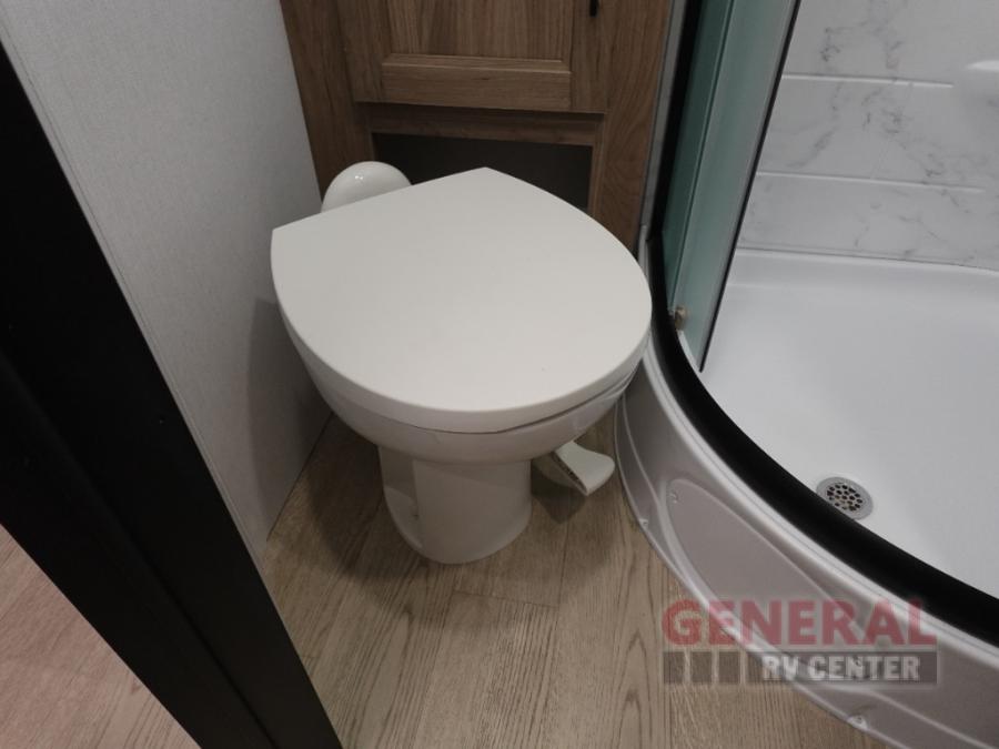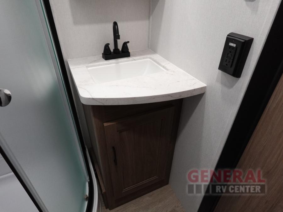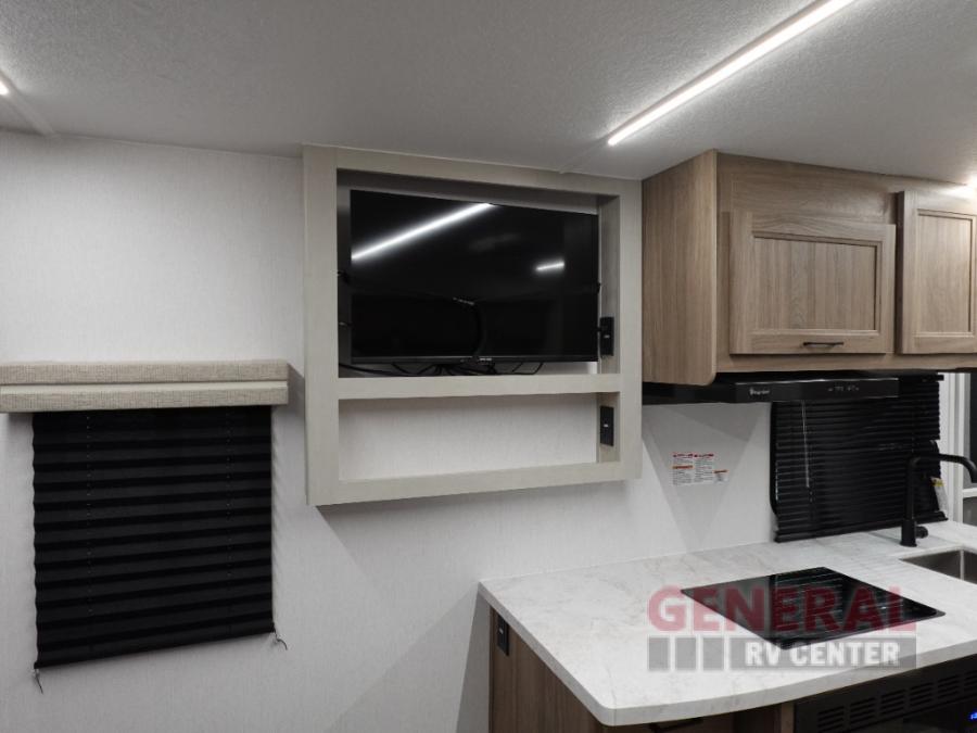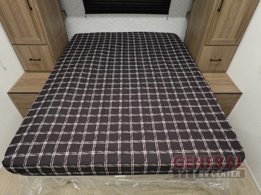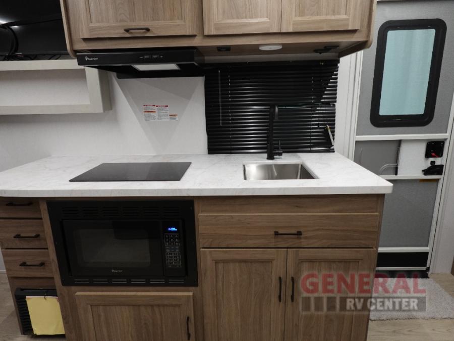 You'll love spending time at the campground in this single slide out travel trailer! The 60" x 80" front queen bed includes vaulted underbed storage to keep your luggage or extra blankets out of the way, plus there are dual bedside wardrobes for your clothes. A sofa with a free-standing table will provide a place to relax and dine, and the full kitchen includes a dual-burner cooktop and microwave to cook meals each day. This unit also features a rear corner bath with a 32" radius shower, a toilet, sink, and bath linen closet for clean towels!