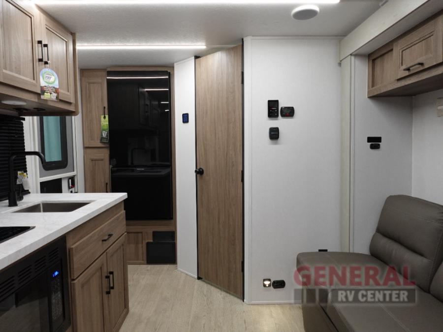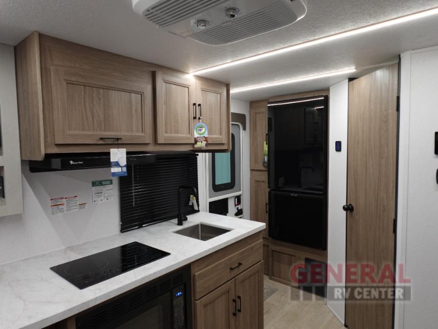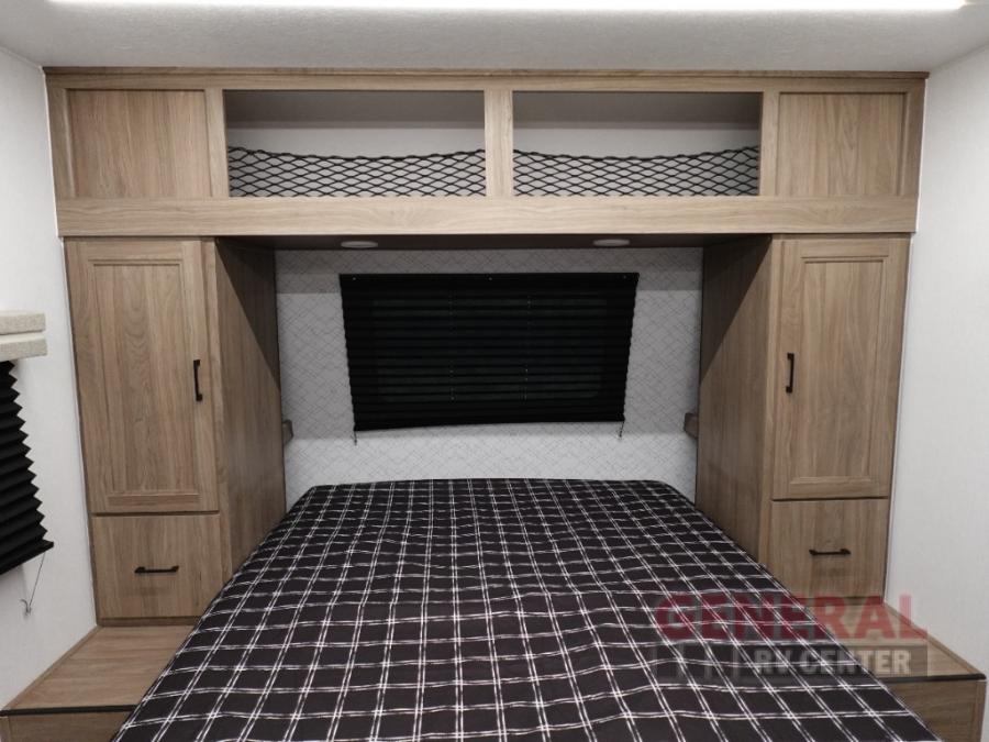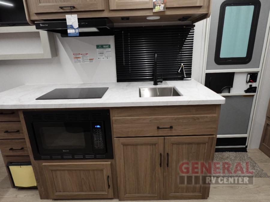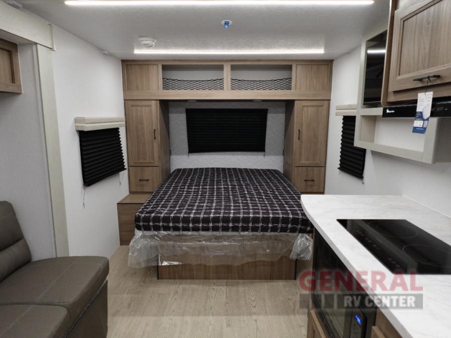 You'll love spending time at the campground in this single slide out travel trailer! The 60" x 80" front queen bed includes vaulted underbed storage to keep your luggage or extra blankets out of the way, plus there are dual bedside wardrobes for your clothes. A sofa with a free-standing table will provide a place to relax and dine, and the full kitchen includes a dual-burner cooktop and microwave to cook meals each day. This unit also features a rear corner bath with a 32" radius shower, a toilet, sink, and bath linen closet for clean towels!