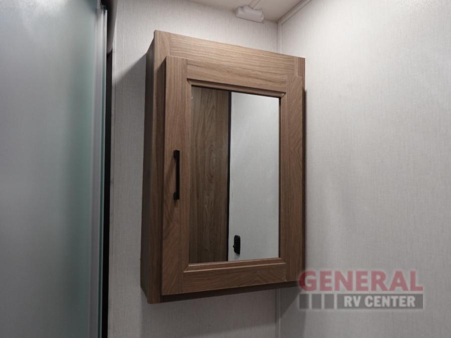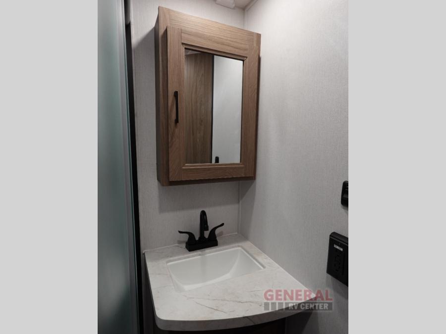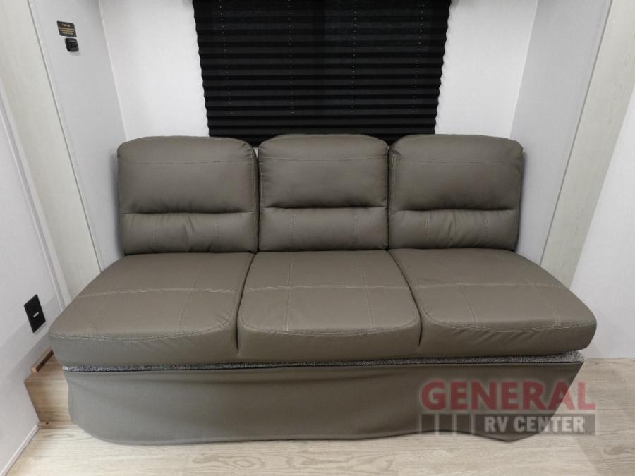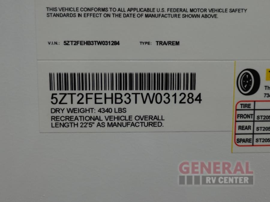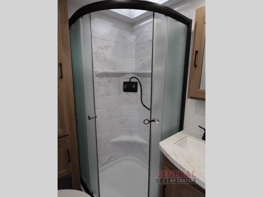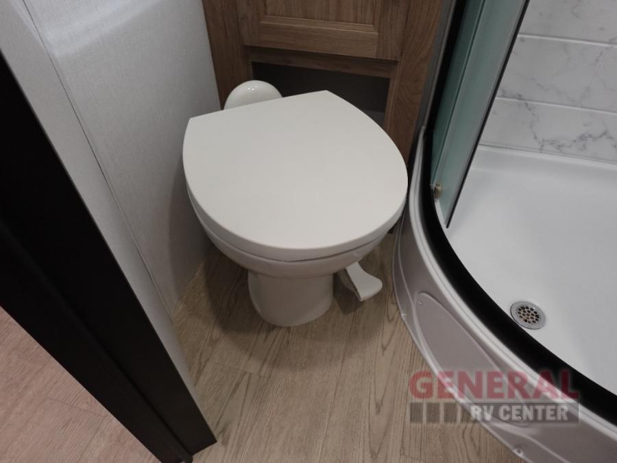 You'll love spending time at the campground in this single slide out travel trailer! The 60" x 80" front queen bed includes vaulted underbed storage to keep your luggage or extra blankets out of the way, plus there are dual bedside wardrobes for your clothes. A sofa with a free-standing table will provide a place to relax and dine, and the full kitchen includes a dual-burner cooktop and microwave to cook meals each day. This unit also features a rear corner bath with a 32" radius shower, a toilet, sink, and bath linen closet for clean towels!
