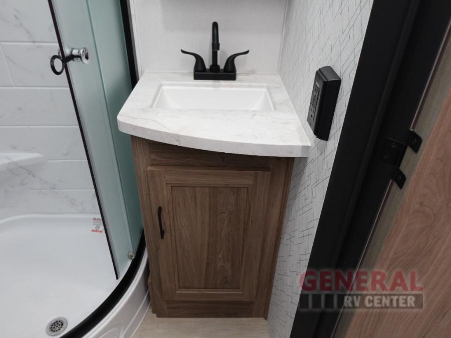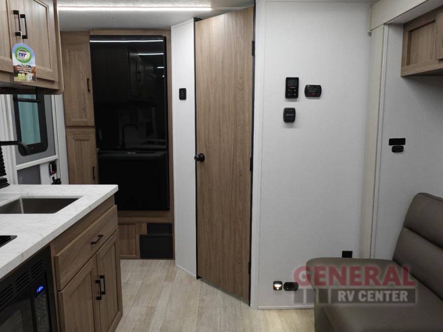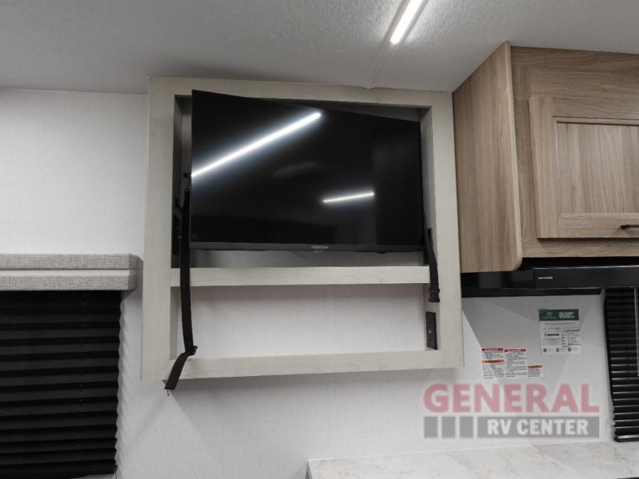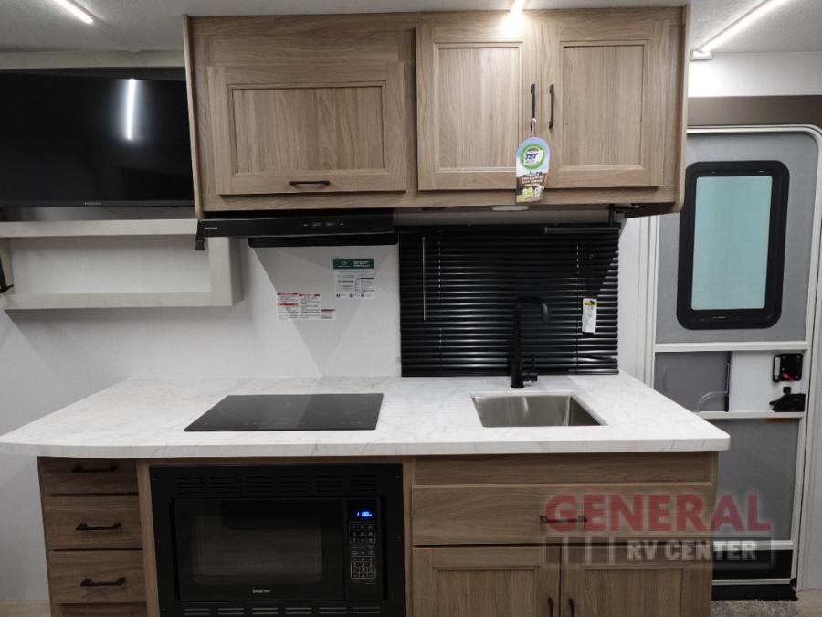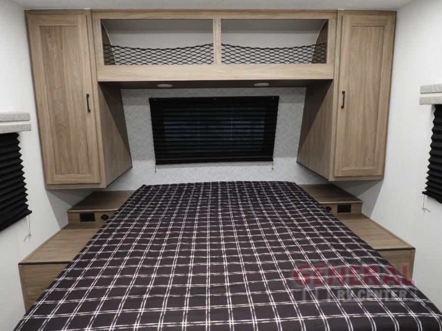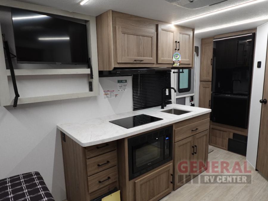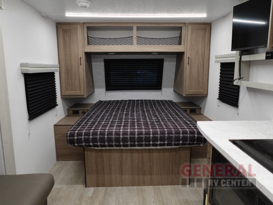 You'll love spending time at the campground in this single slide out travel trailer! The 60" x 80" front queen bed includes vaulted underbed storage to keep your luggage or extra blankets out of the way, plus there are dual bedside wardrobes for your clothes. A sofa with a free-standing table will provide a place to relax and dine, and the full kitchen includes a dual-burner cooktop and microwave to cook meals each day. This unit also features a rear corner bath with a 32" radius shower, a toilet, sink, and bath linen closet for clean towels!