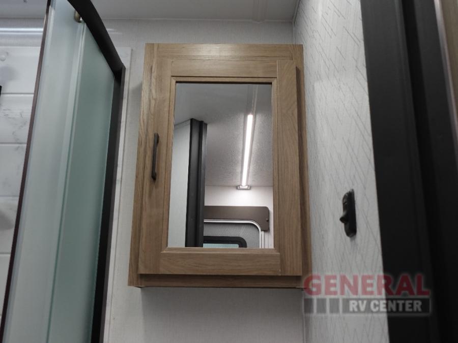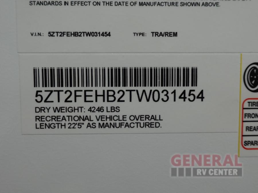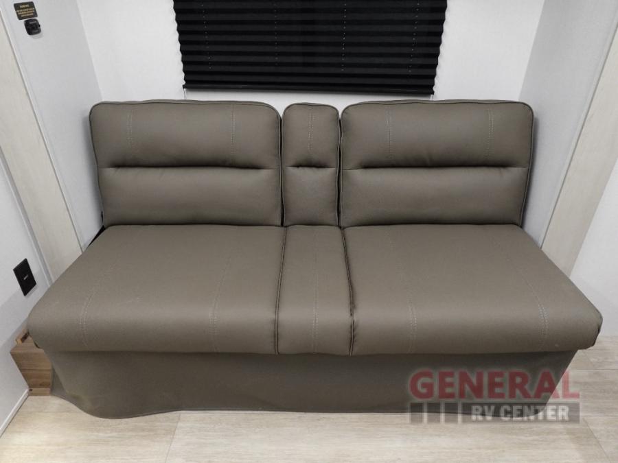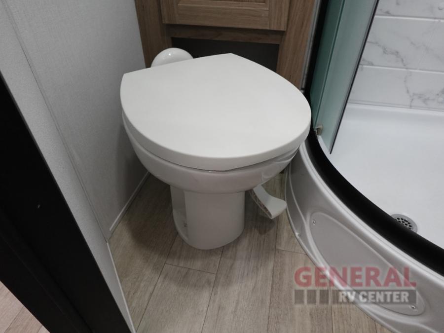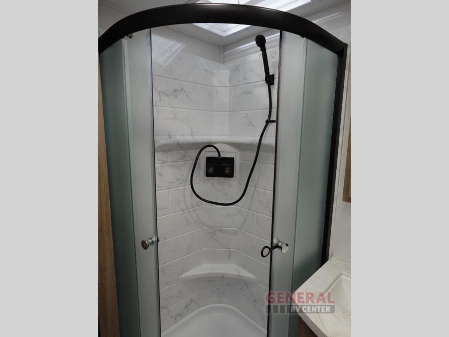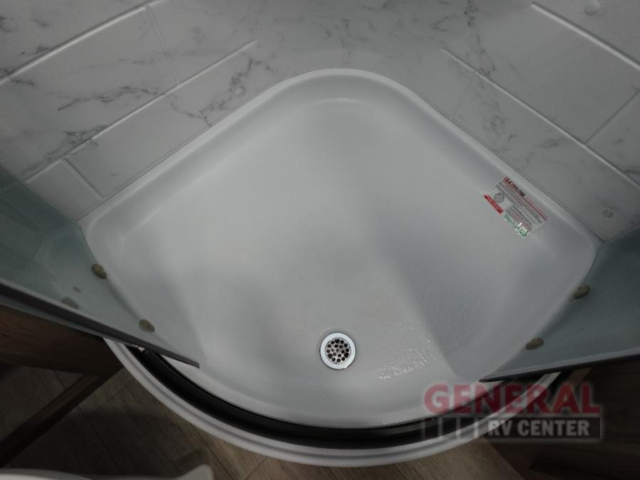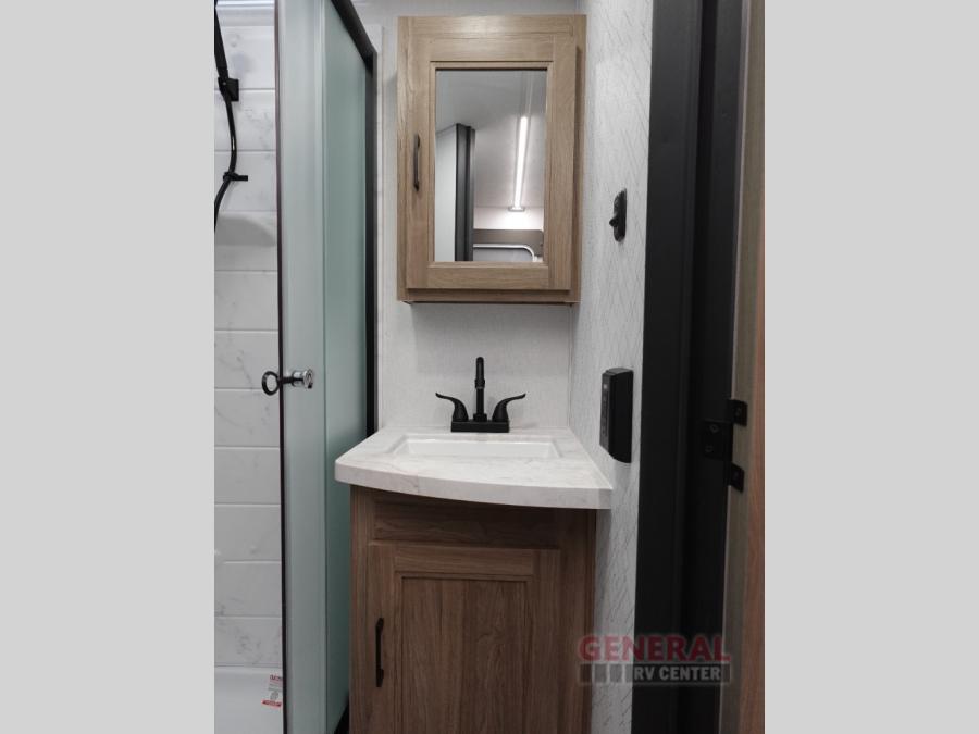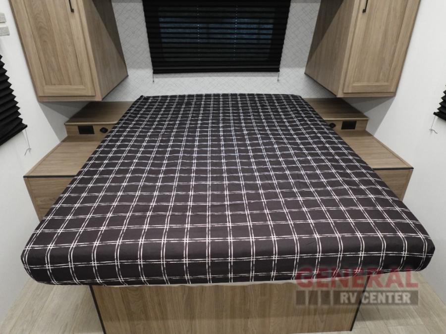 You'll love spending time at the campground in this single slide out travel trailer! The 60" x 80" front queen bed includes vaulted underbed storage to keep your luggage or extra blankets out of the way, plus there are dual bedside wardrobes for your clothes. A sofa with a free-standing table will provide a place to relax and dine, and the full kitchen includes a dual-burner cooktop and microwave to cook meals each day. This unit also features a rear corner bath with a 32" radius shower, a toilet, sink, and bath linen closet for clean towels!