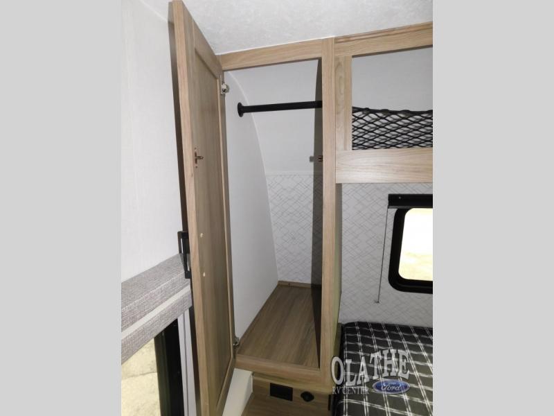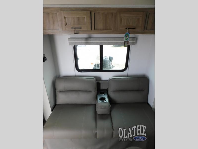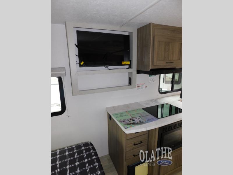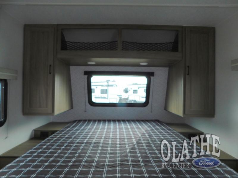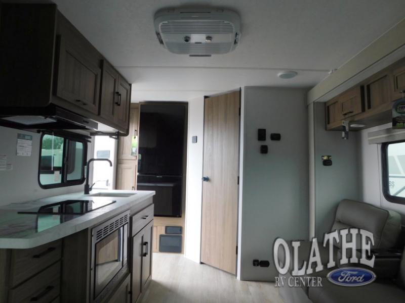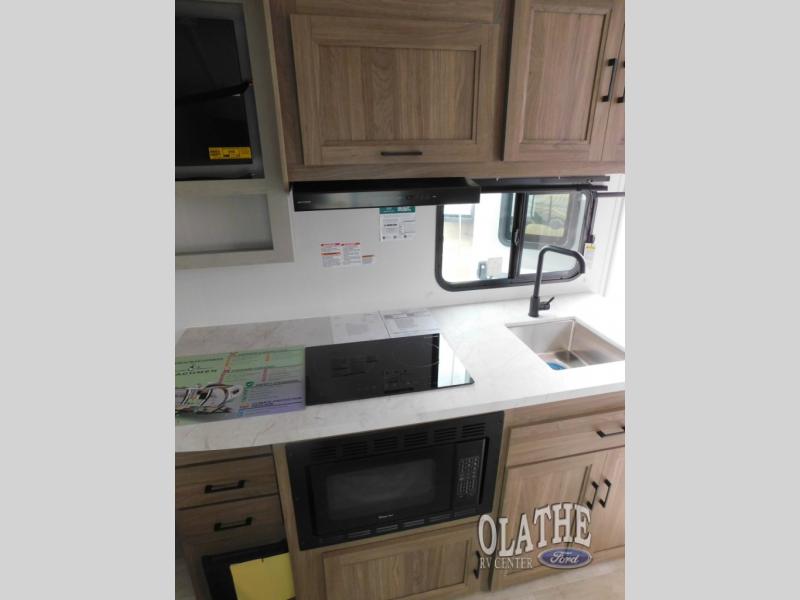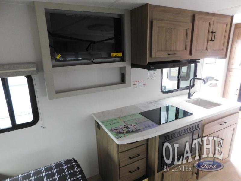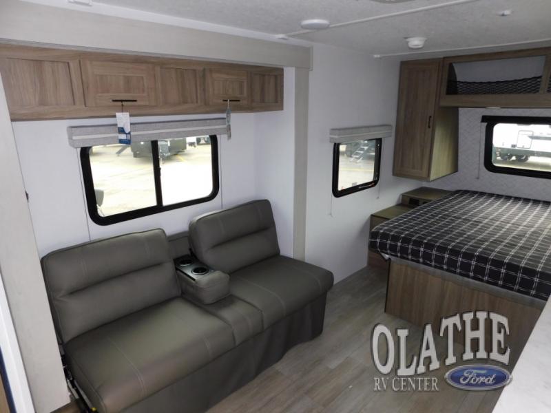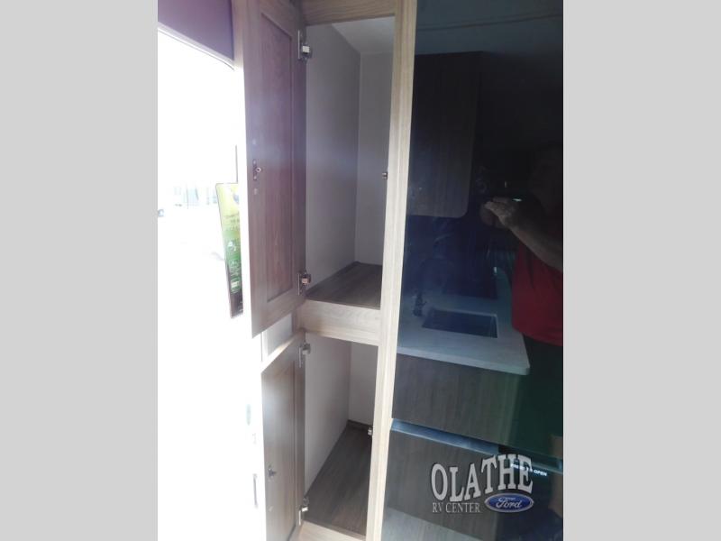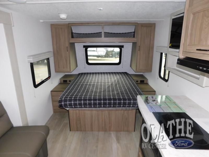 You'll love spending time at the campground in this single slide out travel trailer! The 60" x 80" front queen bed includes vaulted underbed storage to keep your luggage or extra blankets out of the way, plus there are dual bedside wardrobes for your clothes. A sofa with a free-standing table will provide a place to relax and dine, and the full kitchen includes a dual-burner cooktop and microwave to cook meals each day. This unit also features a rear corner bath with a 32" radius shower, a toilet, sink, and bath linen closet for clean towels!