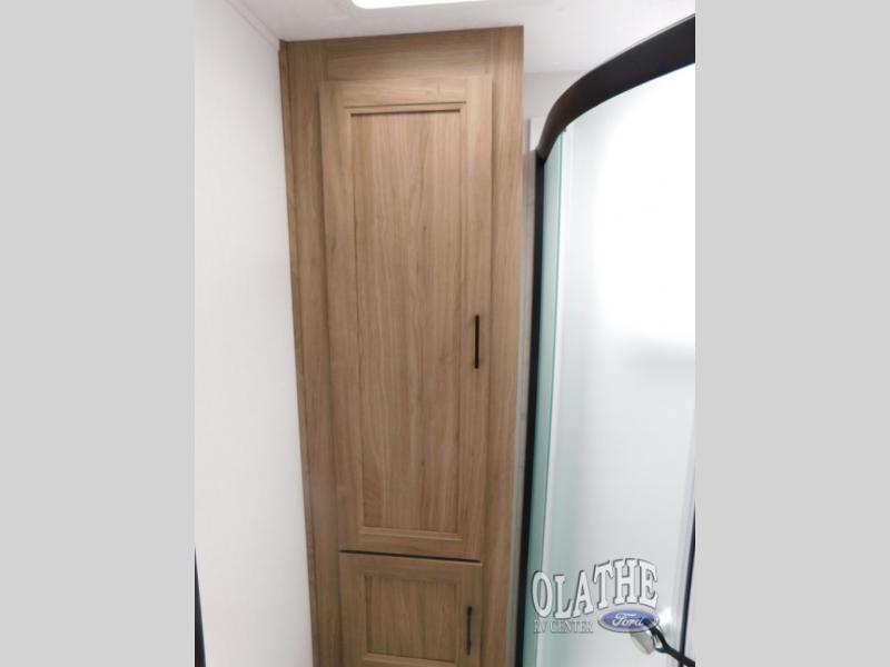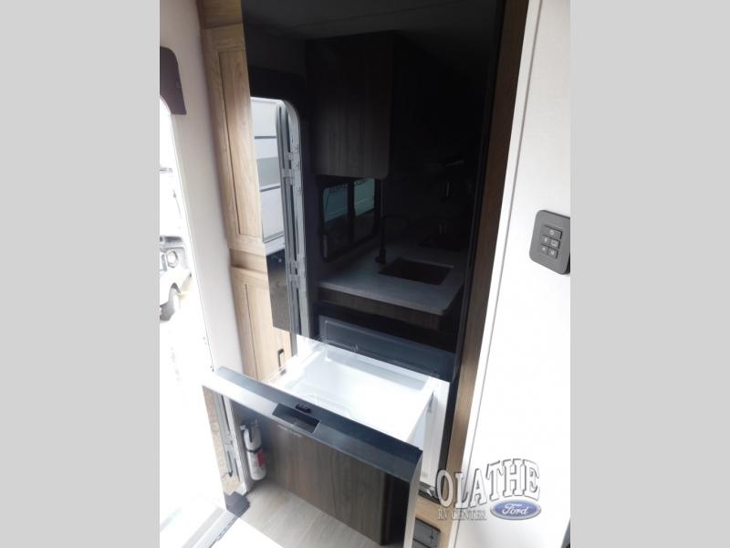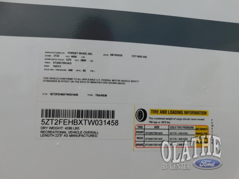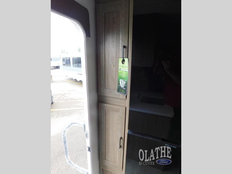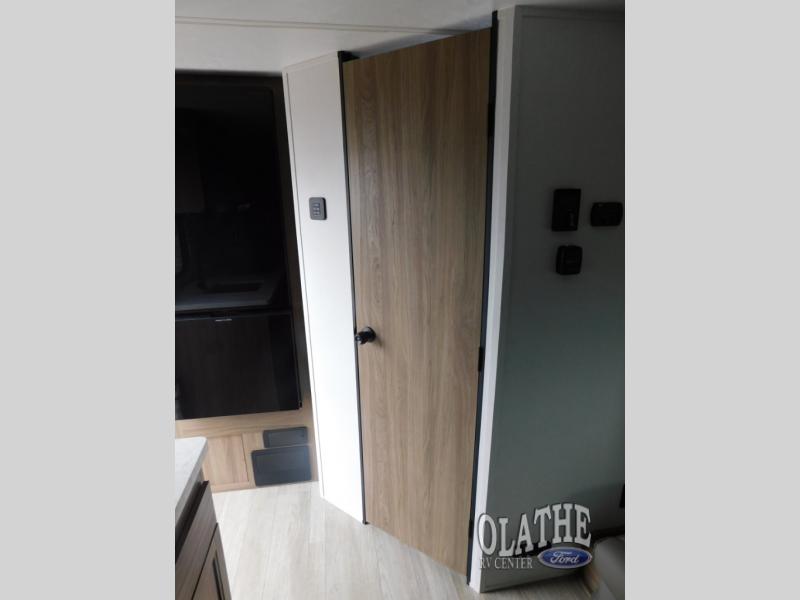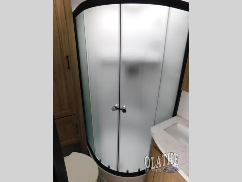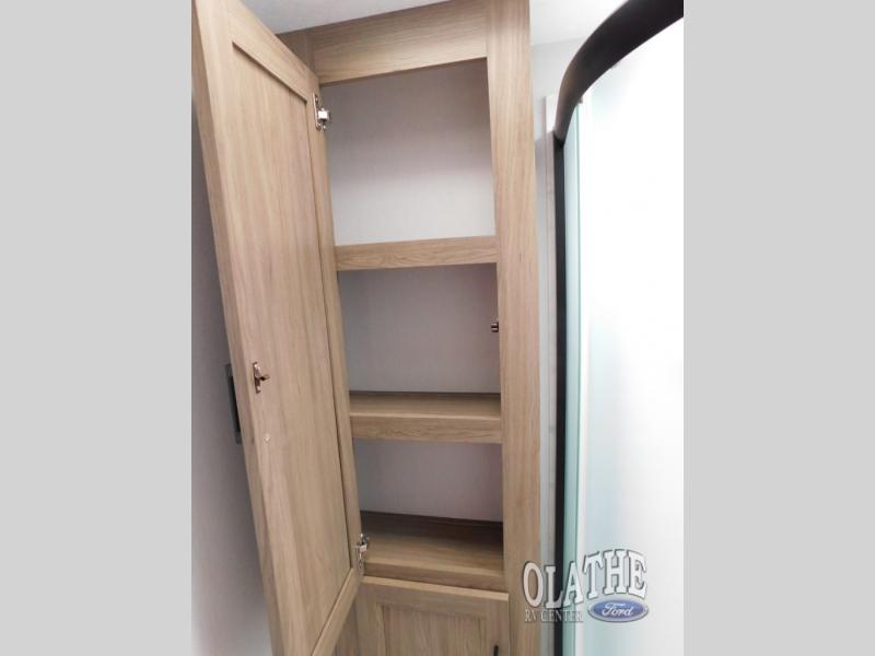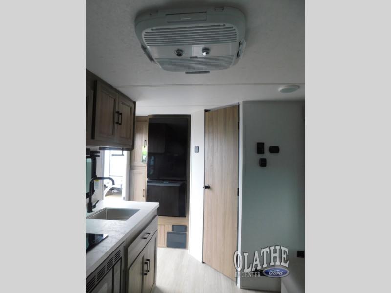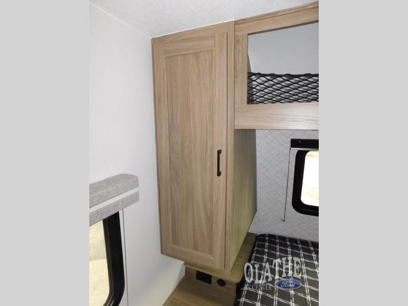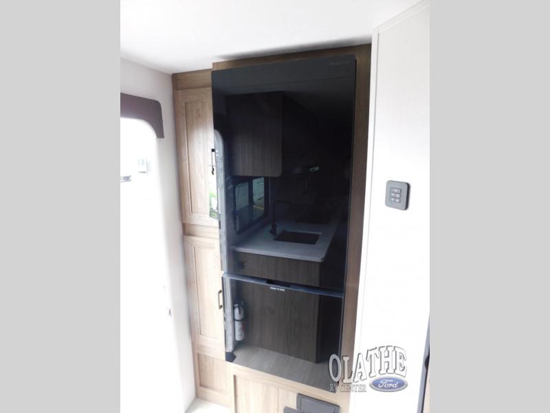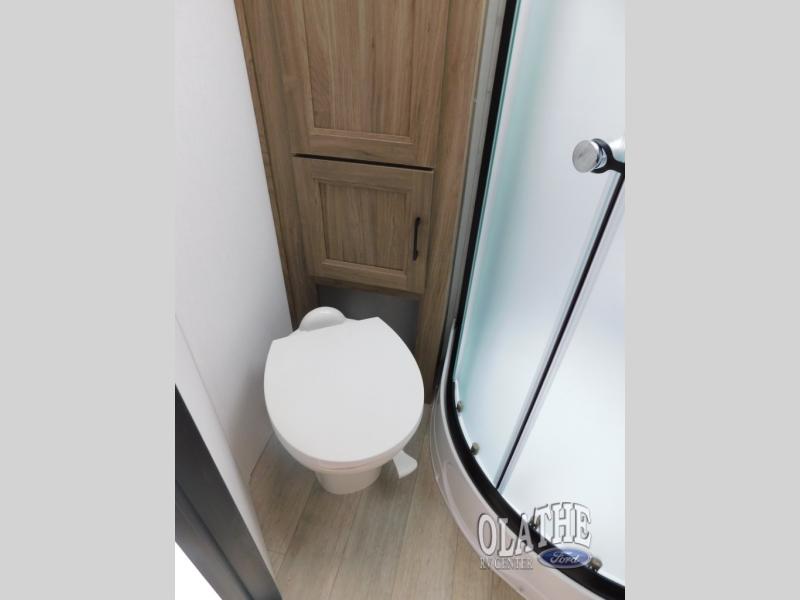 You'll love spending time at the campground in this single slide out travel trailer! The 60" x 80" front queen bed includes vaulted underbed storage to keep your luggage or extra blankets out of the way, plus there are dual bedside wardrobes for your clothes. A sofa with a free-standing table will provide a place to relax and dine, and the full kitchen includes a dual-burner cooktop and microwave to cook meals each day. This unit also features a rear corner bath with a 32" radius shower, a toilet, sink, and bath linen closet for clean towels!