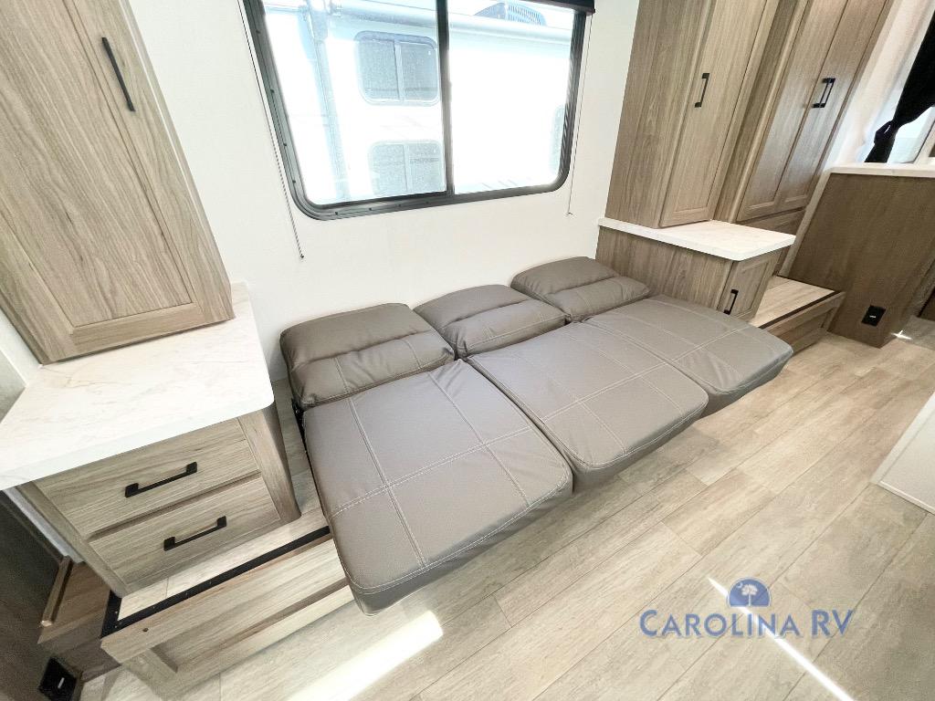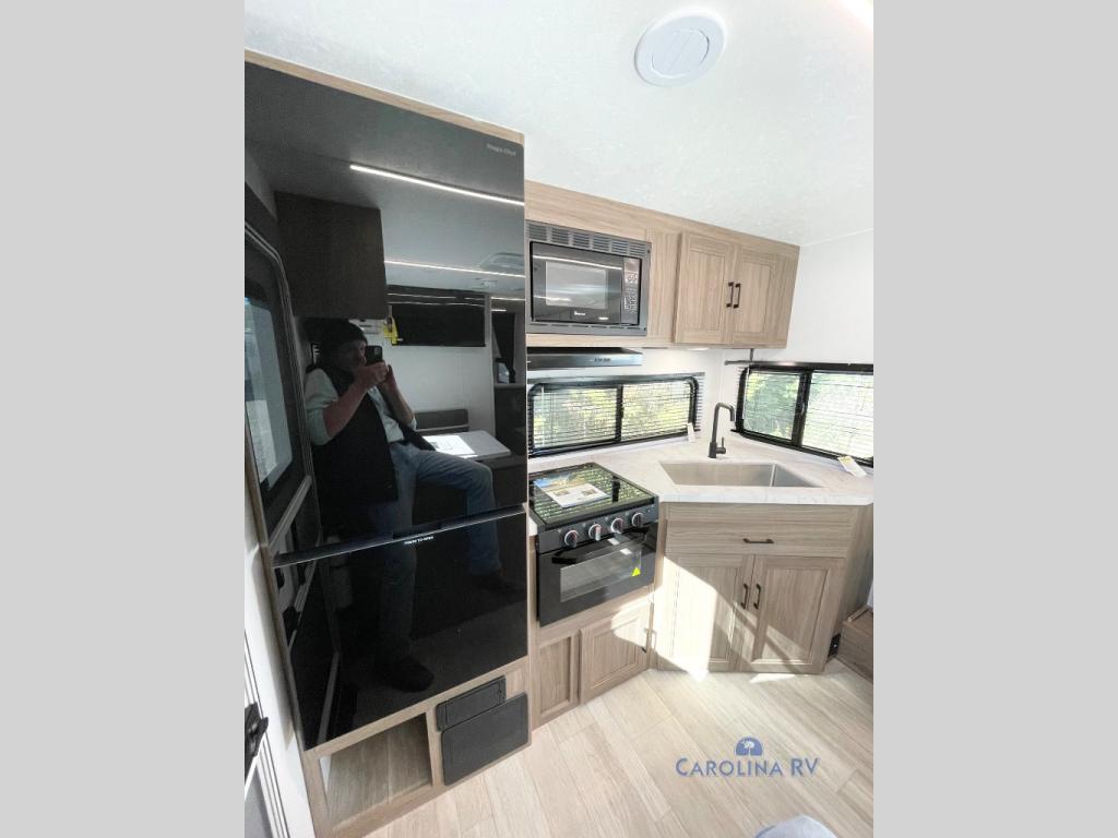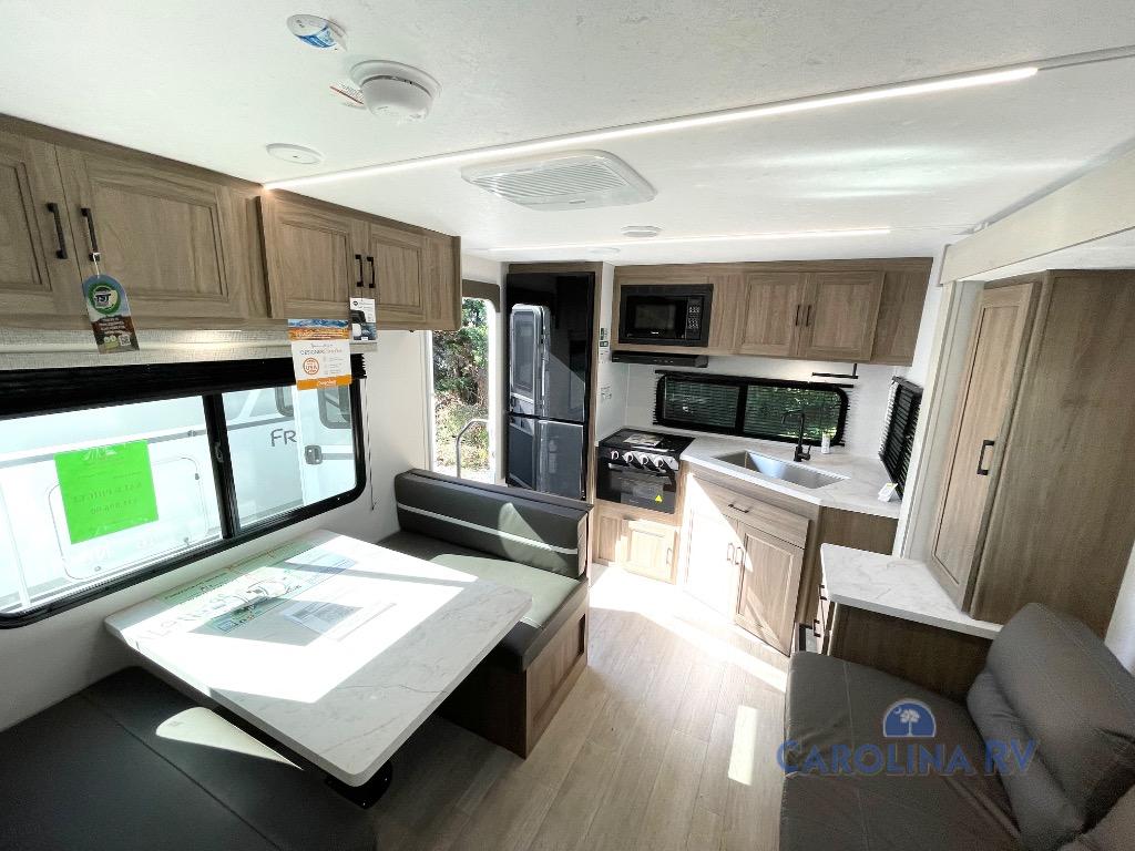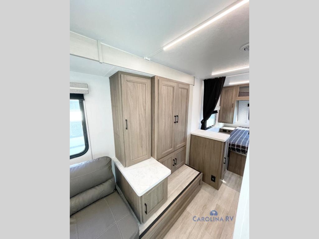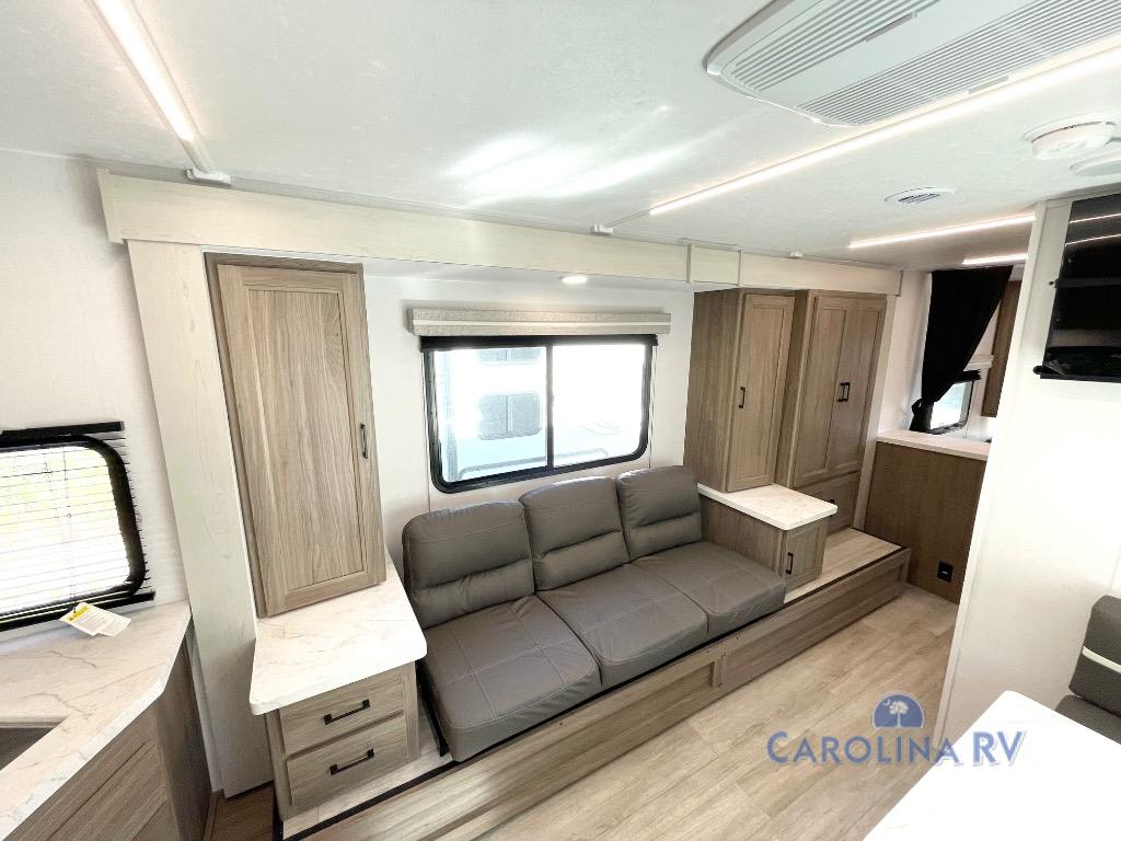 This travel trailer will feel a little more like home since there is a semi-private front bedroom with a queen bed, dual wardrobes, and a bedroom privacy curtain. On the opposite end, the rear kitchen will let you make meals each day on the dual-burner cooktop and microwave, plus there is a 12V refrigerator to keep food fresh. A large slide out includes a sofa, dual pantries with end tables, plus a wardrobe with a bench where you can pull your hiking boots off. And a booth dinette provides the perfect place to dine and play games together!