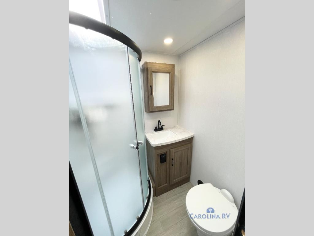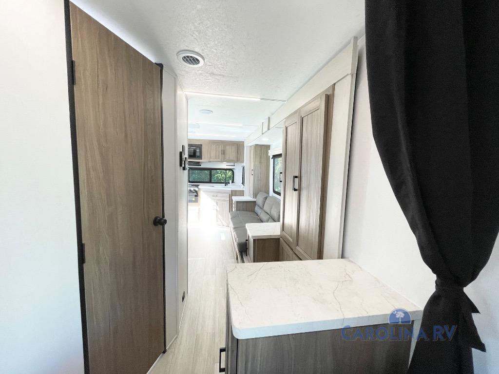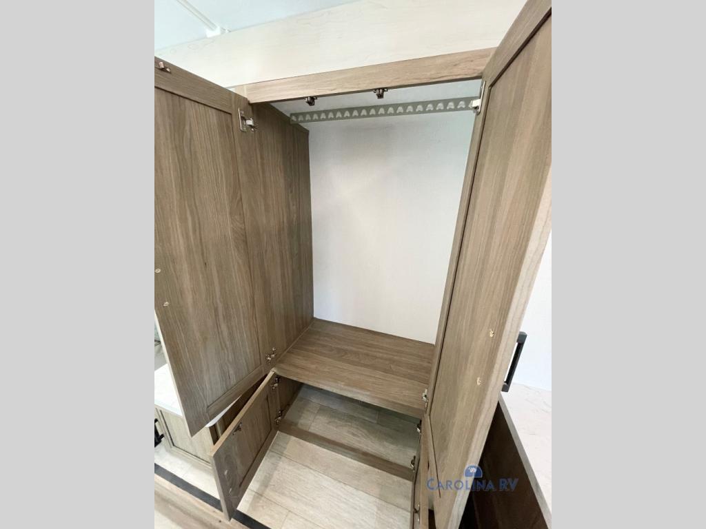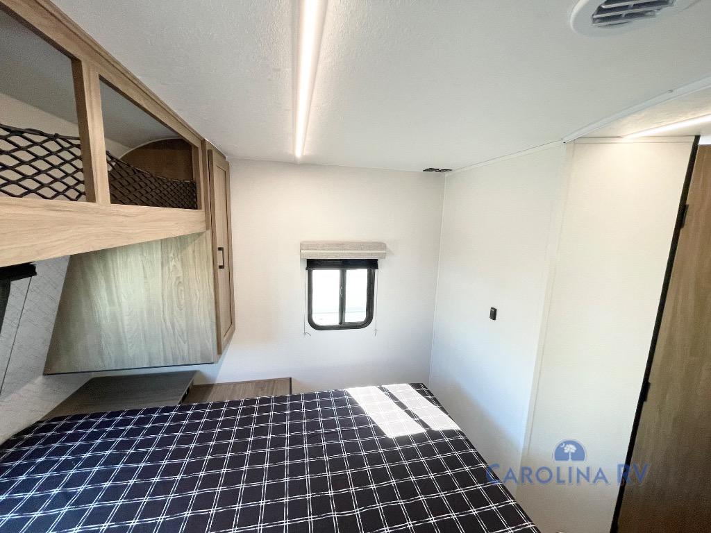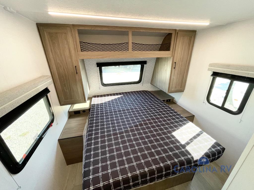 This travel trailer will feel a little more like home since there is a semi-private front bedroom with a queen bed, dual wardrobes, and a bedroom privacy curtain. On the opposite end, the rear kitchen will let you make meals each day on the dual-burner cooktop and microwave, plus there is a 12V refrigerator to keep food fresh. A large slide out includes a sofa, dual pantries with end tables, plus a wardrobe with a bench where you can pull your hiking boots off. And a booth dinette provides the perfect place to dine and play games together!