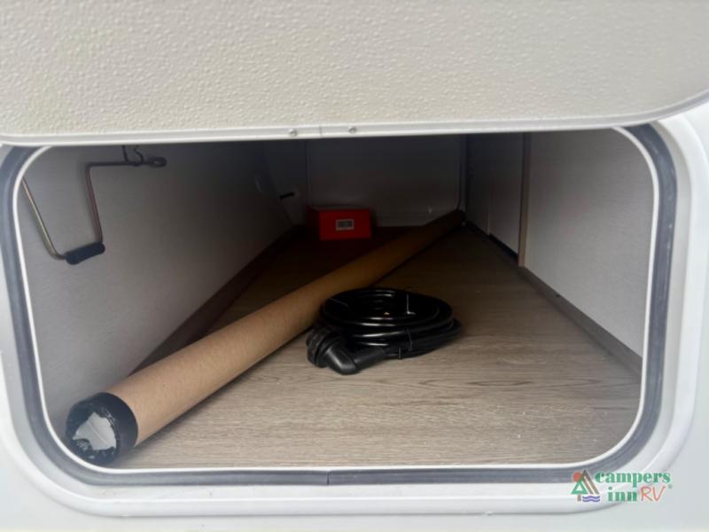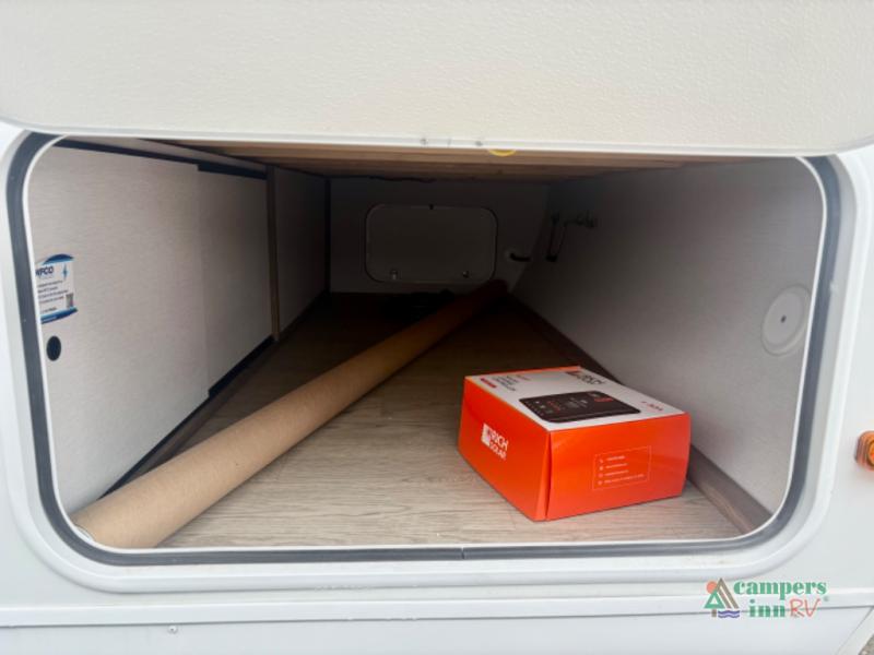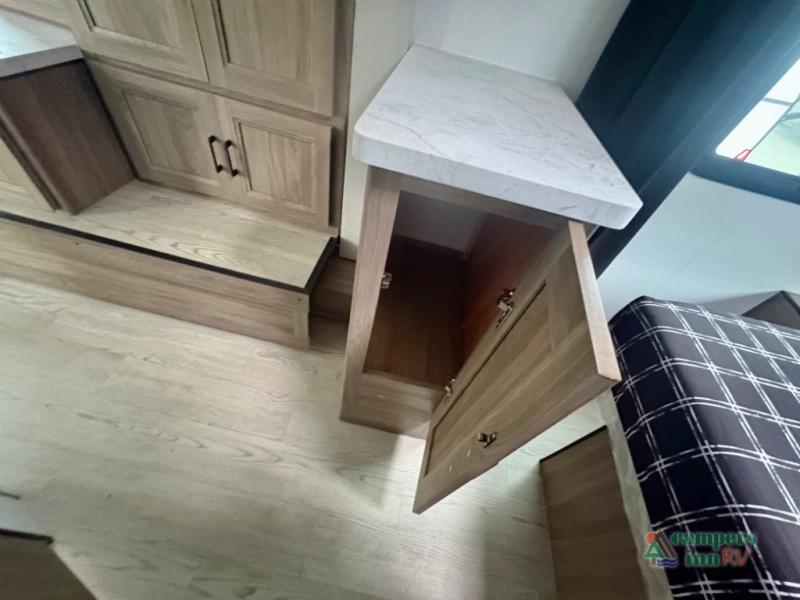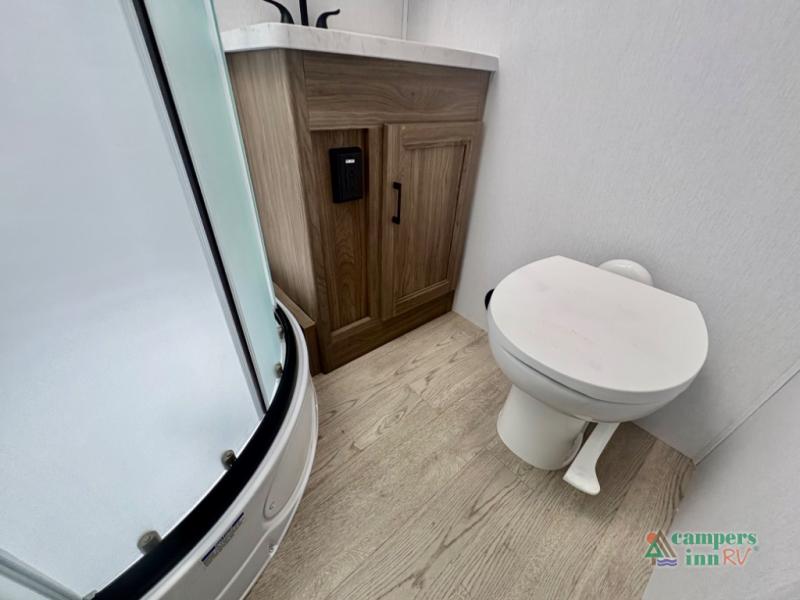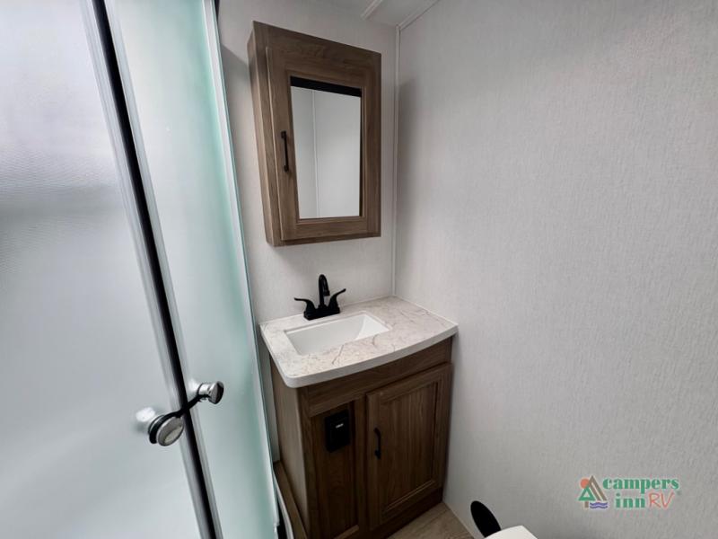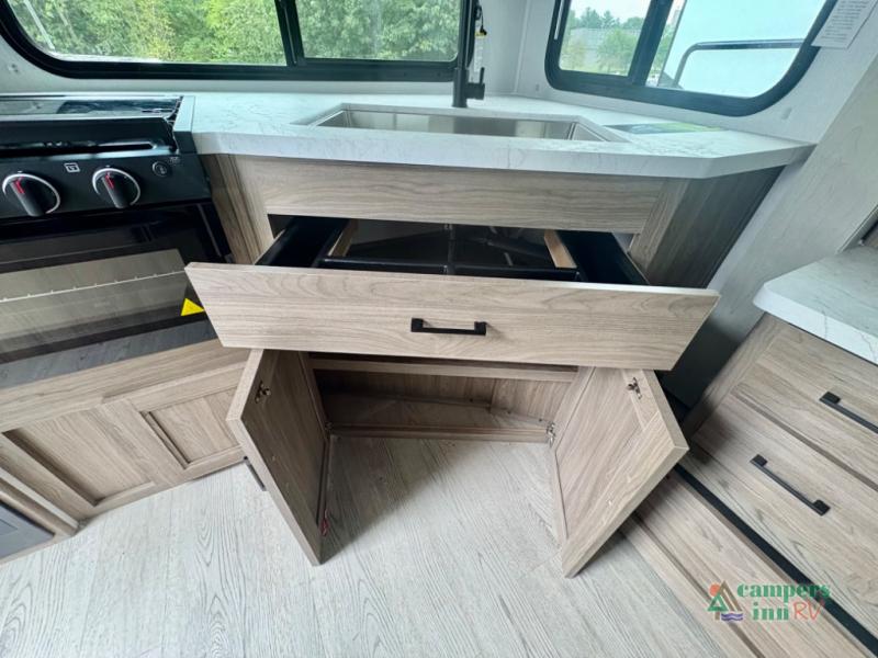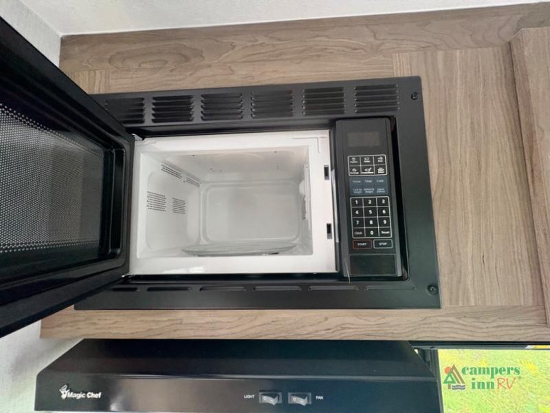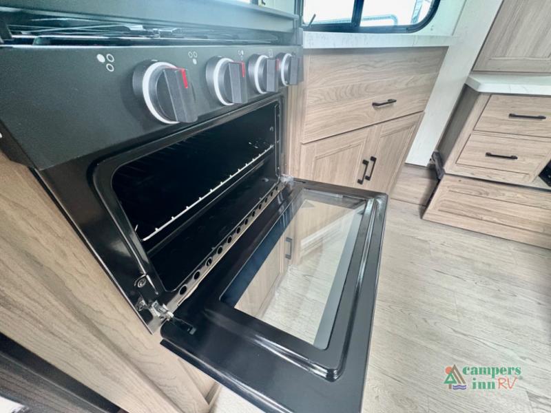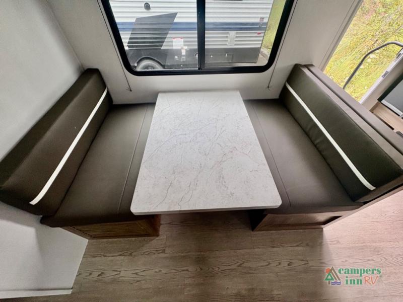 This travel trailer will feel a little more like home since there is a semi-private front bedroom with a queen bed, dual wardrobes, and a bedroom privacy curtain. On the opposite end, the rear kitchen will let you make meals each day on the dual-burner cooktop and microwave, plus there is a 12V refrigerator to keep food fresh. A large slide out includes a sofa, dual pantries with end tables, plus a wardrobe with a bench where you can pull your hiking boots off. And a booth dinette provides the perfect place to dine and play games together!