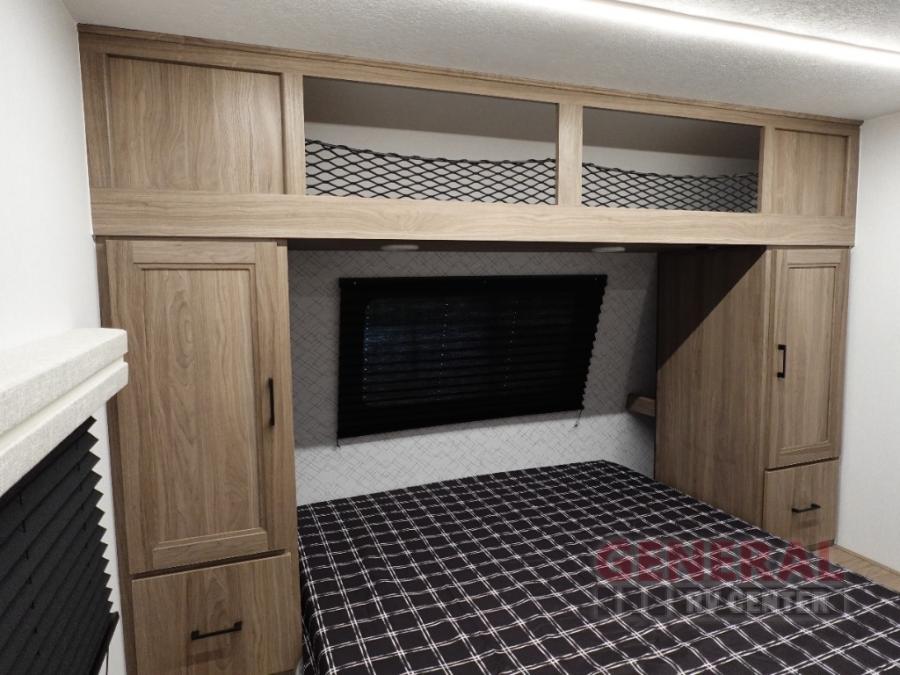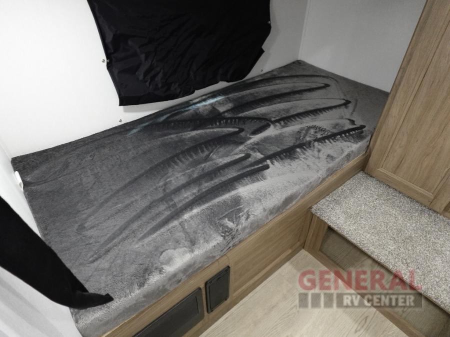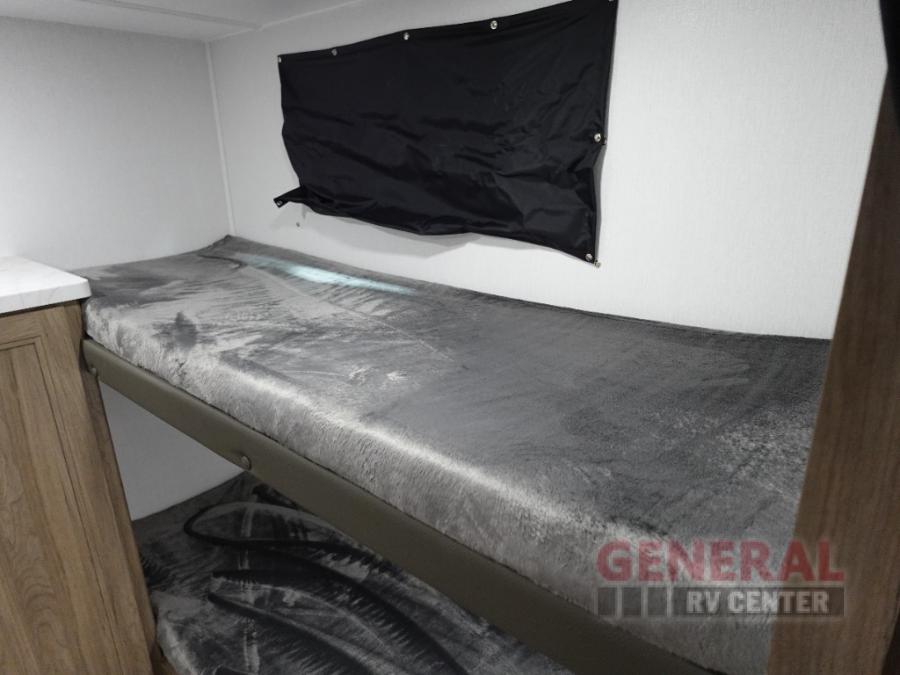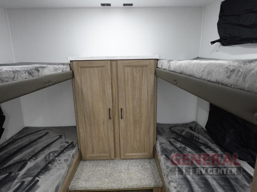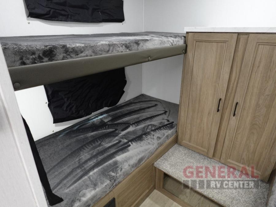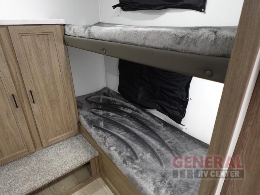 Whole-family fun is waiting for you in this spacious travel trailer. The kids or your guests will love the private bunkhouse with four bunks, plus a wardrobe with a countertop to keep their things. You will enjoy the front private bedroom with a walk-around queen bed and dual wardrobes, and if you have any other guests, they can sleep on the sofa or U-shaped dinette within the large slide out. The kitchen includes everything needed to prepare meals each day, including a microwave, a dual-burner cooktop, and a double door refrigerator. This model also includes a pass-through storage, plus additional exterior storage to bring along hiking gear, fishing poles, and camp chairs!
