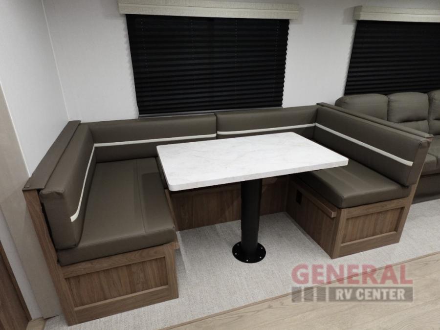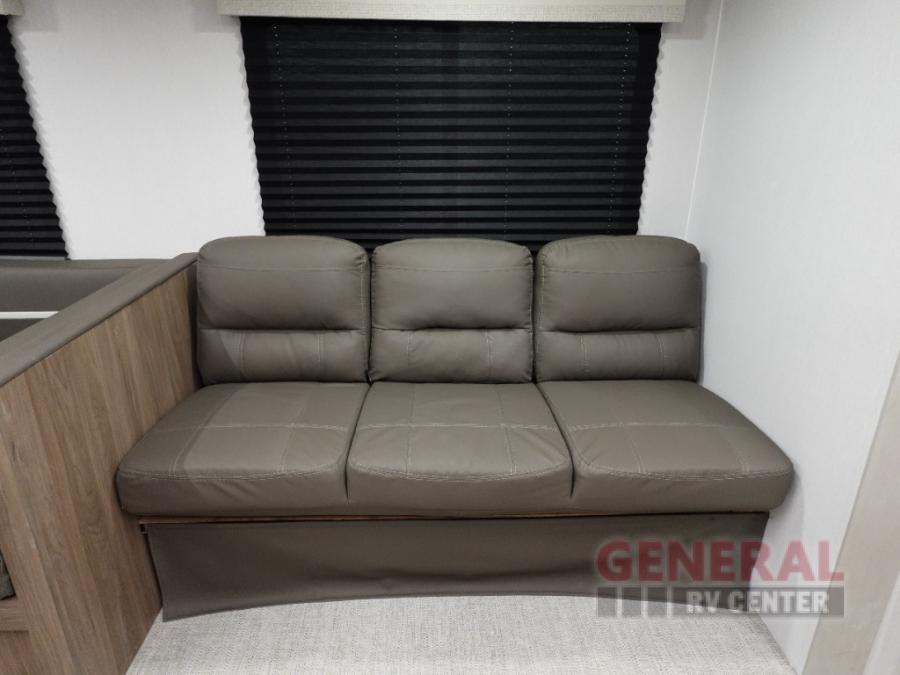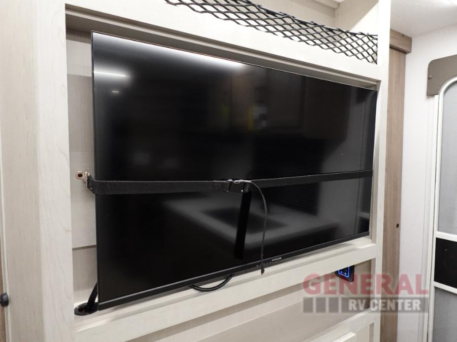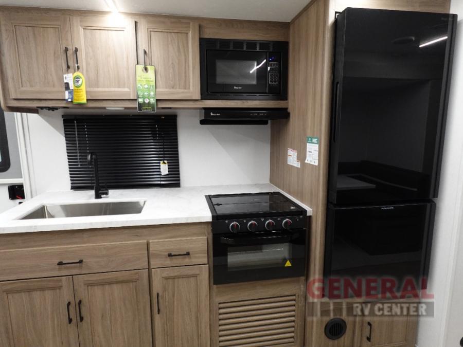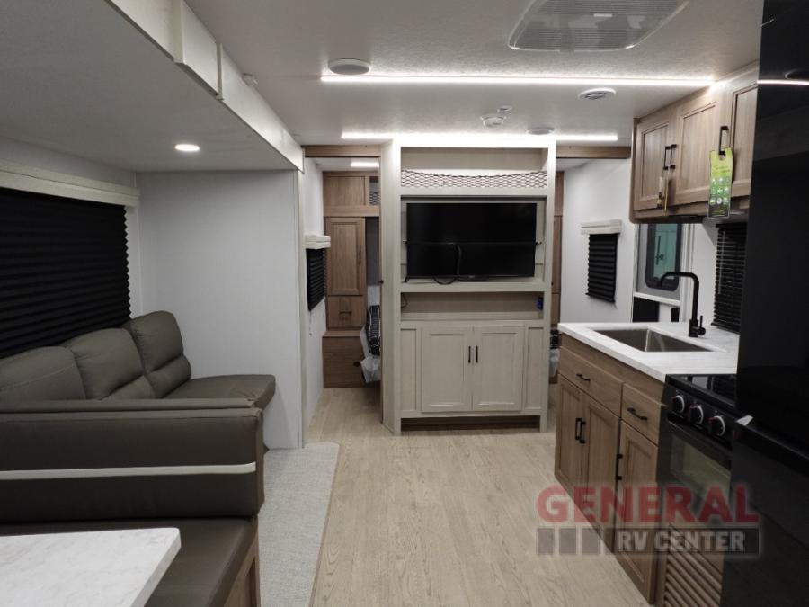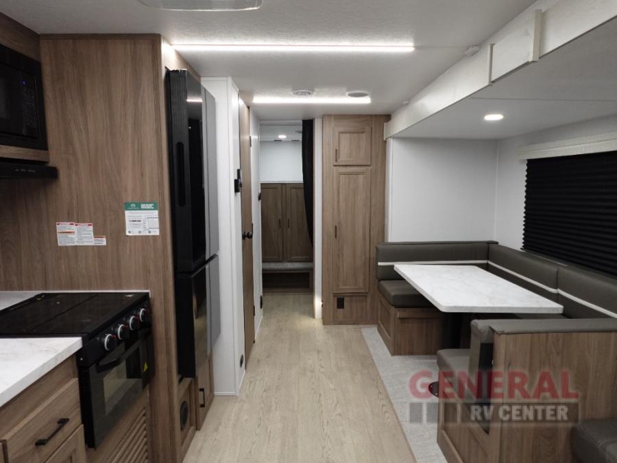 Whole-family fun is waiting for you in this spacious travel trailer. The kids or your guests will love the private bunkhouse with four bunks, plus a wardrobe with a countertop to keep their things. You will enjoy the front private bedroom with a walk-around queen bed and dual wardrobes, and if you have any other guests, they can sleep on the sofa or U-shaped dinette within the large slide out. The kitchen includes everything needed to prepare meals each day, including a microwave, a dual-burner cooktop, and a double door refrigerator. This model also includes a pass-through storage, plus additional exterior storage to bring along hiking gear, fishing poles, and camp chairs!