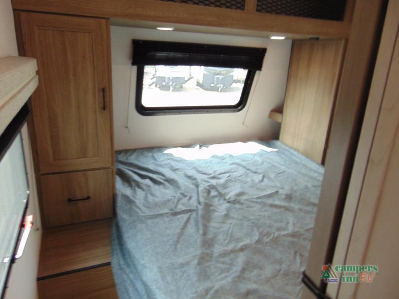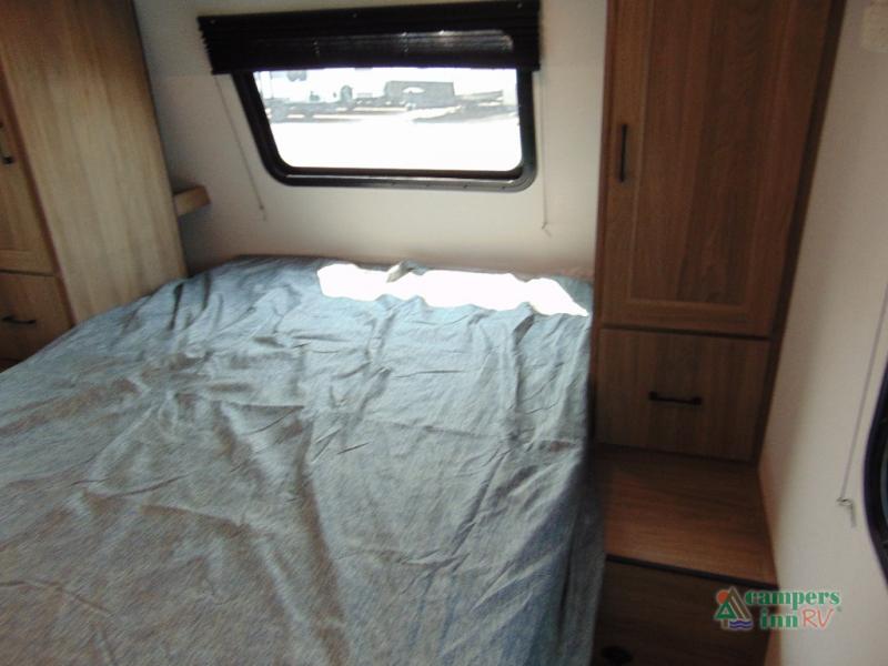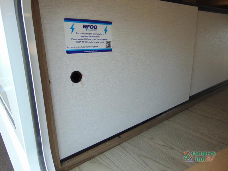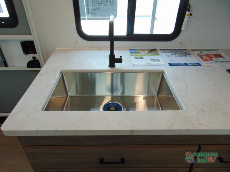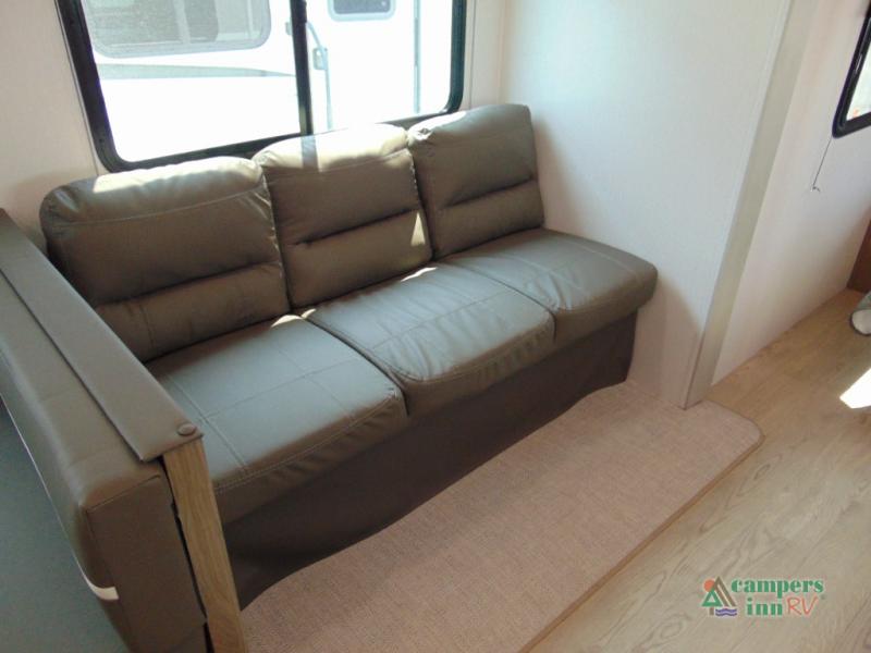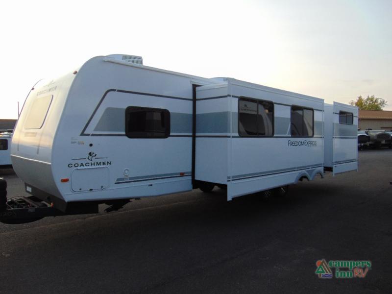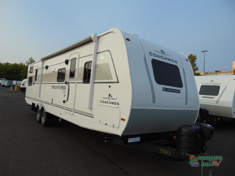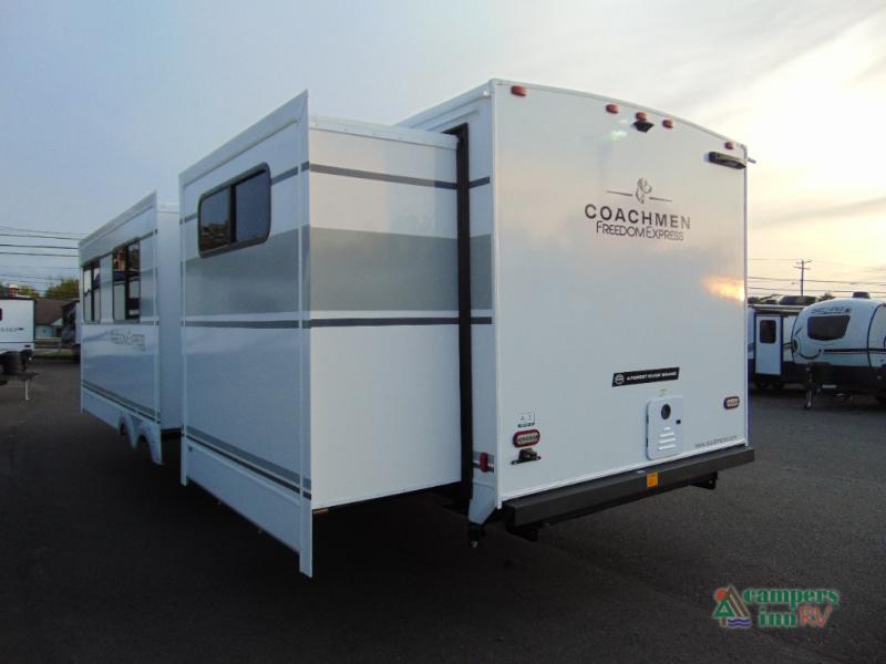 With any Freedom Express Select travel trailer by Coachmen you will find an alumicage construction and vacuum bonded walls with Azdel composite for a trailer made to last. These Select value models come standard with a Bluetooth interior speaker, night shades, and wear-resistant vinyl flooring throughout. You will appreciate the power tongue jack, as well as the Tufflex PVC roof and heated and enclosed underbelly to extend your camping season. A 15K BTU roof A/C will keep you comfortable, and the tankless water heater will provide endless hot showers!