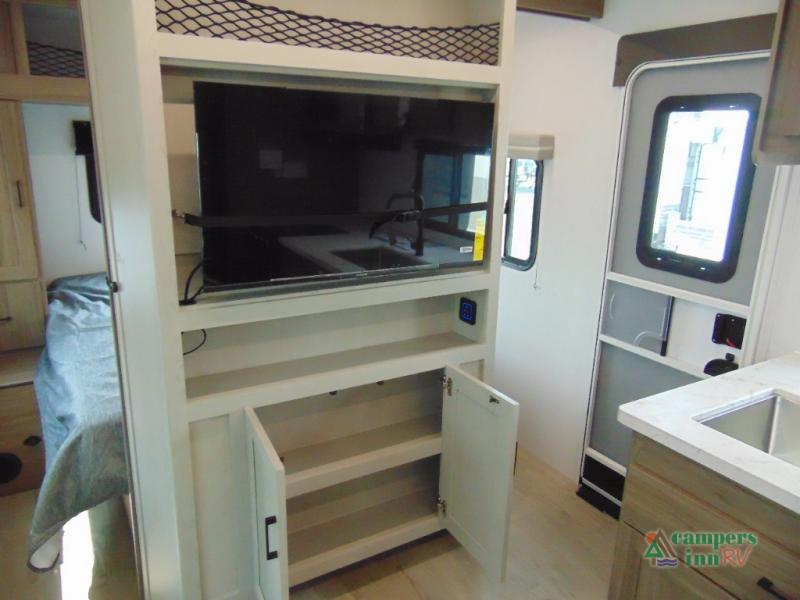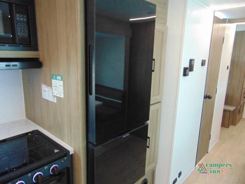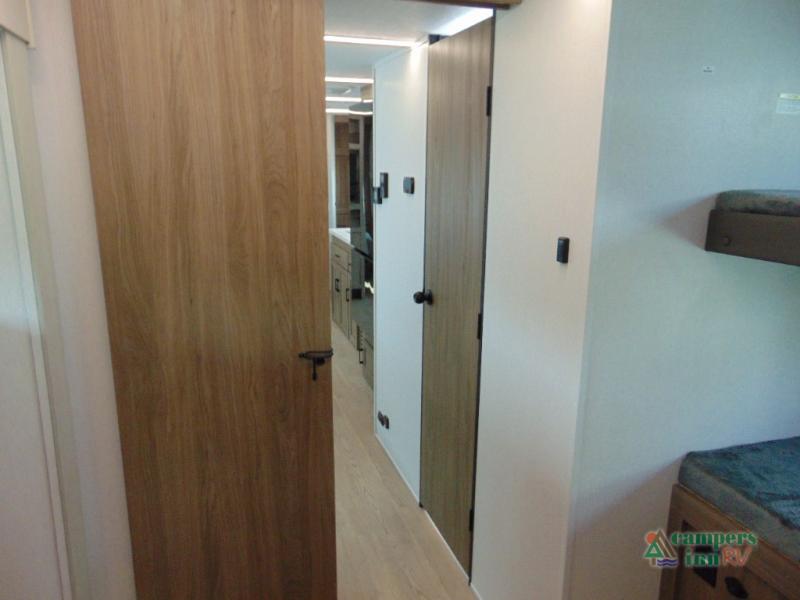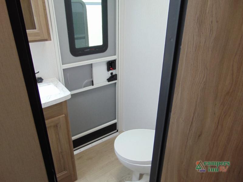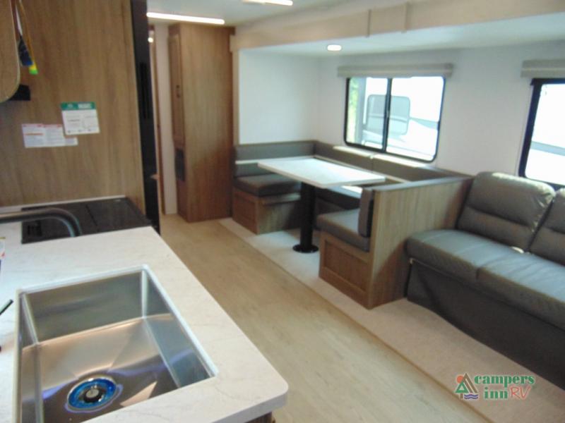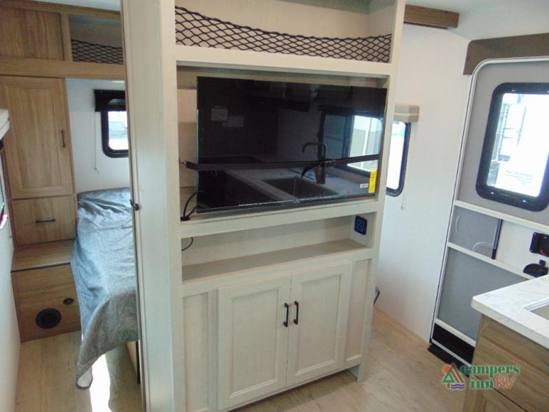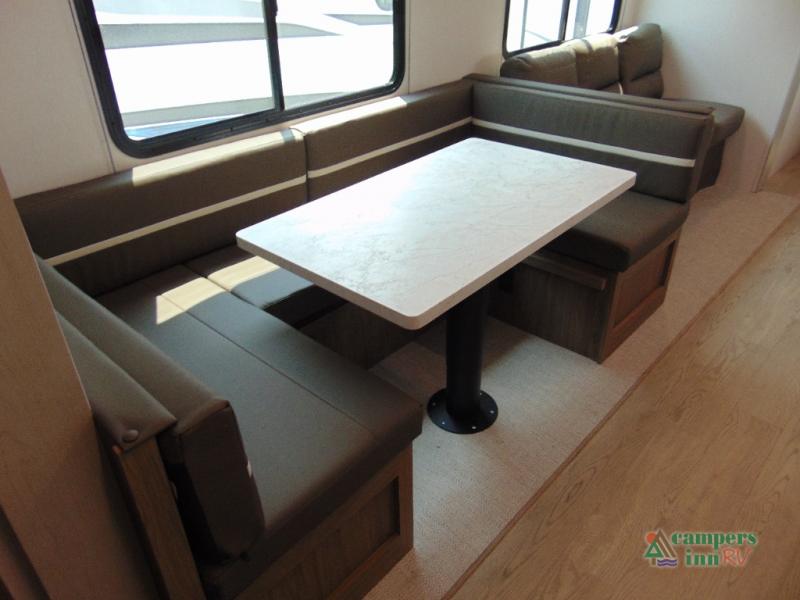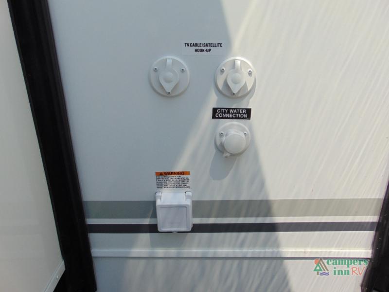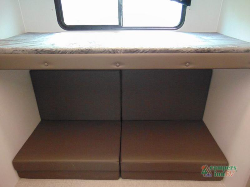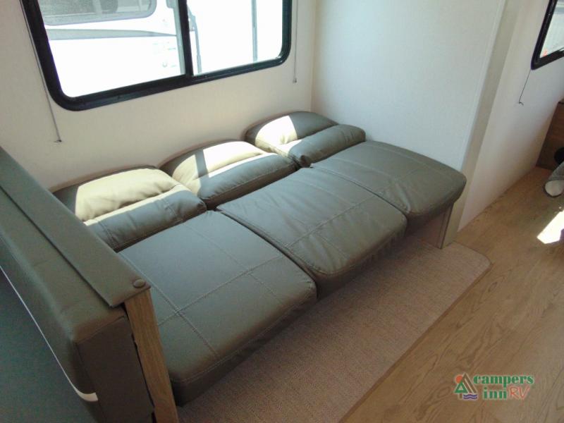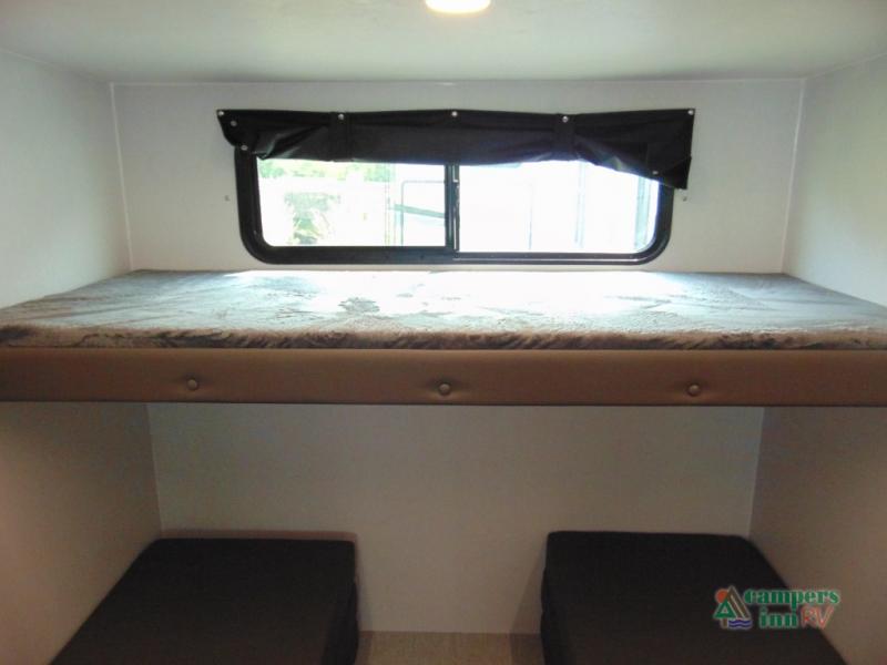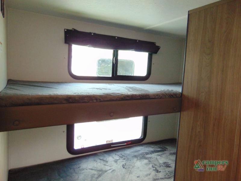 Head to your local state park for fun camping trips in this dual entry travel trailer. The rear private bunkhouse includes four bunks, plus a slide out for more space. The full bath is right next to the bunkhouse for convenience, plus it includes its own exterior entry door so you can quickly get in and get back out to the fun. Everyone can gather around the U-shaped dinette for meal times or game night, and the 32" TV will be perfect for those rainy days. This model also includes a dual-burner cooktop and a microwave oven indoors, plus a pull-out camp kitchen outdoors the chef of the group is sure to love!