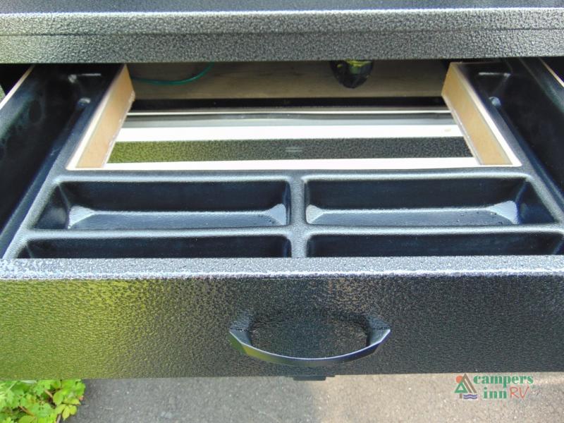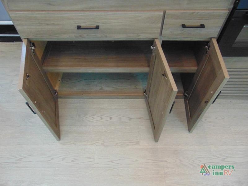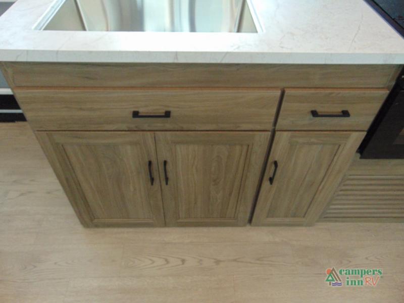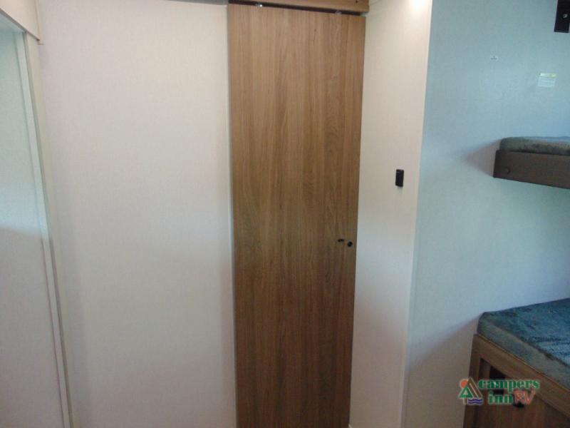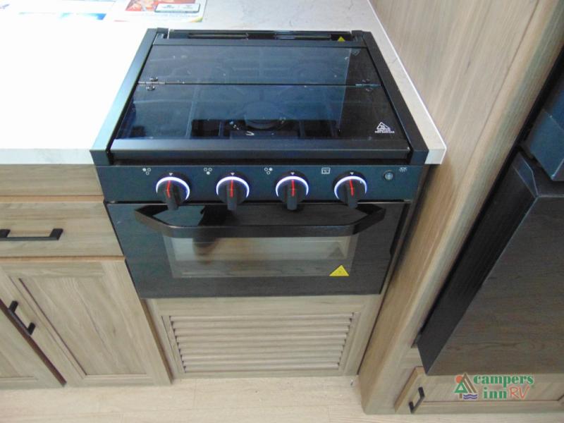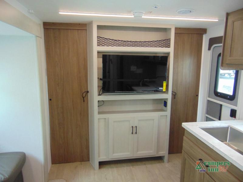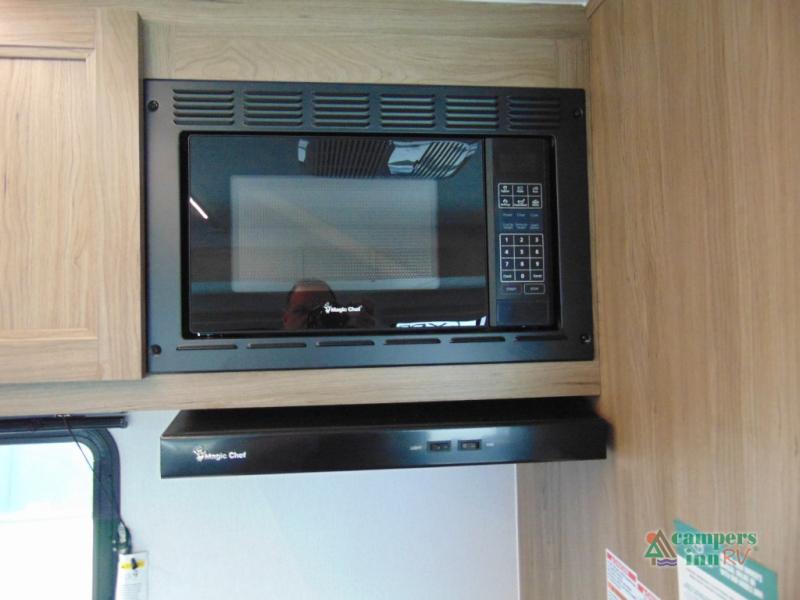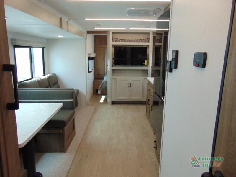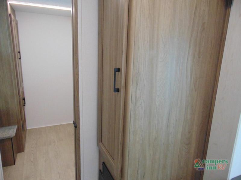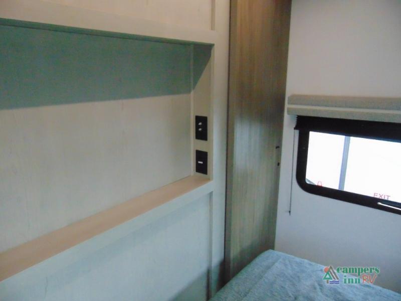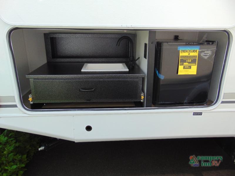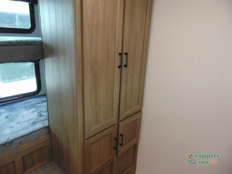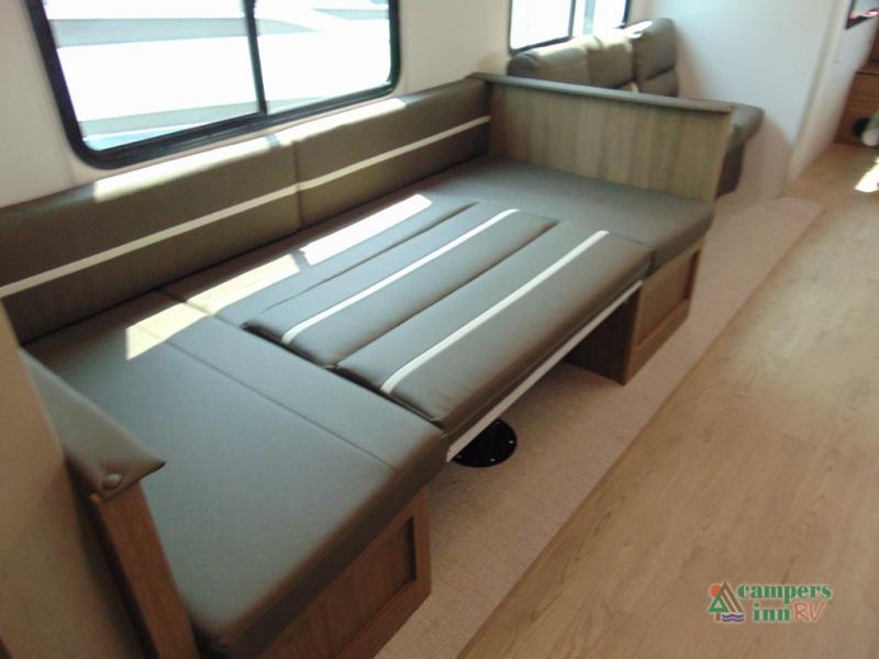 Head to your local state park for fun camping trips in this dual entry travel trailer. The rear private bunkhouse includes four bunks, plus a slide out for more space. The full bath is right next to the bunkhouse for convenience, plus it includes its own exterior entry door so you can quickly get in and get back out to the fun. Everyone can gather around the U-shaped dinette for meal times or game night, and the 32" TV will be perfect for those rainy days. This model also includes a dual-burner cooktop and a microwave oven indoors, plus a pull-out camp kitchen outdoors the chef of the group is sure to love!