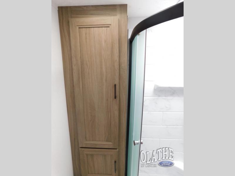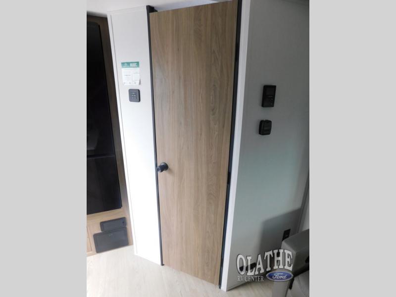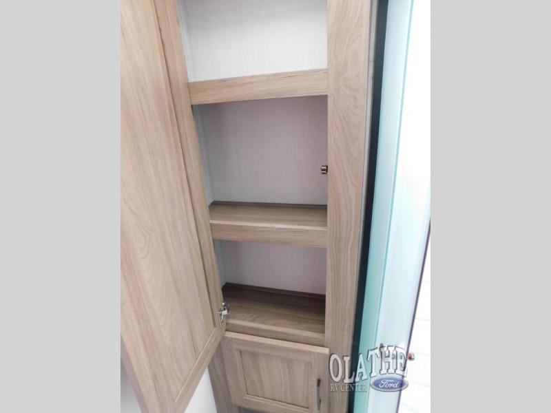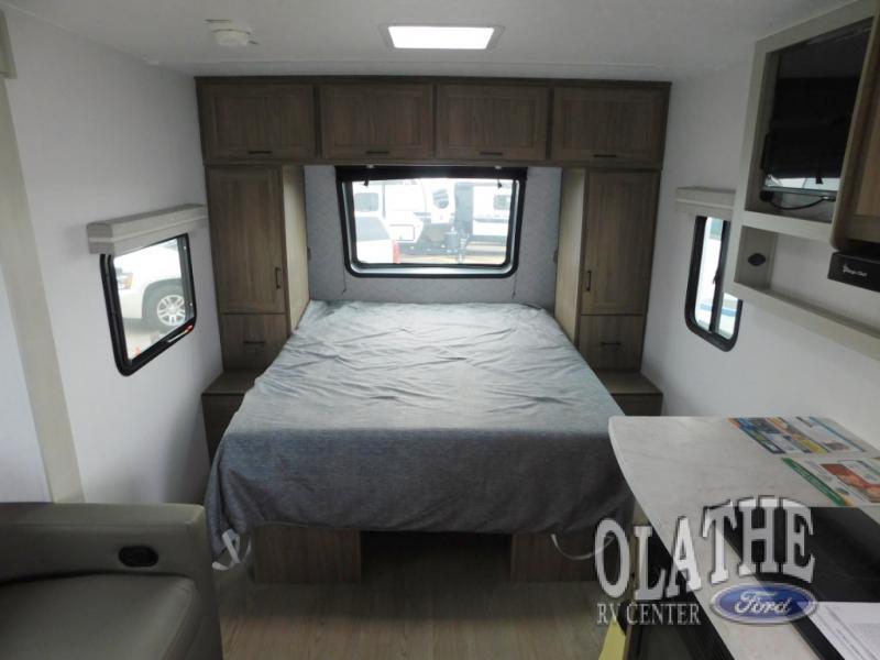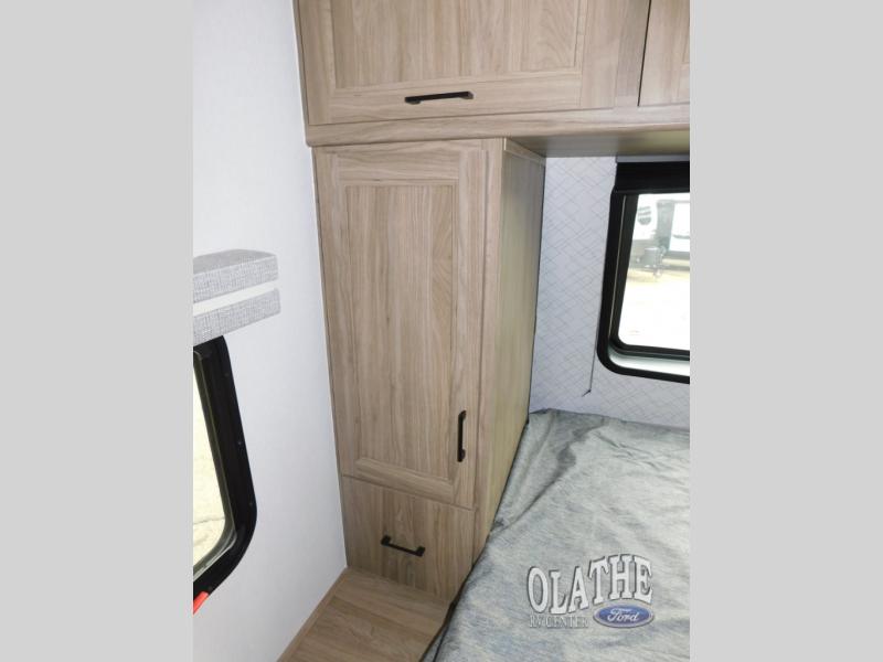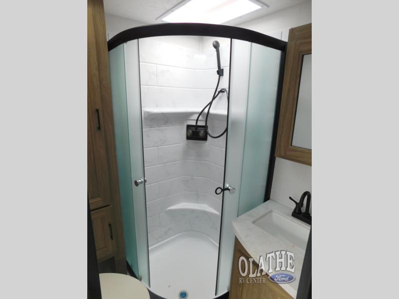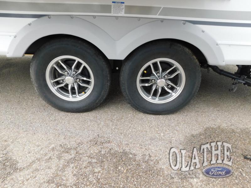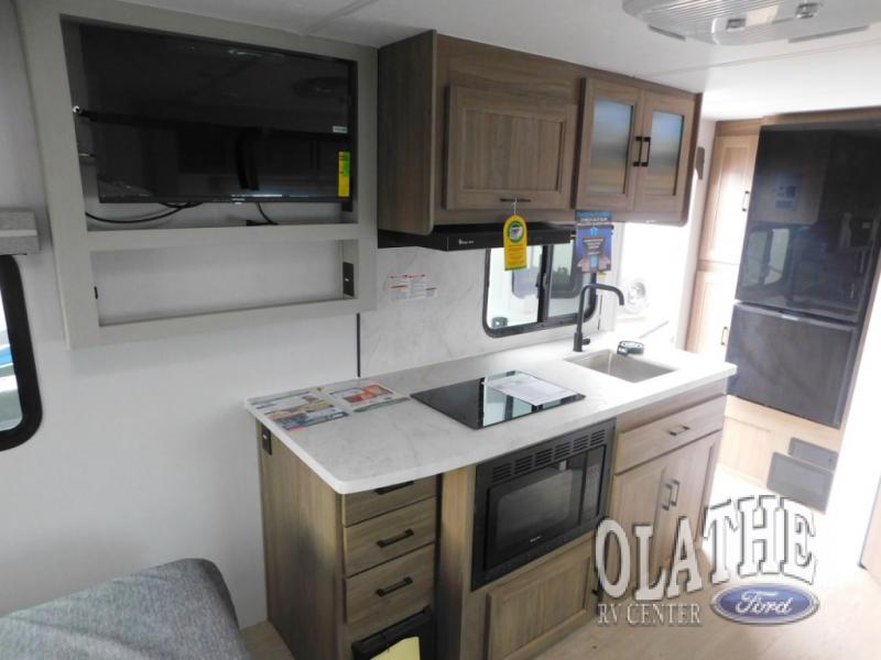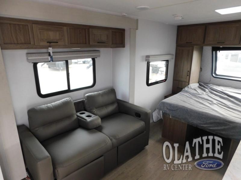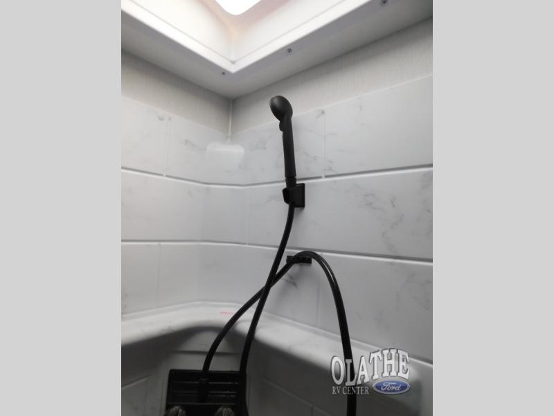 This is the perfect couple's trailer to take to the lake every other weekend. You will enjoy your own queen bed up front that includes vaulted under-bed storage for your luggage. The sofa slide out with a free-standing table provides a place to relax and dine together, and if you have an overnight guest, they can sleep here. The chef can prepare meals on the three burner cooktop or in the microwave oven, and there is a stainless steel sink for easy clean up. This model also includes a full bath with a linen closet for clean towels, and a 32" radius shower with a skylight for more standing space.