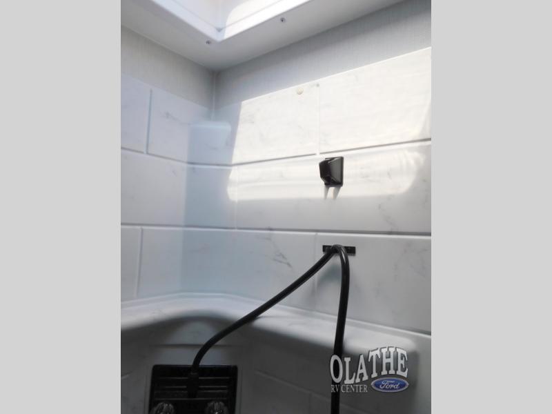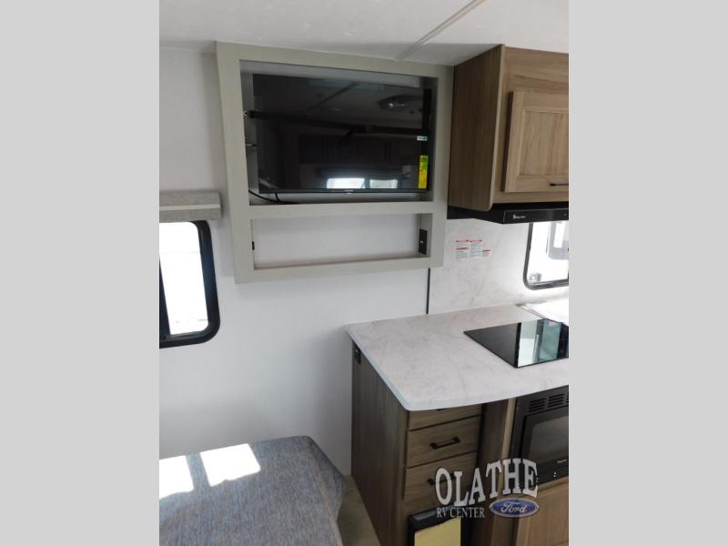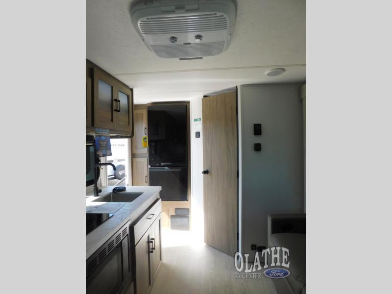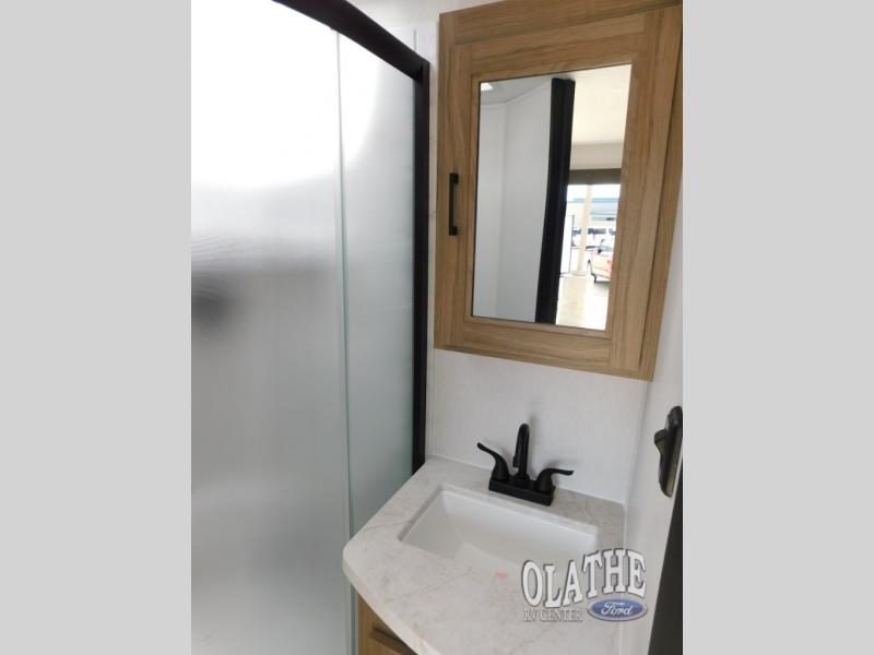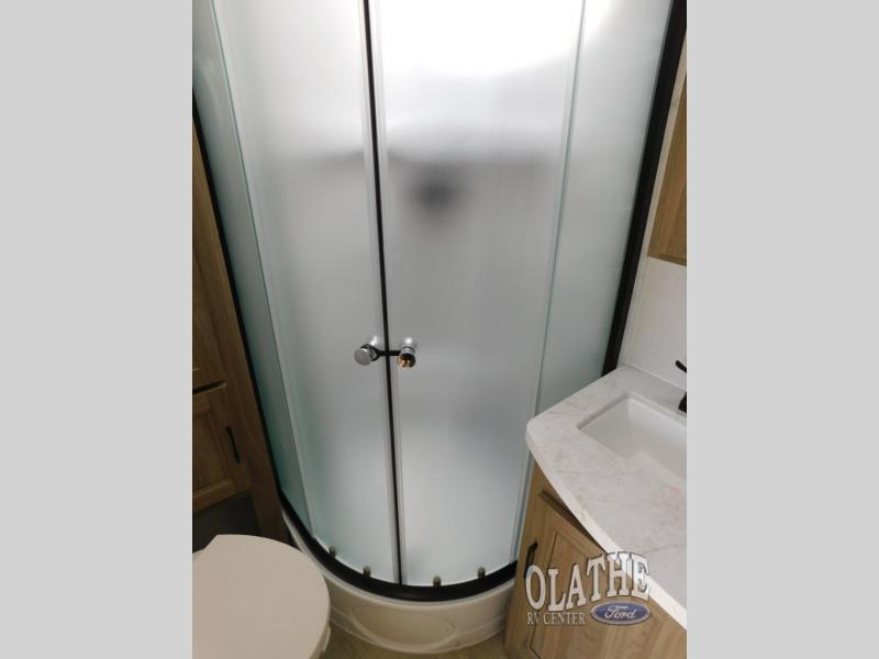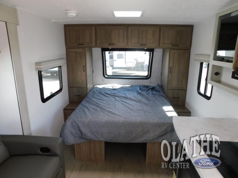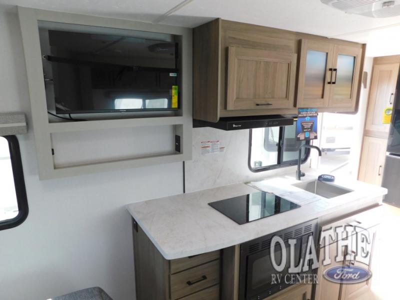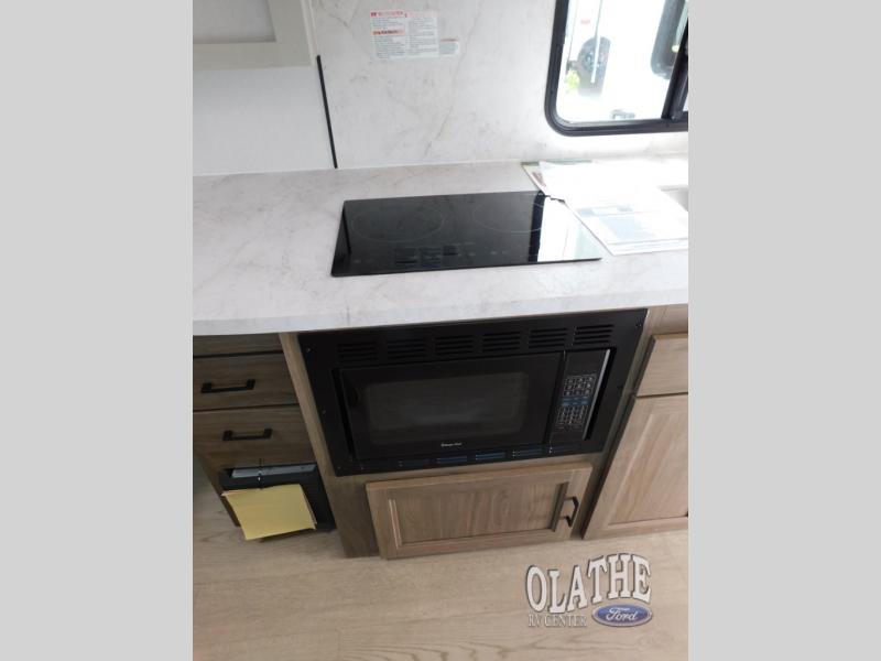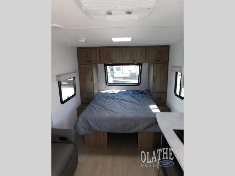 This is the perfect couple's trailer to take to the lake every other weekend. You will enjoy your own queen bed up front that includes vaulted under-bed storage for your luggage. The sofa slide out with a free-standing table provides a place to relax and dine together, and if you have an overnight guest, they can sleep here. The chef can prepare meals on the three burner cooktop or in the microwave oven, and there is a stainless steel sink for easy clean up. This model also includes a full bath with a linen closet for clean towels, and a 32" radius shower with a skylight for more standing space.