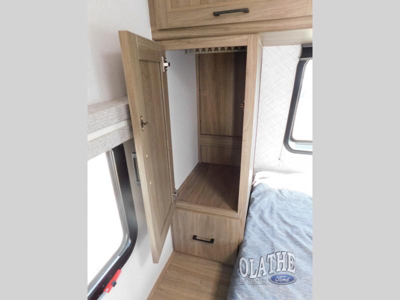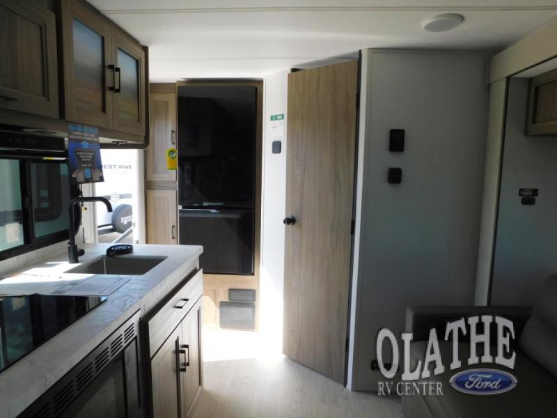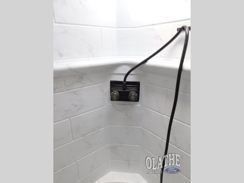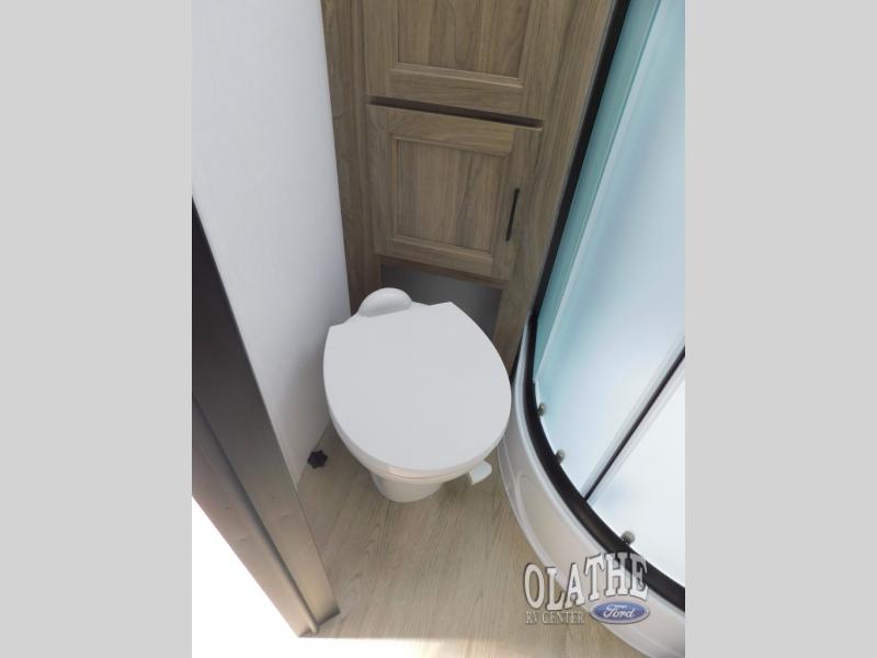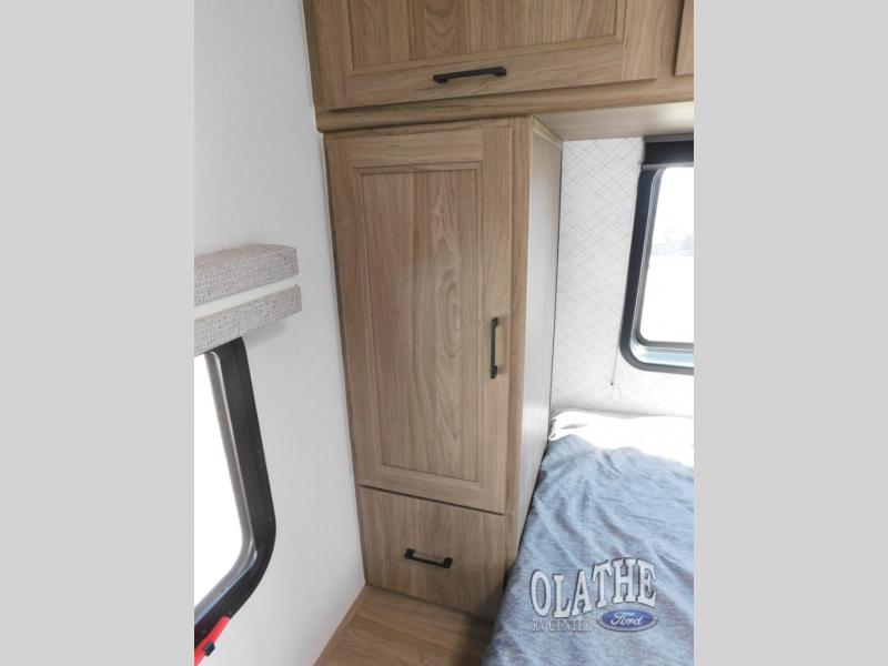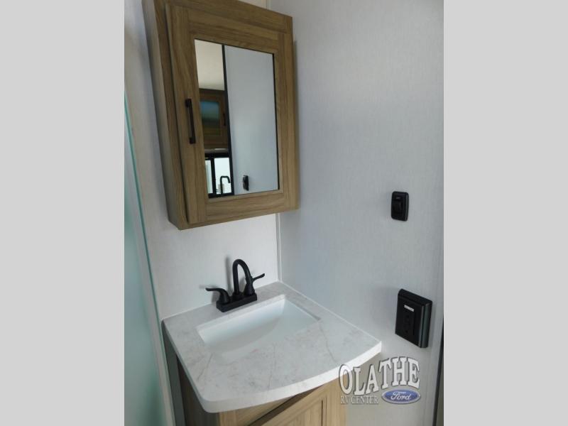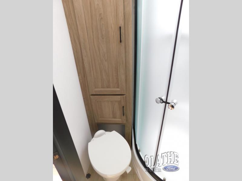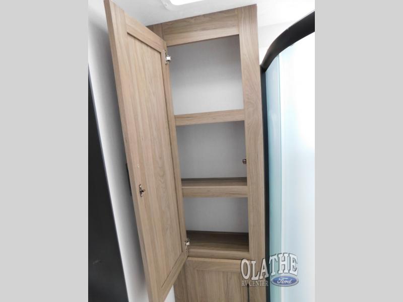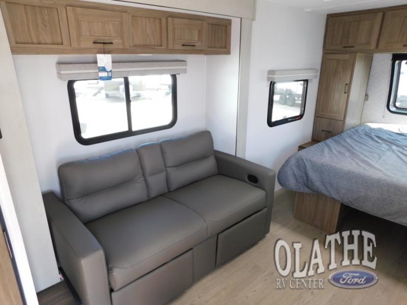 This is the perfect couple's trailer to take to the lake every other weekend. You will enjoy your own queen bed up front that includes vaulted under-bed storage for your luggage. The sofa slide out with a free-standing table provides a place to relax and dine together, and if you have an overnight guest, they can sleep here. The chef can prepare meals on the three burner cooktop or in the microwave oven, and there is a stainless steel sink for easy clean up. This model also includes a full bath with a linen closet for clean towels, and a 32" radius shower with a skylight for more standing space.