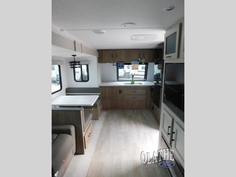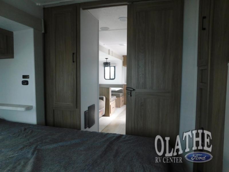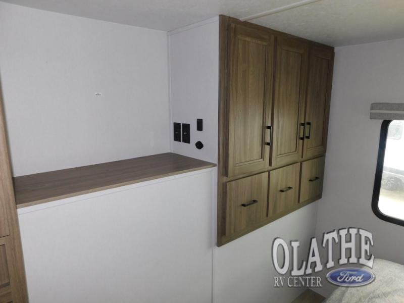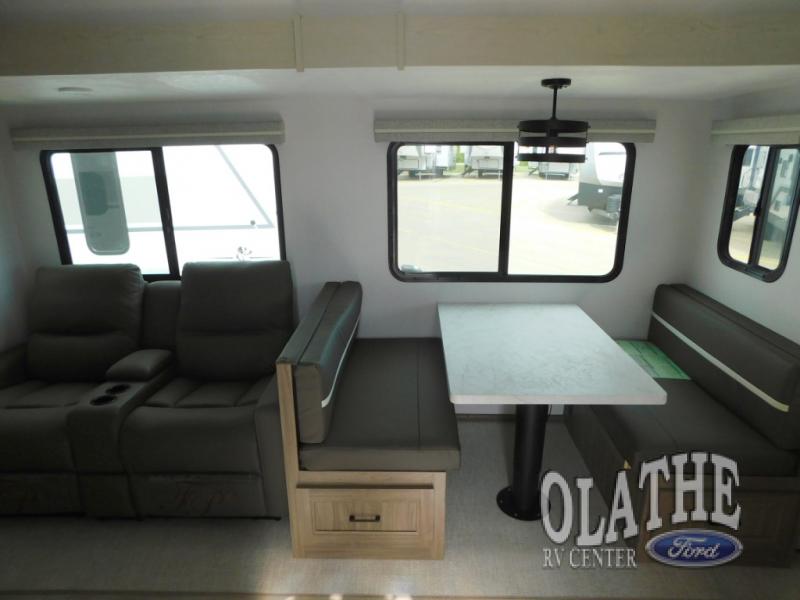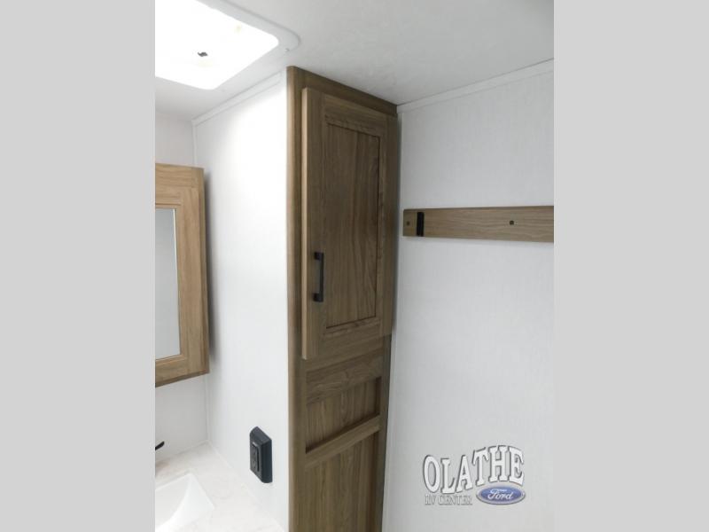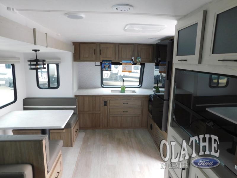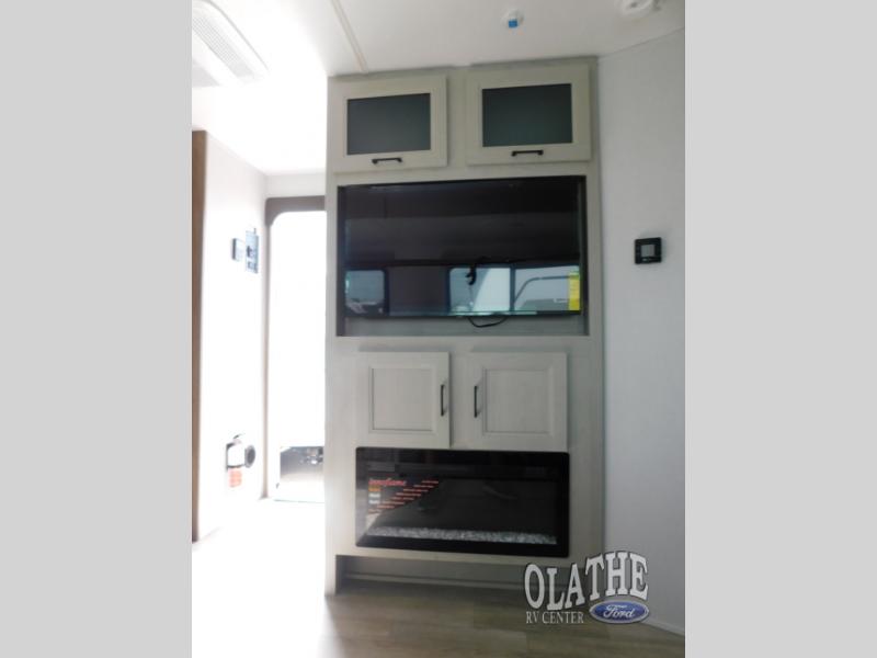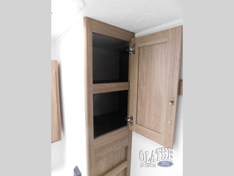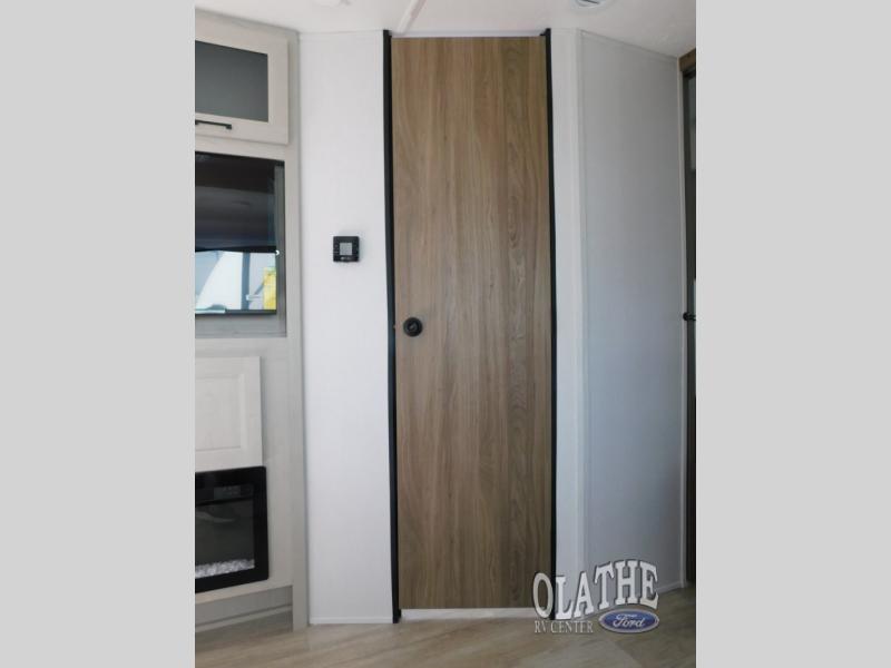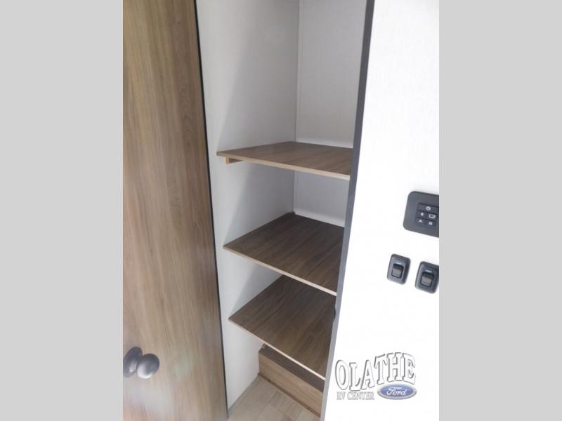 Comfort comes easy in this front kitchen travel trailer for four! You will love the rear master bedroom with its king bed slide out, spacious wardrobe, and a private entrance into the dual entry bath. There is a sofa that sits directly across from the fireplace and entertainment center, or you can choose the optional theater seat or optional hide-a-bed sofa in place of the standard sofa. The front kitchen features tons of counter space, an 8 cu. ft. double door refrigerator, plus a large pantry for dry good and snacks. There is also a pantry/closet just as you enter the trailer that will be perfect for shoes and jackets!