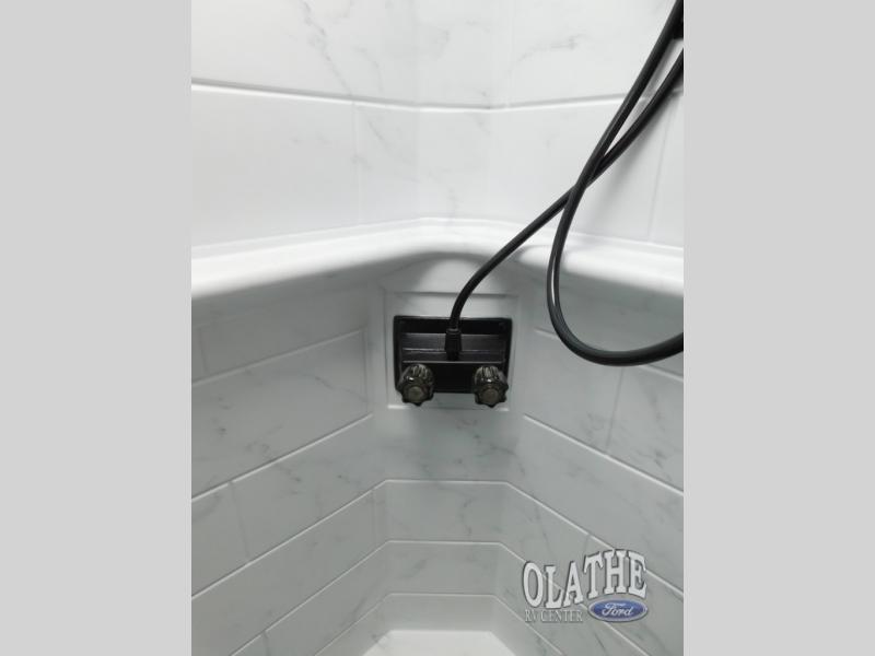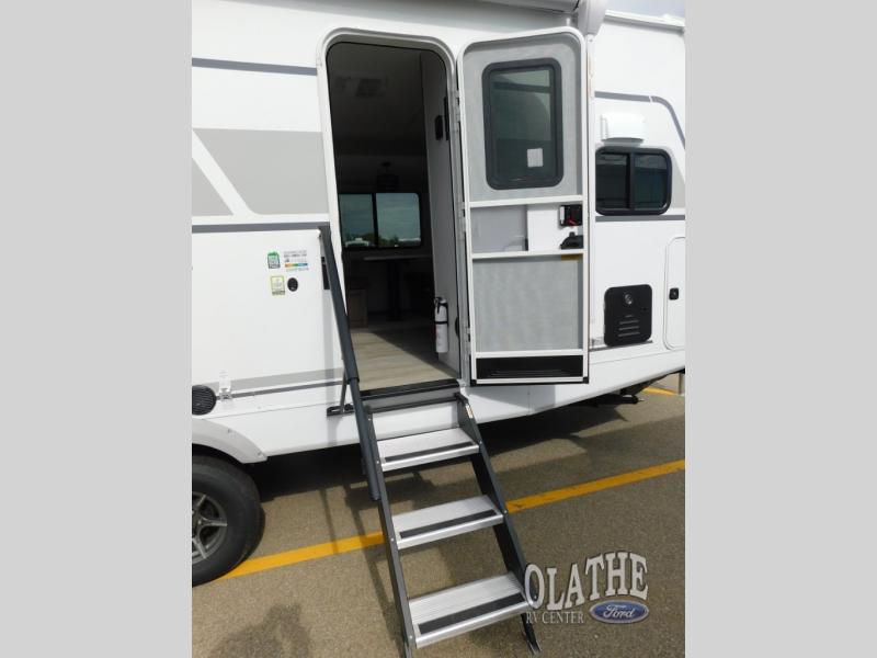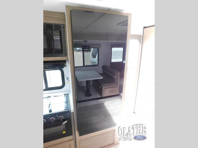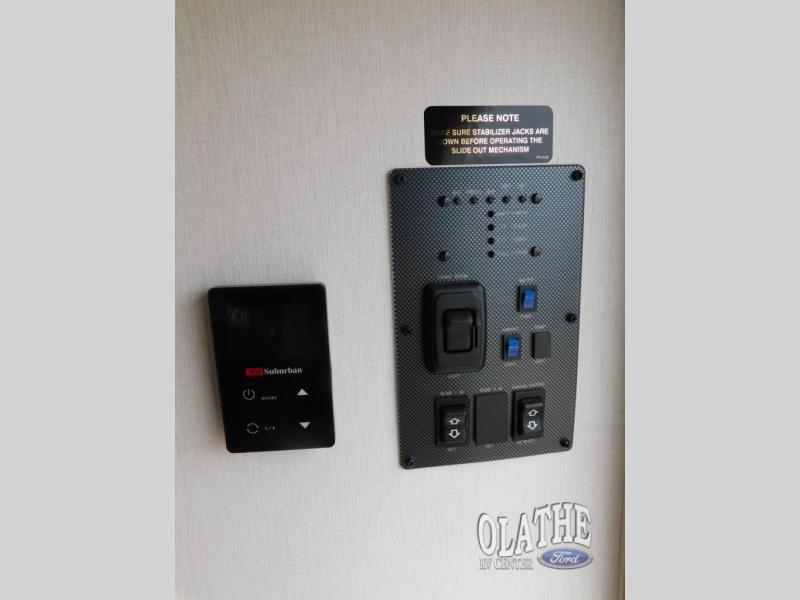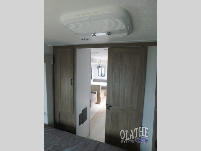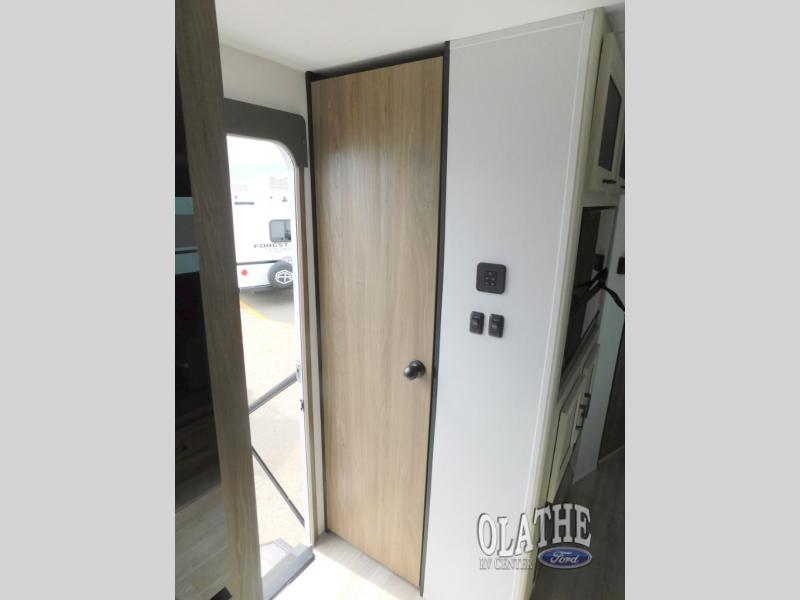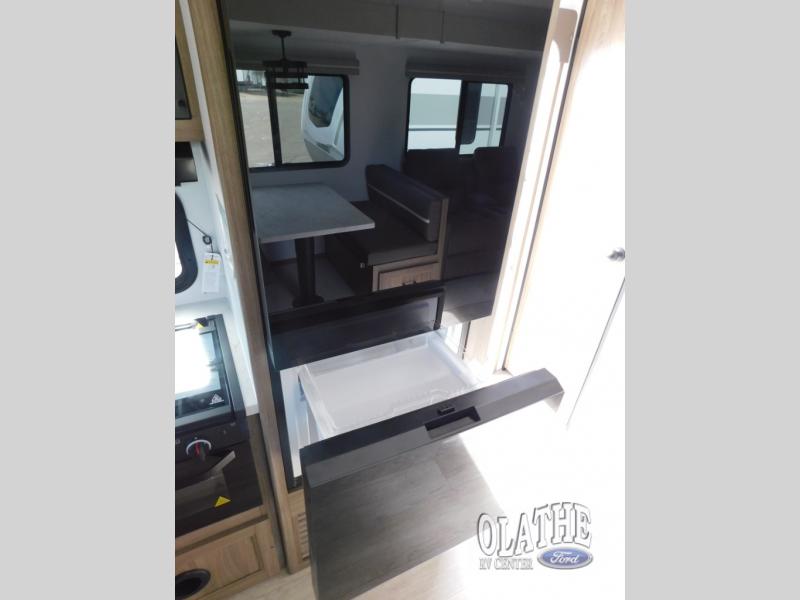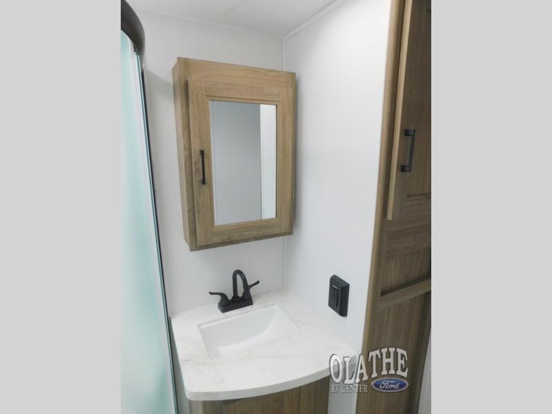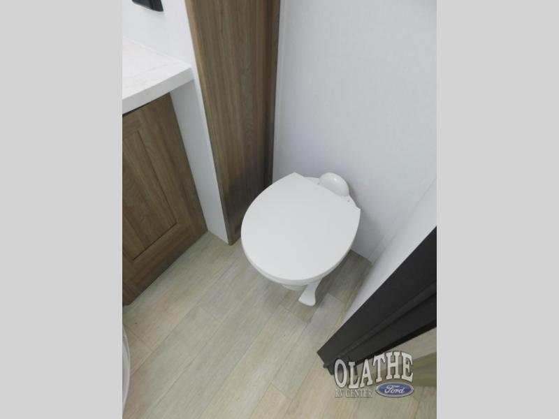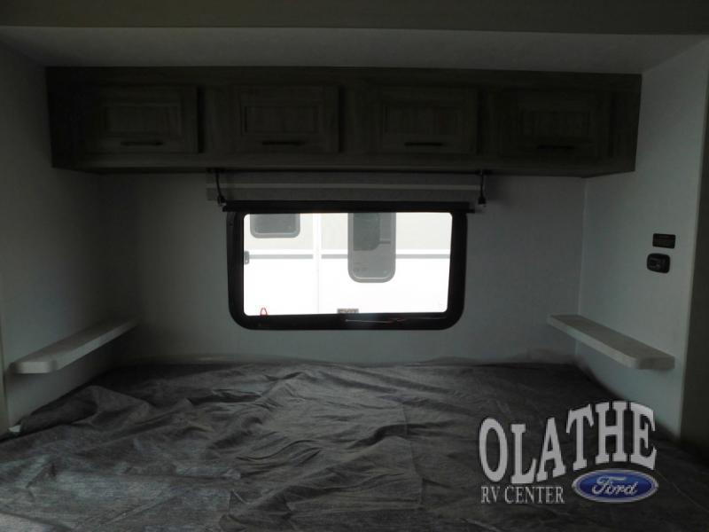 Comfort comes easy in this front kitchen travel trailer for four! You will love the rear master bedroom with its king bed slide out, spacious wardrobe, and a private entrance into the dual entry bath. There is a sofa that sits directly across from the fireplace and entertainment center, or you can choose the optional theater seat or optional hide-a-bed sofa in place of the standard sofa. The front kitchen features tons of counter space, an 8 cu. ft. double door refrigerator, plus a large pantry for dry good and snacks. There is also a pantry/closet just as you enter the trailer that will be perfect for shoes and jackets!