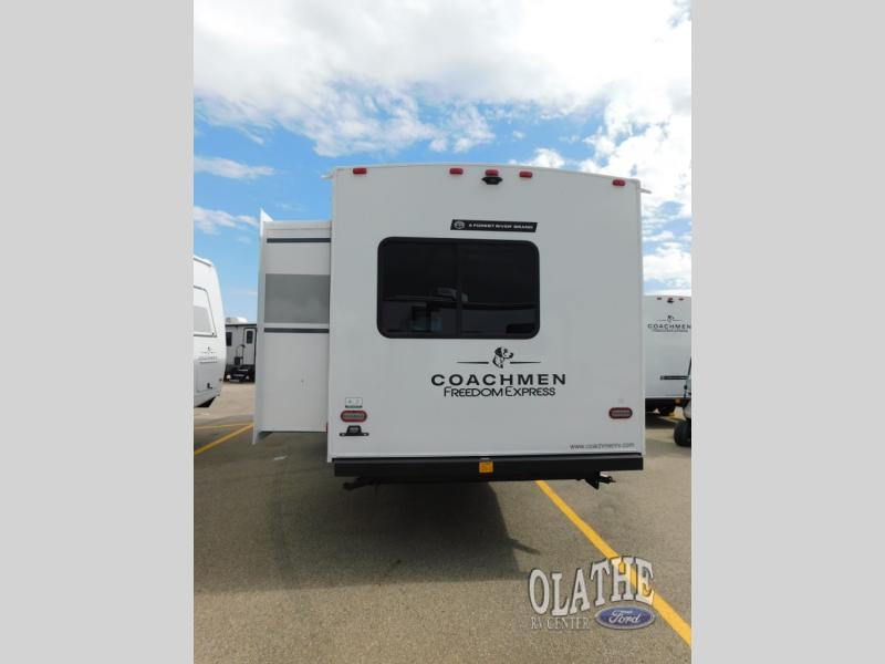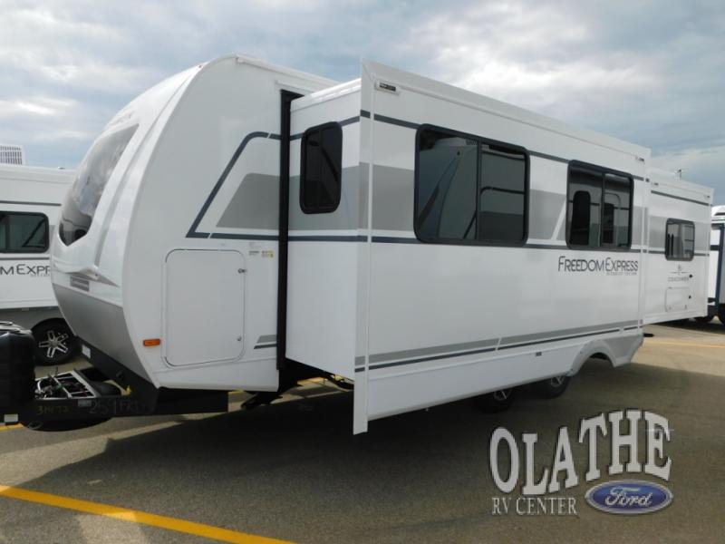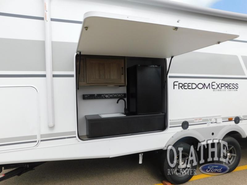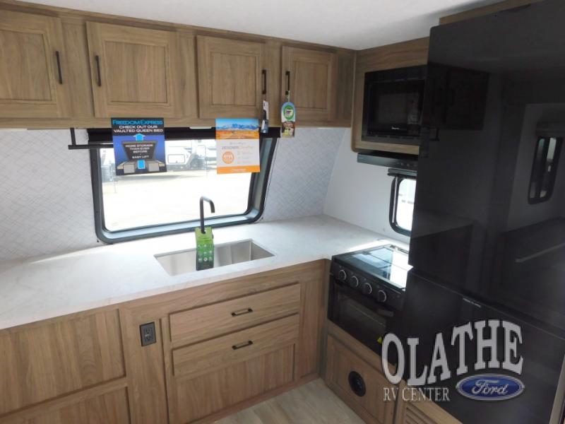 With any Freedom Express Ultra Lite travel trailer by Coachmen you will appreciate quality construction materials, such as vacuum bonded walls with Azdel composite, a 3/4 gel coated fiberglass cap with an automotive glass windshield, and a heated enclosed underbelly. Each model also features Tufflex PVC roofing, front rock guard, and E-Z Lube axles for smooth towing. Inside, you'll find kitchen backsplash, hidden hinge cabinetry, and wear-resistant vinyl flooring throughout. The power tongue jack included with the Ultra Lite Express Package will make set-up a breeze, and each model includes back-up camera prep and they are Freedom solar ready if you plan to go off-grid. Enjoy lightweight camping with a Freedom Express Ultra Lite travel trailer today!