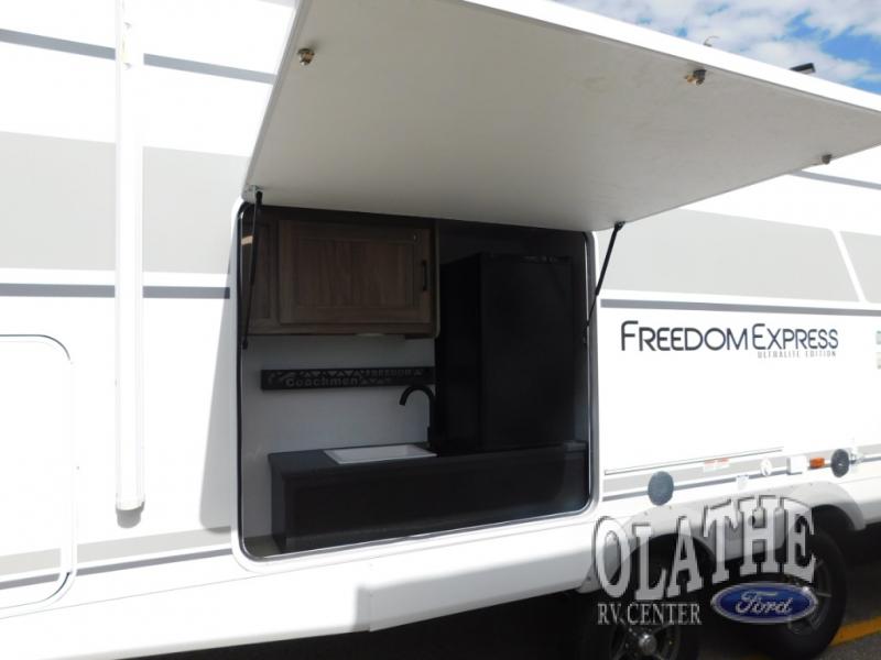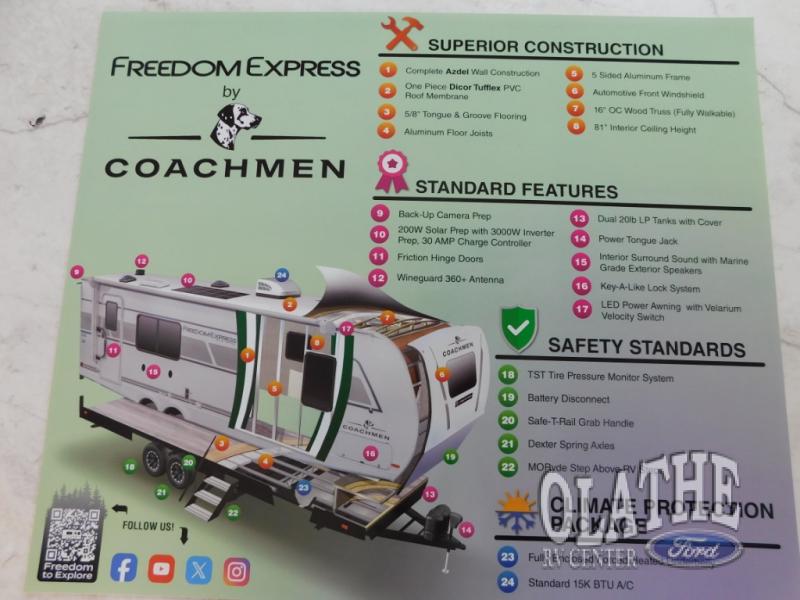 With any Freedom Express Ultra Lite travel trailer by Coachmen you will appreciate quality construction materials, such as vacuum bonded walls with Azdel composite, a 3/4 gel coated fiberglass cap with an automotive glass windshield, and a heated enclosed underbelly. Each model also features Tufflex PVC roofing, front rock guard, and E-Z Lube axles for smooth towing. Inside, you'll find kitchen backsplash, hidden hinge cabinetry, and wear-resistant vinyl flooring throughout. The power tongue jack included with the Ultra Lite Express Package will make set-up a breeze, and each model includes back-up camera prep and they are Freedom solar ready if you plan to go off-grid. Enjoy lightweight camping with a Freedom Express Ultra Lite travel trailer today!