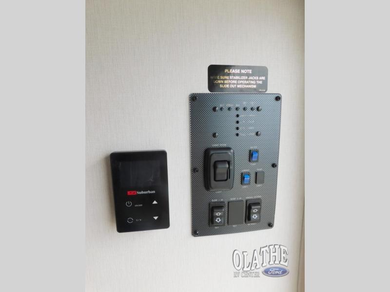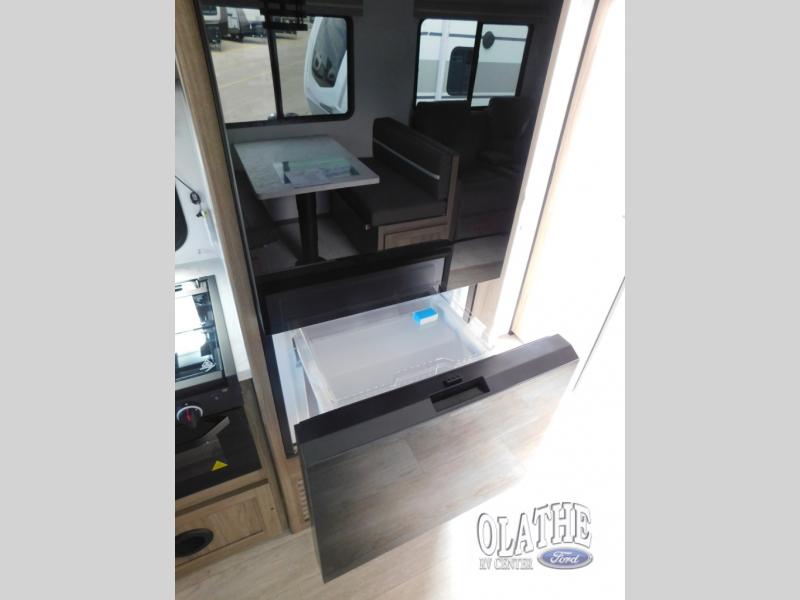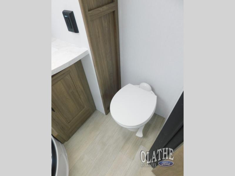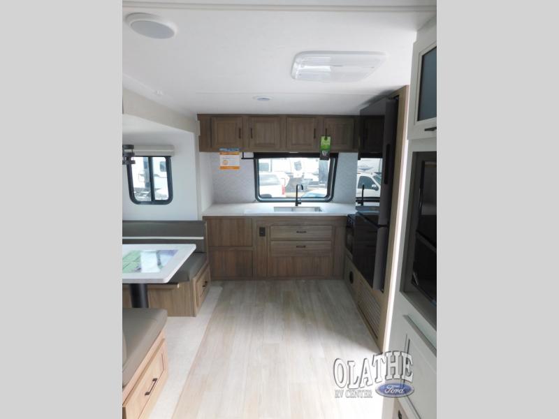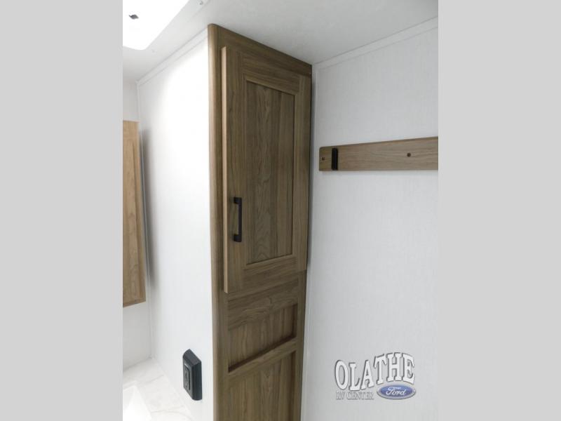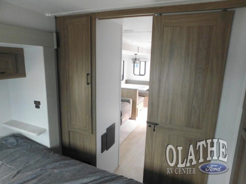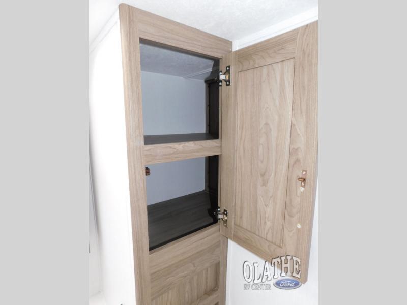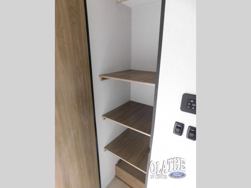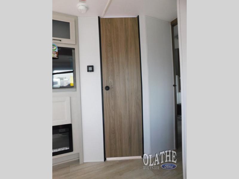 Comfort comes easy in this front kitchen travel trailer for four! You will love the rear master bedroom with its king bed slide out, spacious wardrobe, and a private entrance into the dual entry bath. There is a sofa that sits directly across from the fireplace and entertainment center, or you can choose the optional theater seat or optional hide-a-bed sofa in place of the standard sofa. The front kitchen features tons of counter space, an 8 cu. ft. double door refrigerator, plus a large pantry for dry good and snacks. There is also a pantry/closet just as you enter the trailer that will be perfect for shoes and jackets!