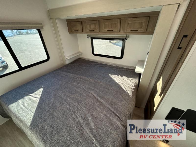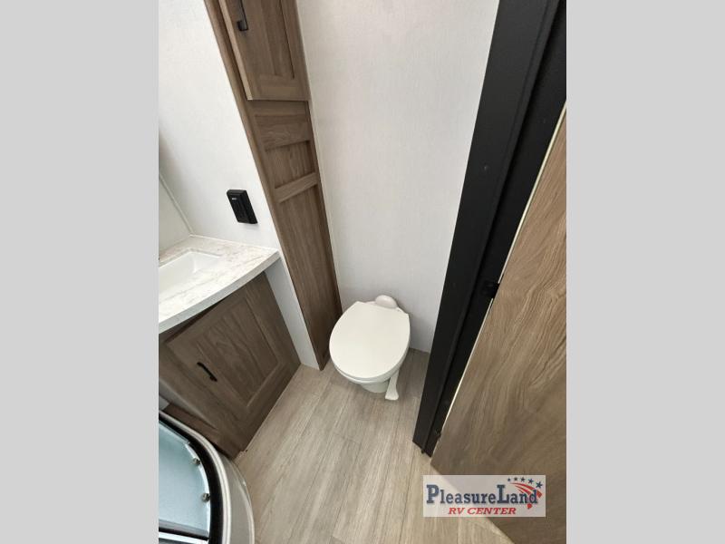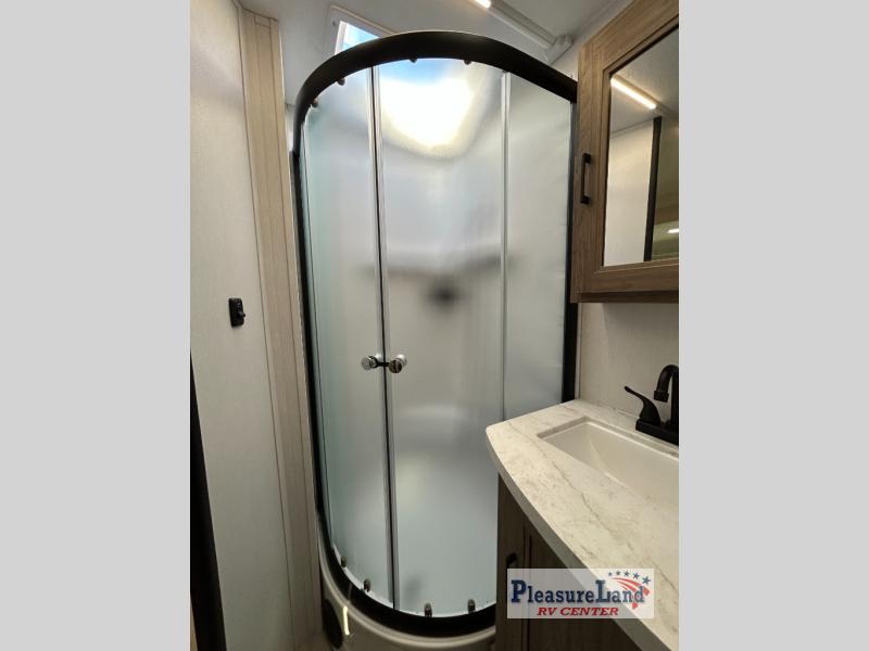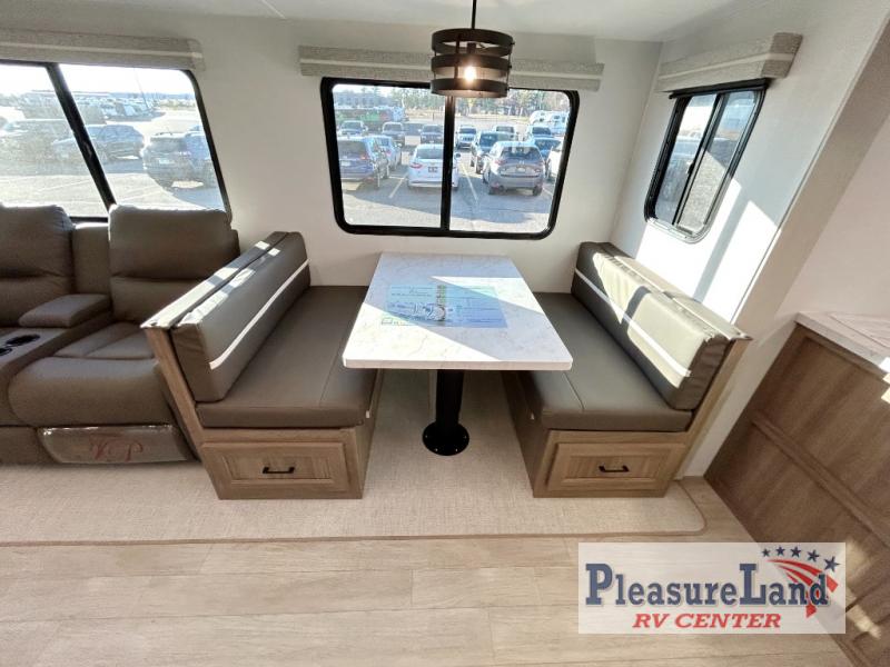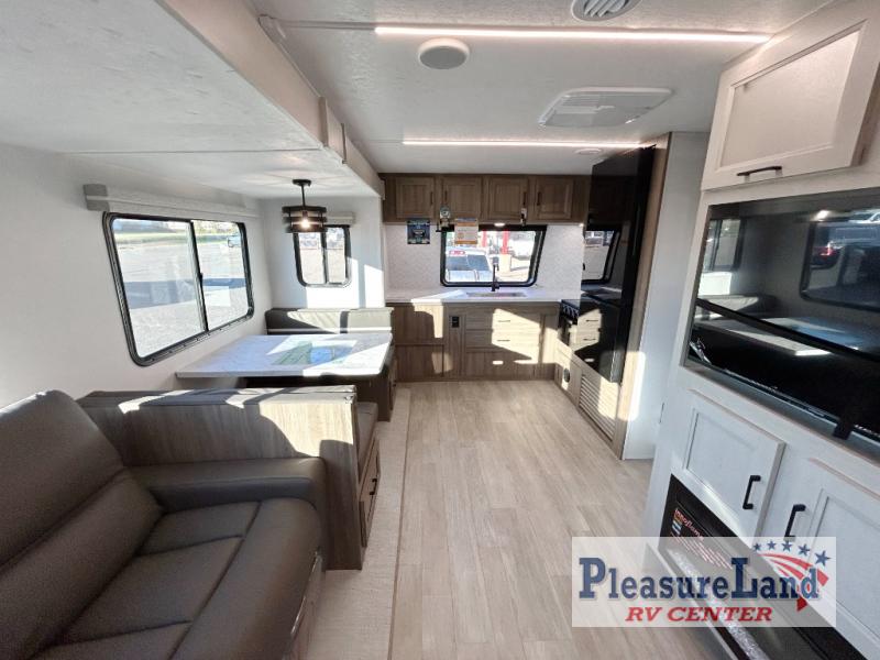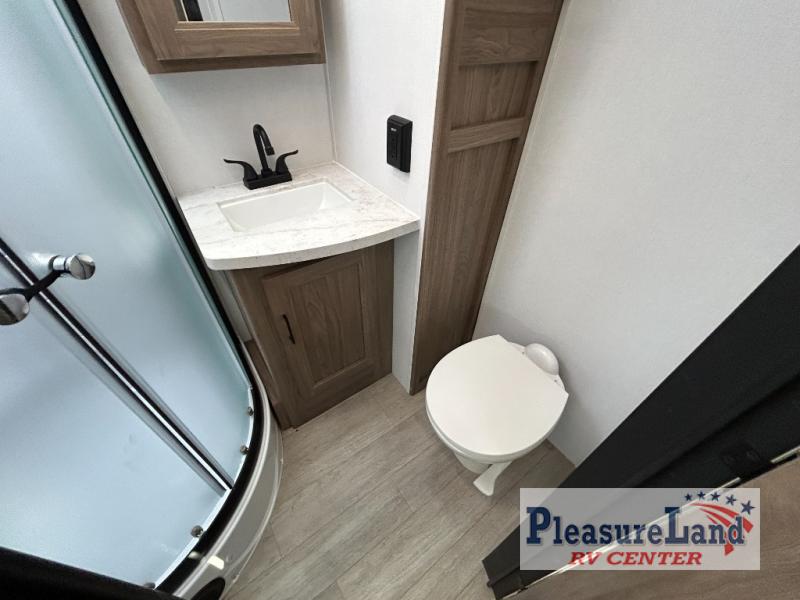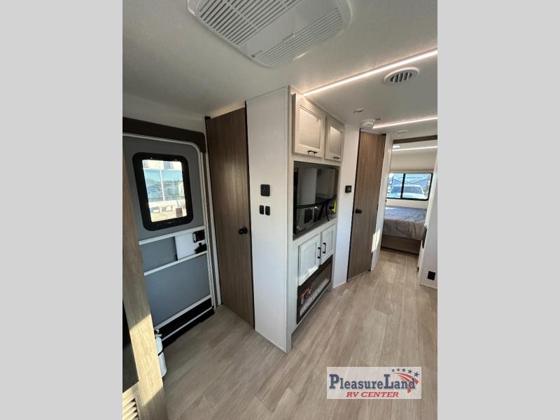 Comfort comes easy in this front kitchen travel trailer for four! You will love the rear master bedroom with its king bed slide out and spacious wardrobe. There is a sofa that sits directly across from the fireplace and entertainment center, or you can choose the optional theater seat or optional hide-a-bed sofa in place of the standard sofa. The front kitchen features tons of counter space, a 10 cu. ft. 12V refrigerator, plus a large pantry for dry good and snacks. There is also a pantry/closet just as you enter the trailer that will be perfect for shoes and jackets!