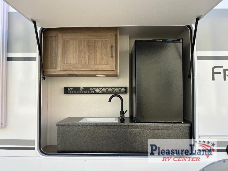 With any Freedom Express Ultra Lite travel trailer by Coachmen you will appreciate quality construction materials, such as vacuum bonded walls with Azdel composite, a 3/4 gel coated fiberglass cap with an automotive glass windshield, and a heated enclosed underbelly. Each model also features Tufflex PVC roofing, front rock guard, and E-Z Lube axles for smooth towing. Inside, you'll find kitchen backsplash, hidden hinge cabinetry, and wear-resistant vinyl flooring throughout. The power tongue jack included with the Ultra Lite Express Package will make set-up a breeze, and each model includes back-up camera prep and they are Freedom solar ready if you plan to go off-grid. Enjoy lightweight camping with a Freedom Express Ultra Lite travel trailer today!
