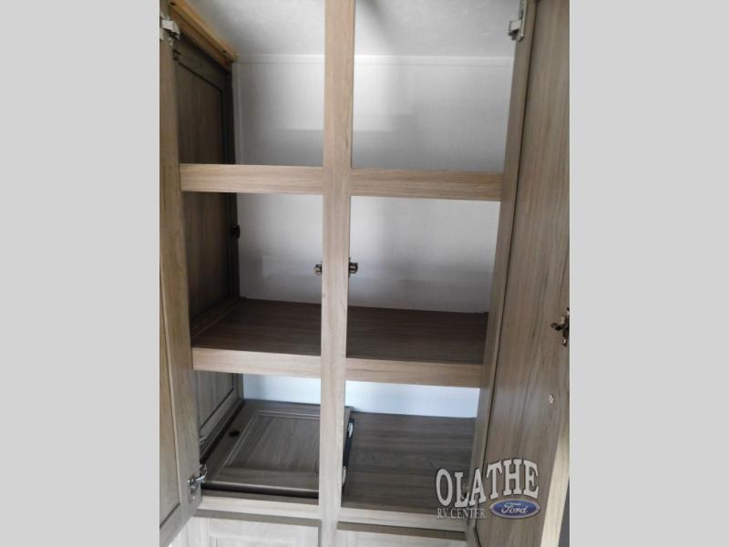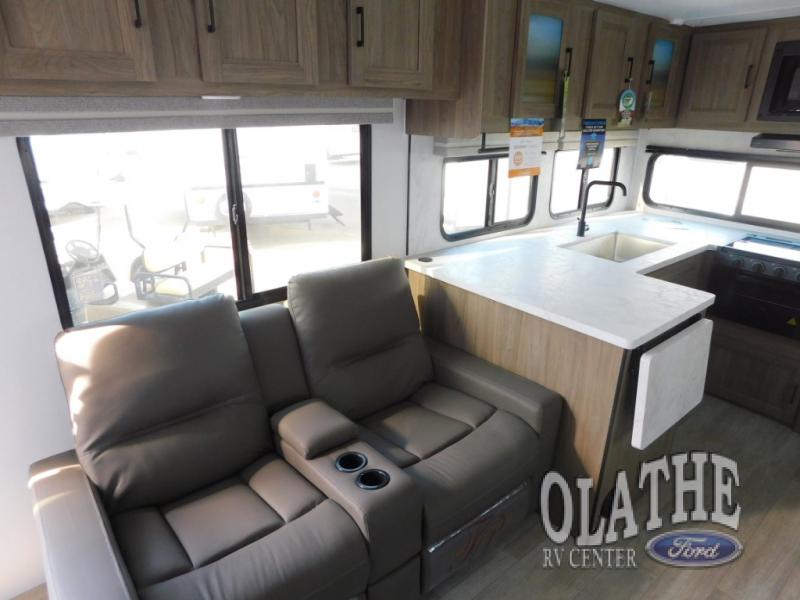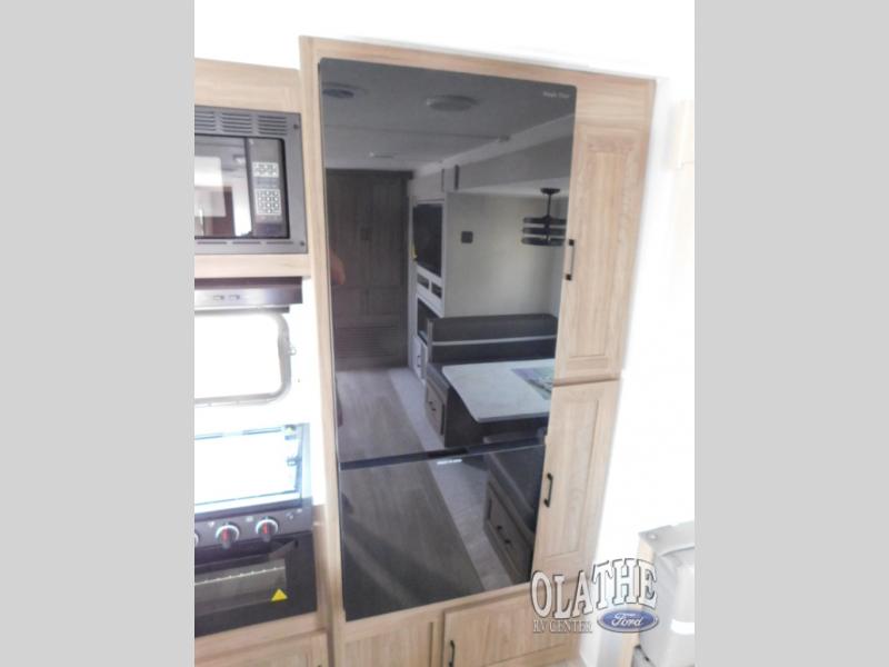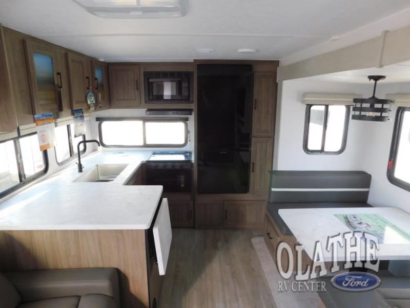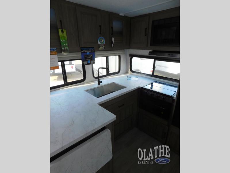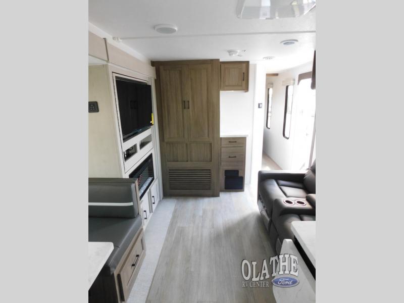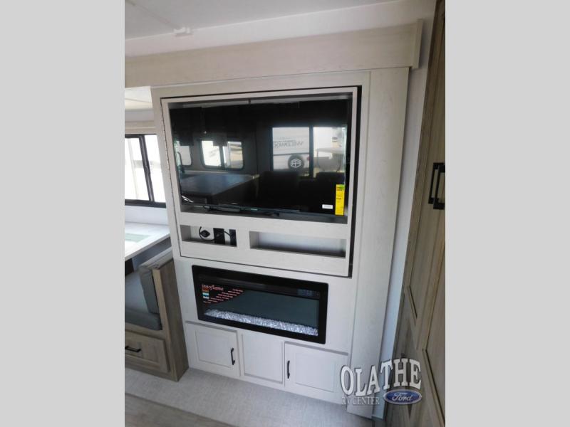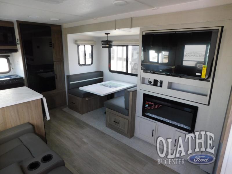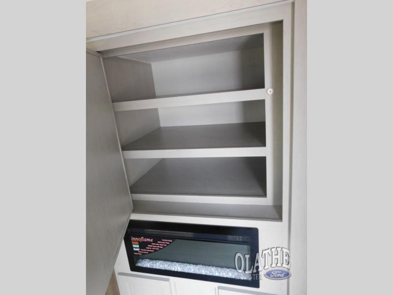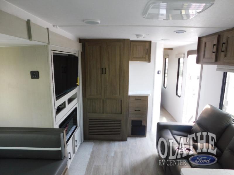 Are you looking for a travel trailer that will feel more like home? Look no further than this model that features a private bedroom up front, a full bath, plus a spacious rear kitchen. You will love to relax on the theatre sofa/hide-a-bed sofa across from the Smart TV and fireplace, and there is a booth dinette for dining. This model also includes a hidden pantry behind the TV for smart storage solutions. If the weather is nice you may just want to sit outdoors under the 18' power awning with LED lights. The chef of your group can prepare a meal on the pull-out camp kitchen, and the kids can grab their scooters from the pass-through storage.