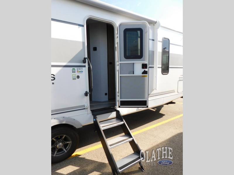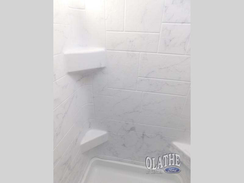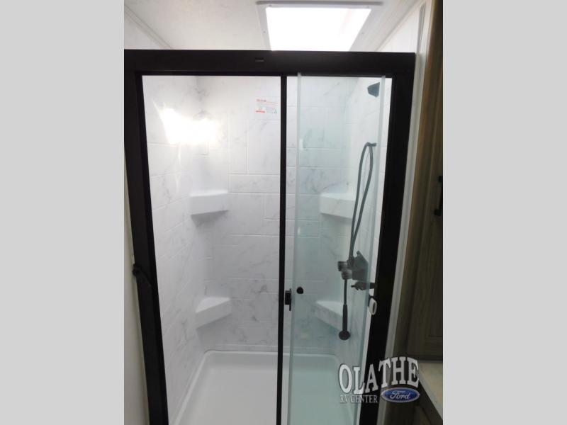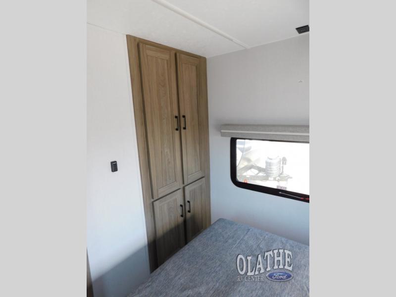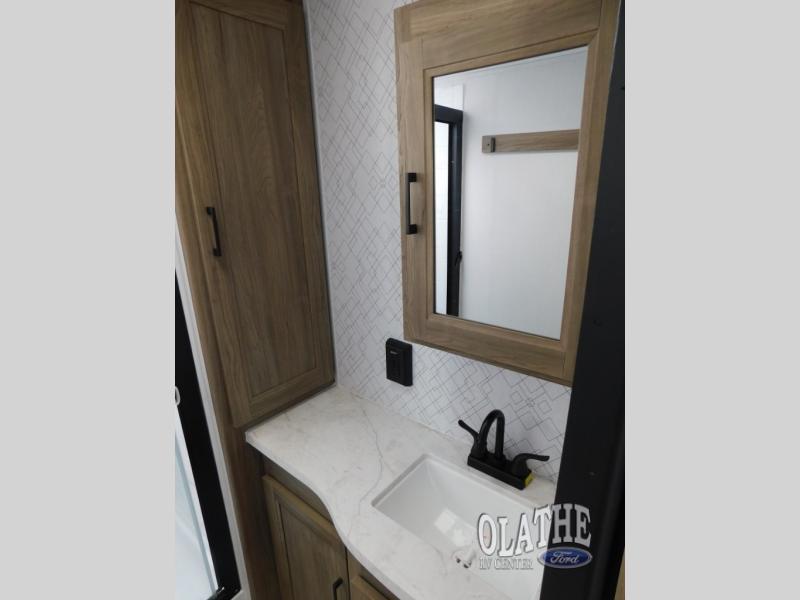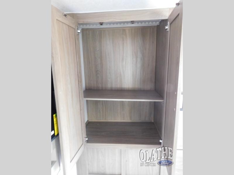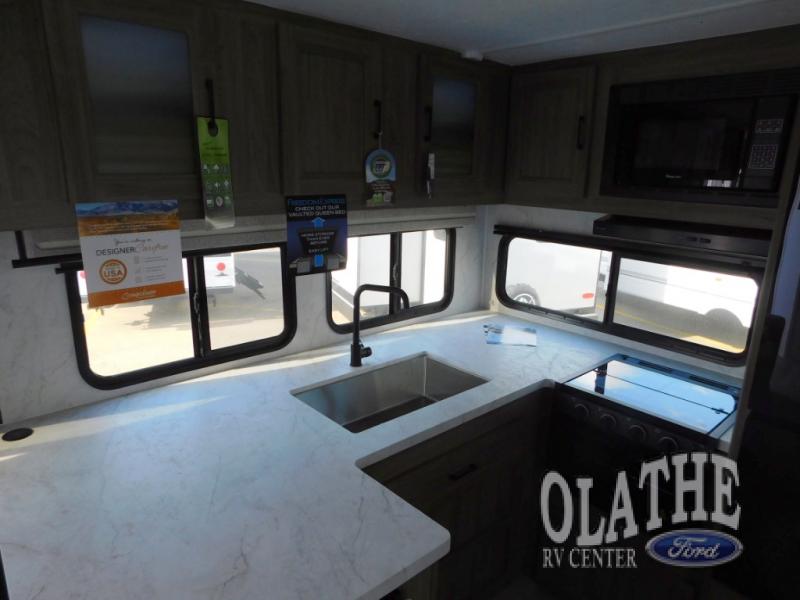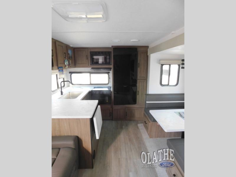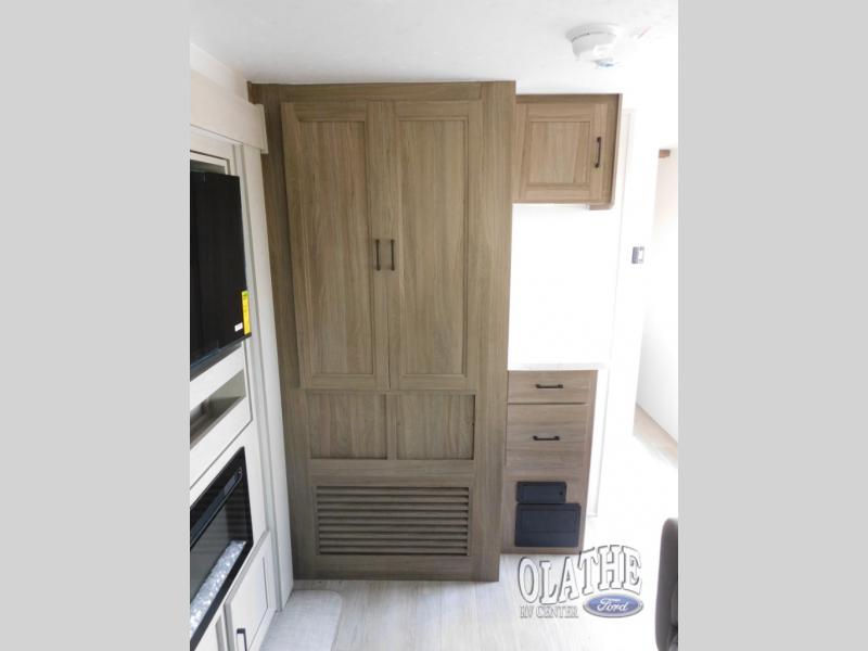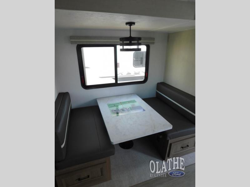 Are you looking for a travel trailer that will feel more like home? Look no further than this model that features a private bedroom up front, a full bath, plus a spacious rear kitchen. You will love to relax on the theatre sofa/hide-a-bed sofa across from the Smart TV and fireplace, and there is a booth dinette for dining. This model also includes a hidden pantry behind the TV for smart storage solutions. If the weather is nice you may just want to sit outdoors under the 18' power awning with LED lights. The chef of your group can prepare a meal on the pull-out camp kitchen, and the kids can grab their scooters from the pass-through storage.