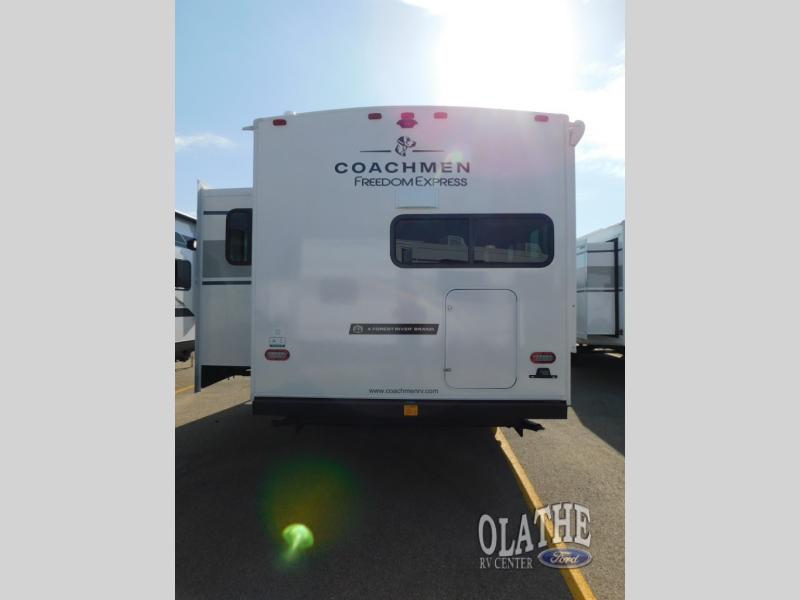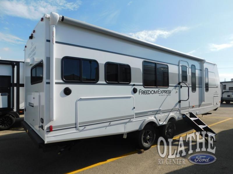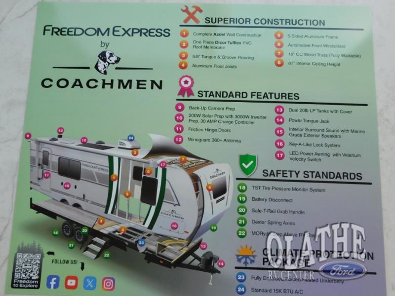 With any Freedom Express Ultra Lite travel trailer by Coachmen you will appreciate quality construction materials, such as vacuum bonded walls with Azdel composite, a 3/4 gel coated fiberglass cap with an automotive glass windshield, and a heated enclosed underbelly. Each model also features Tufflex PVC roofing, front rock guard, and E-Z Lube axles for smooth towing. Inside, you'll find kitchen backsplash, hidden hinge cabinetry, and wear-resistant vinyl flooring throughout. The power tongue jack included with the Ultra Lite Express Package will make set-up a breeze, and each model includes back-up camera prep and they are Freedom solar ready if you plan to go off-grid. Enjoy lightweight camping with a Freedom Express Ultra Lite travel trailer today!