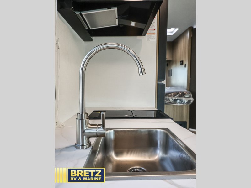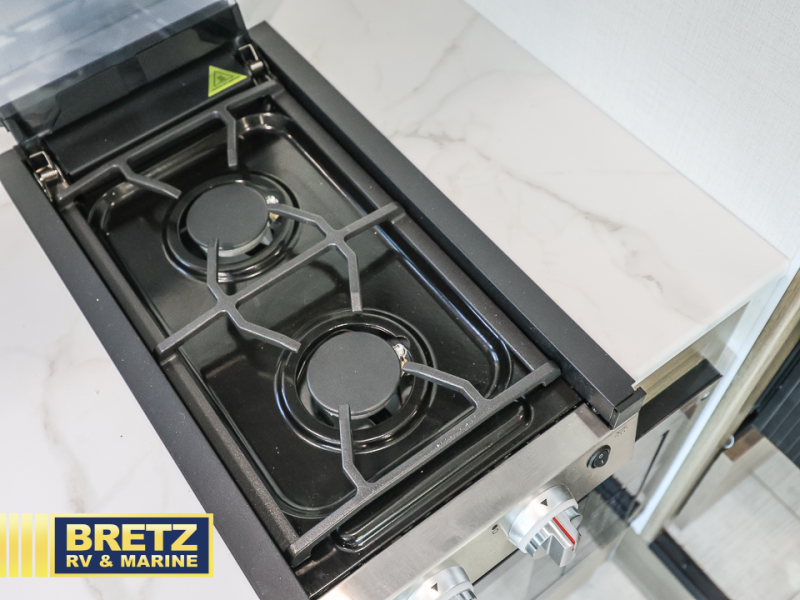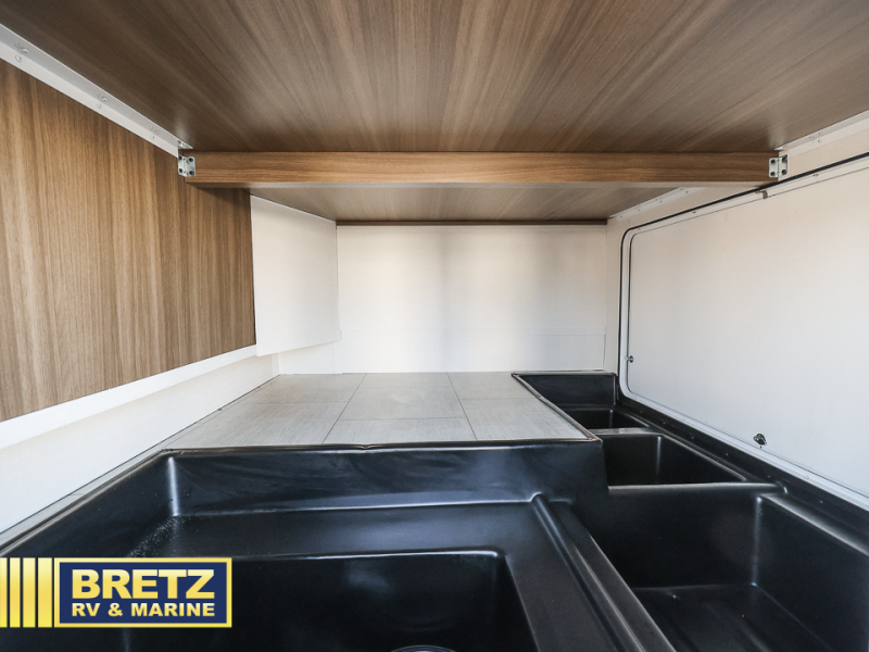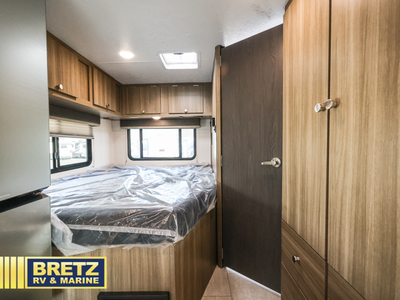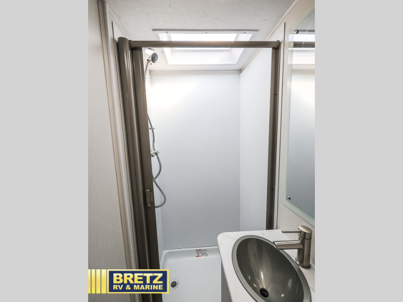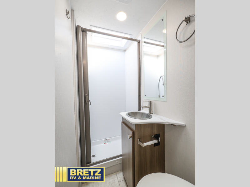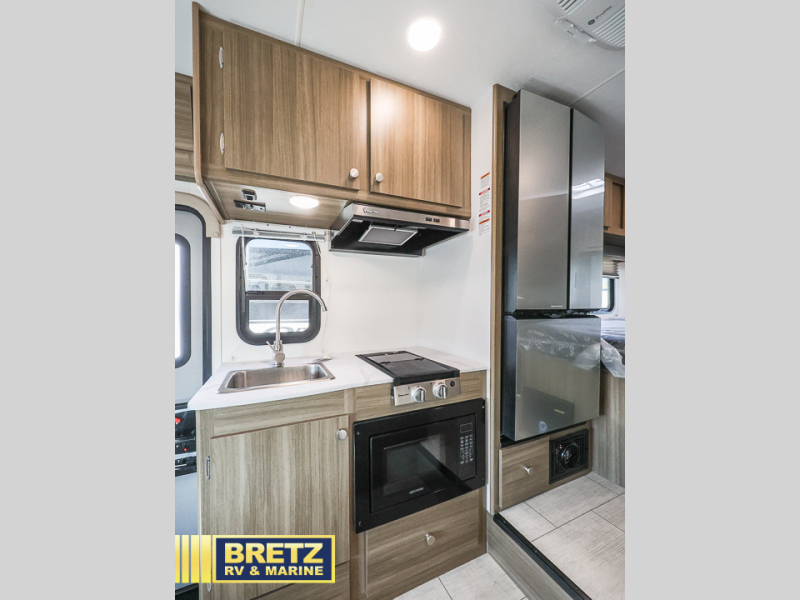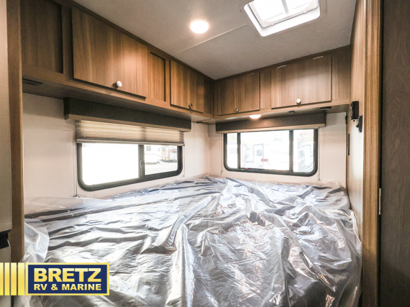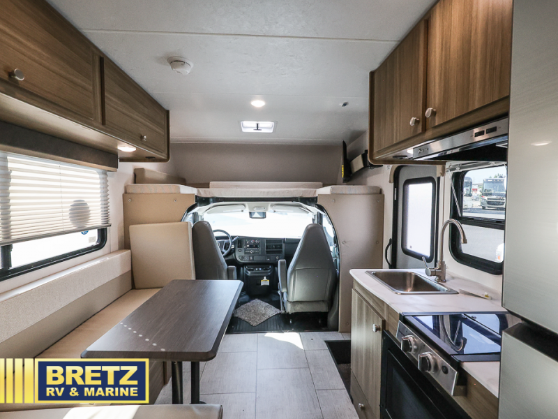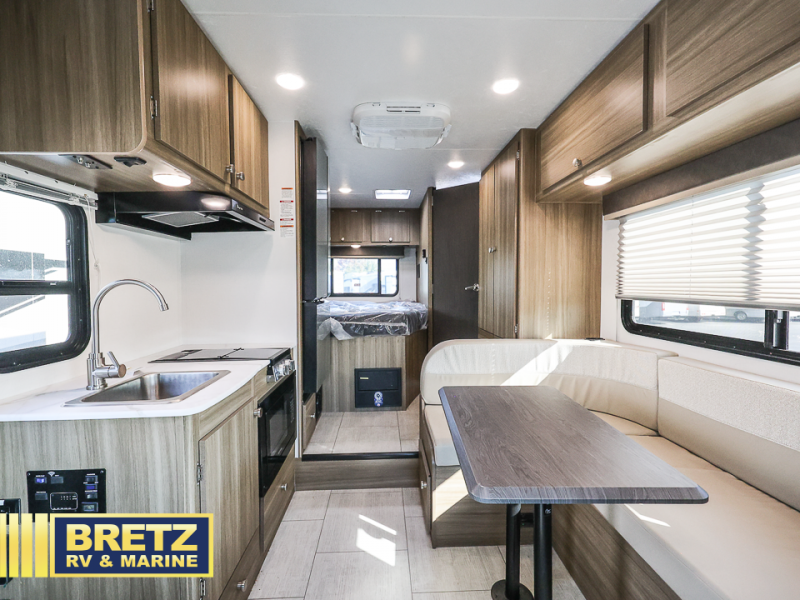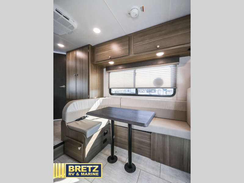 You will be met with comfort at every turn in this coach for six! Once you have stopped for the day, you can make lunch on the three burner cooktop and grab a cold drink from the 10 cu. ft. 12V refrigerator. There is a J-lounge with a pedestal table and extension where you can dine together, and the swing-arm TV in the cab will let you check the weather before heading outdoors. The rear corner full bath will let everyone freshen up when you return from hiking, and you'll enjoy a queen bed to sleep on each night, while your guest take the J-lounge and cab-over bunk!