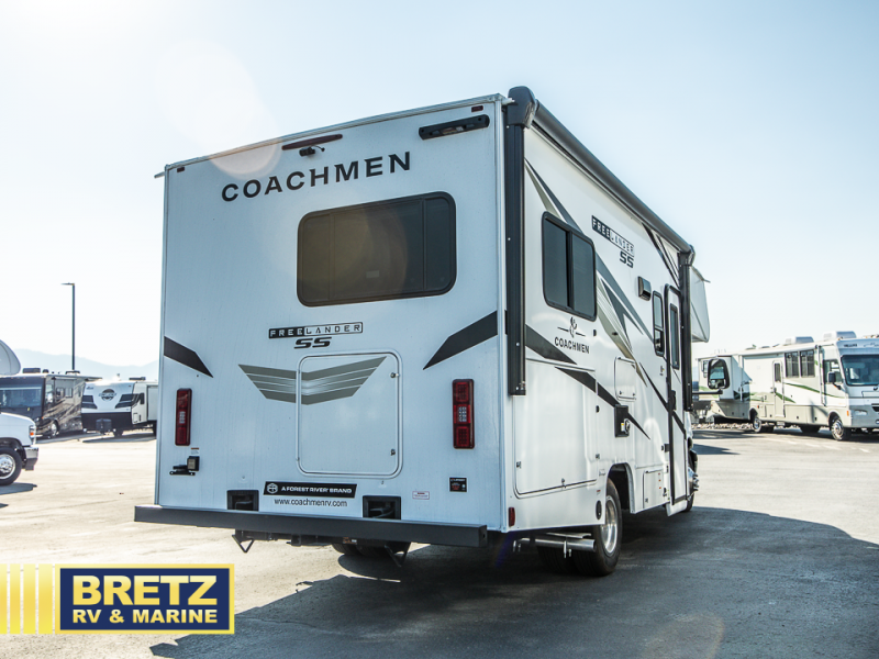 With any Freelander SS Class C gas motorhome by Coachmen, you will find a quality constructed coach for all your journeys. There is AlphaPly TPO seamless one-piece roof material and a max-length power awning with an LED light strip so you can enjoy evenings outdoors. You will also find a molded fiberglass front cap, a rotocast rear warehouse storage compartment, and an upgraded exterior safety grab handle. The mandatory SS Package includes a tankless water heater, running boards, and a towing hitch for your hauling needs. Head inside to enjoy the premium one-piece Thermofoil countertops and vinyl flooring, brushed nickle hardware, pleated night shades, and many more comforts.