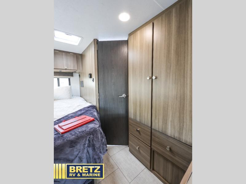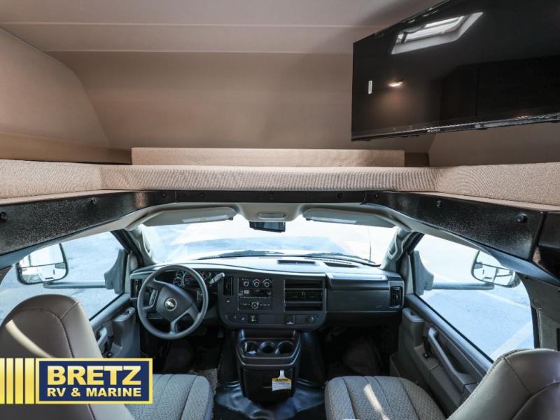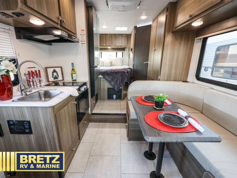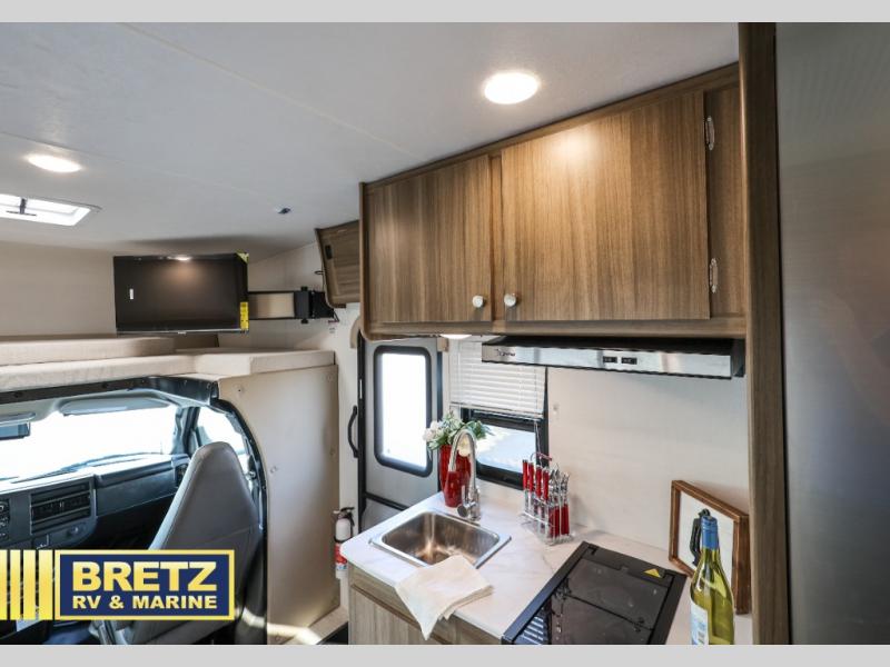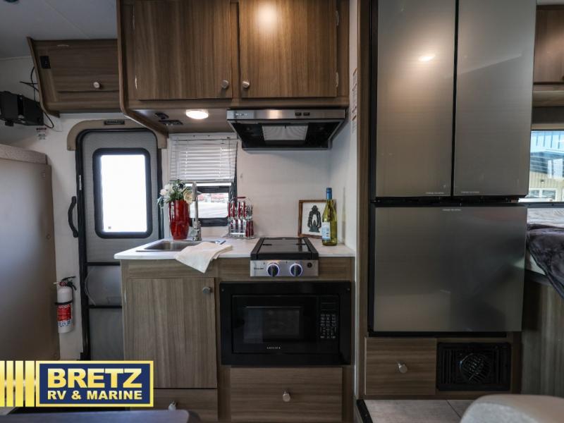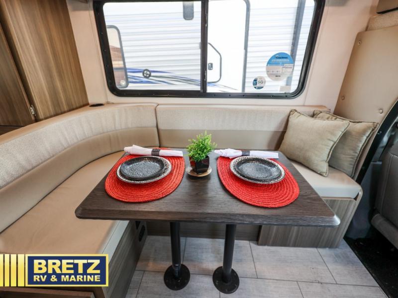 You will be met with comfort at every turn in this coach for six! Once you have stopped for the day, you can make lunch on the three burner cooktop and grab a cold drink from the 10 cu. ft. 12V refrigerator. There is a J-lounge with a pedestal table and extension where you can dine together, and the swing-arm TV in the cab will let you check the weather before heading outdoors. The rear corner full bath will let everyone freshen up when you return from hiking, and you'll enjoy a queen bed to sleep on each night, while your guest take the J-lounge and cab-over bunk!