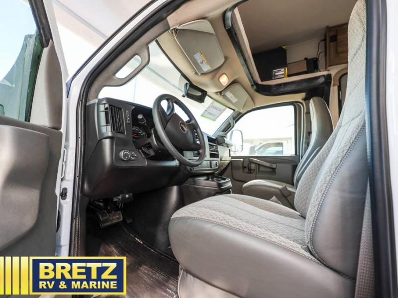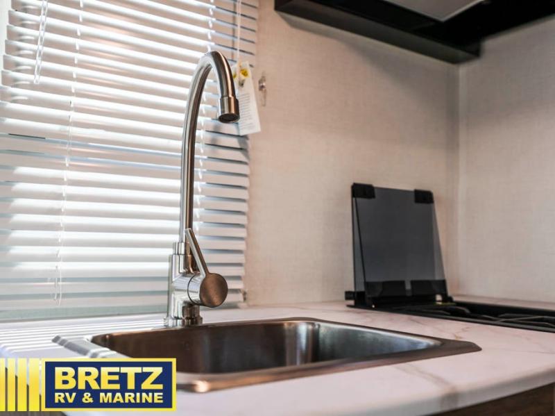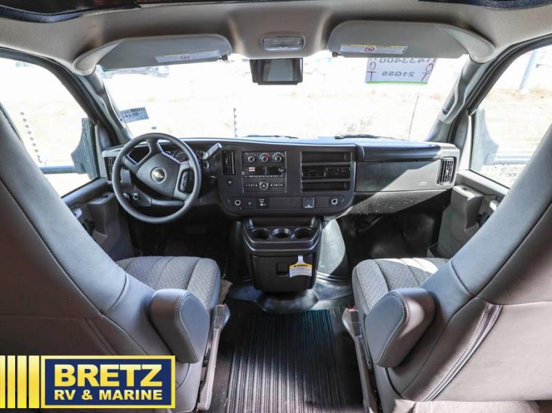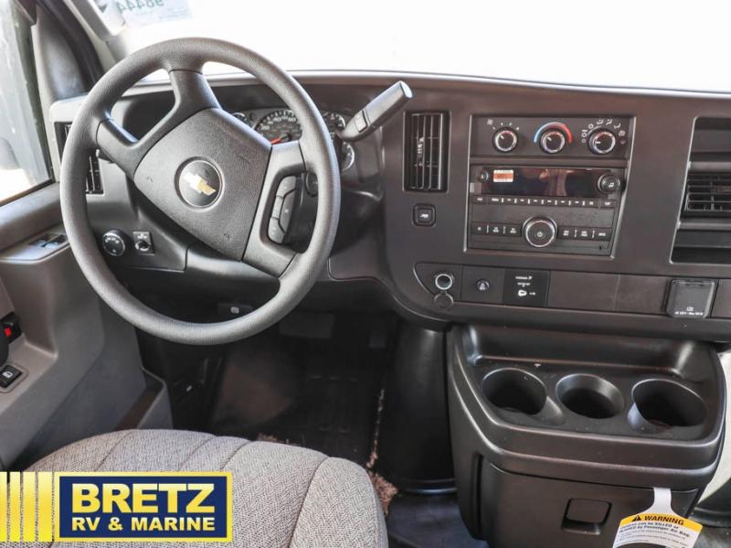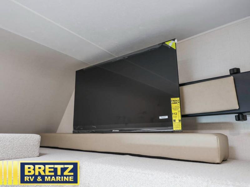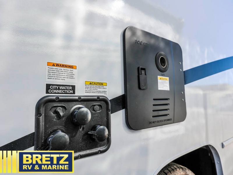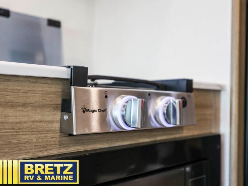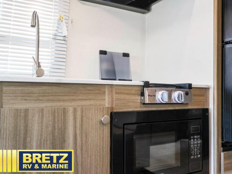 You will be met with comfort at every turn in this coach for six! Once you have stopped for the day, you can make lunch on the three burner cooktop and grab a cold drink from the 10 cu. ft. 12V refrigerator. There is a J-lounge with a pedestal table and extension where you can dine together, and the swing-arm TV in the cab will let you check the weather before heading outdoors. The rear corner full bath will let everyone freshen up when you return from hiking, and you'll enjoy a queen bed to sleep on each night, while your guest take the J-lounge and cab-over bunk!