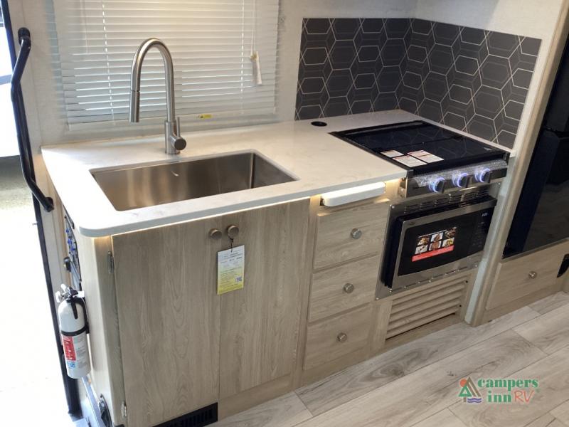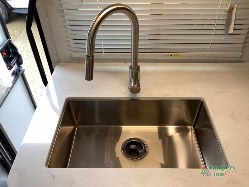Deep stainless-steel sink and solid-surface countertops for easy meal prep and cleanup.