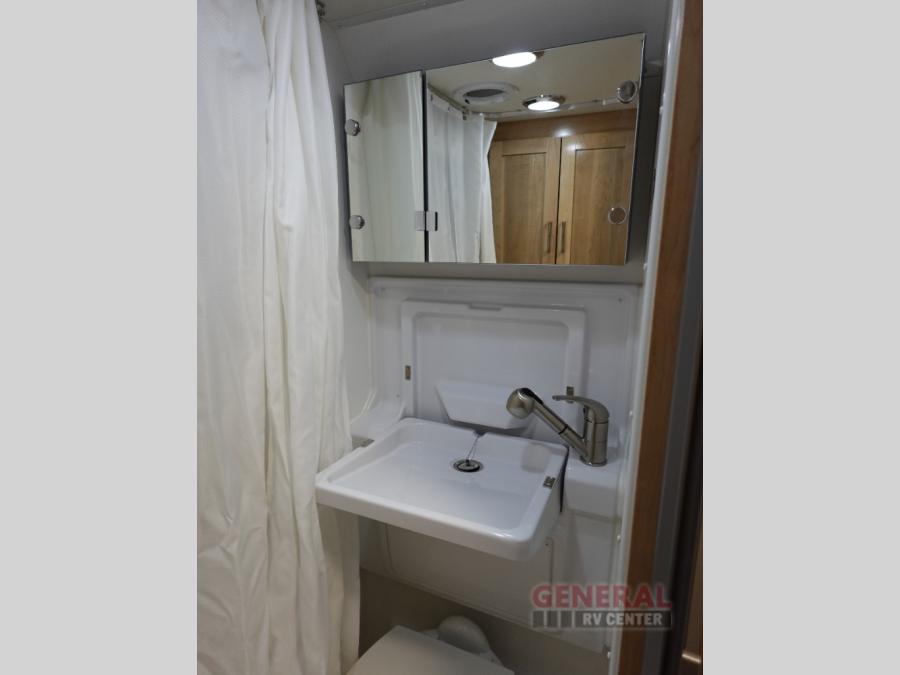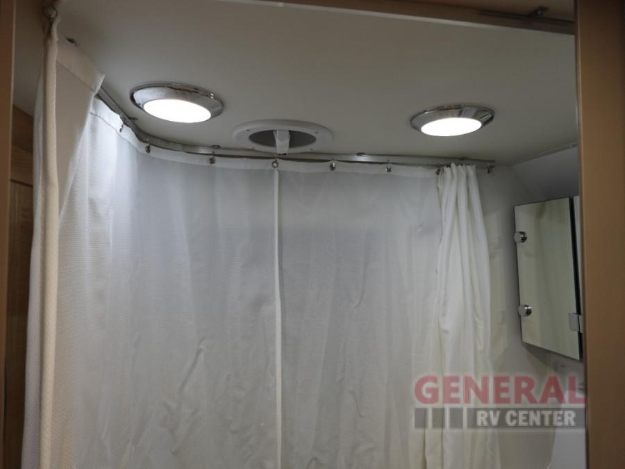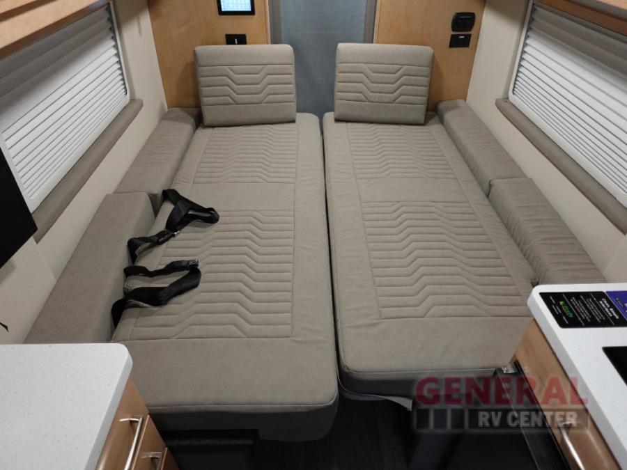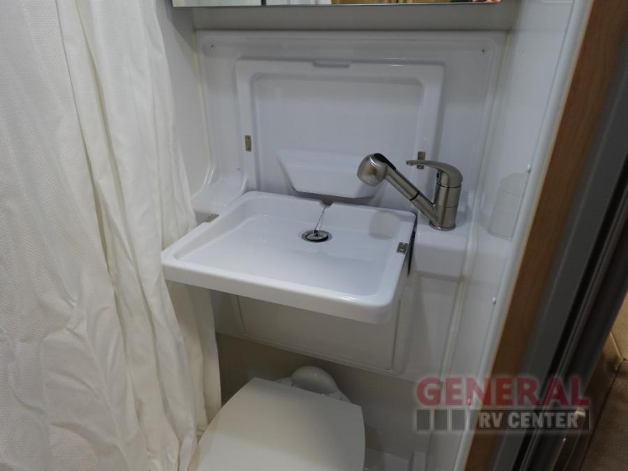 This camper van with a full rear bath will meet your needs surprisingly well. Two twin beds will provide comfortable sleeping space each night, and the swivel table in between the beds will be the perfect place to enjoy breakfast together. There is a bath wardrobe to keep your clothes tidy, plus you'll find overhead cabinets above the beds and additional storage just as you enter the coach for your belongings. This coach also includes swivel captain's seats so you can turn them around for living room seating!