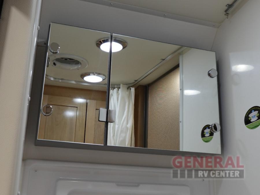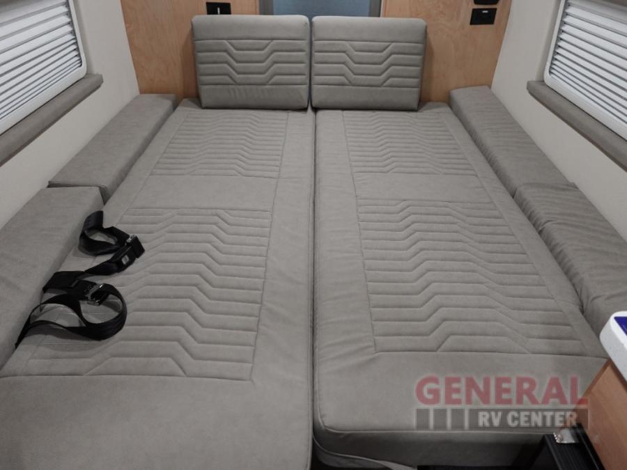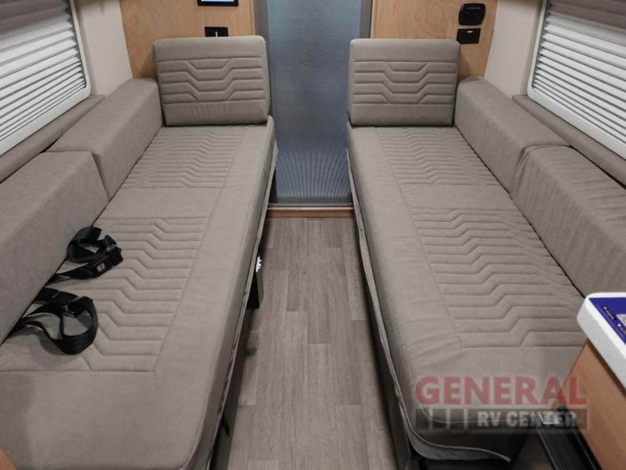 This camper van with a full rear bath will meet your needs surprisingly well. Two twin beds will provide comfortable sleeping space each night, and the swivel table in between the beds will be the perfect place to enjoy breakfast together. There is a bath wardrobe to keep your clothes tidy, plus you'll find overhead cabinets above the beds and additional storage just as you enter the coach for your belongings. This coach also includes swivel captain's seats so you can turn them around for living room seating!