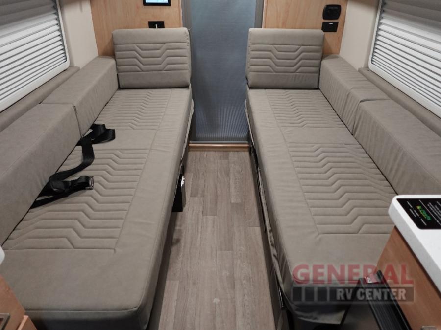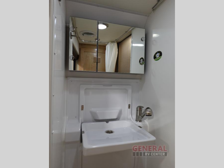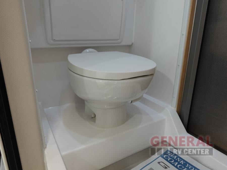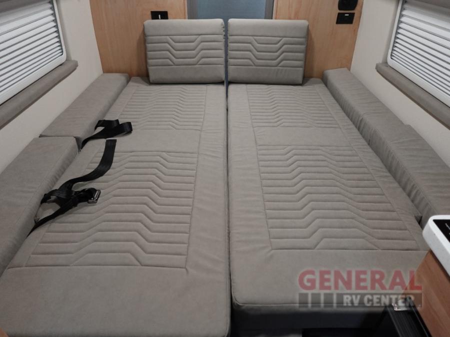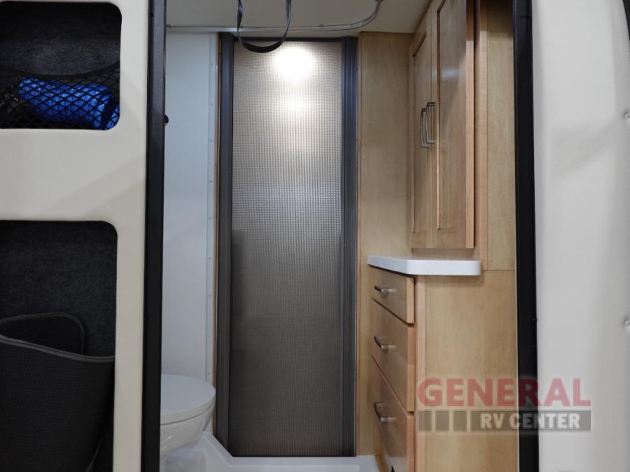 This camper van with a full rear bath will meet your needs surprisingly well. Two twin beds will provide comfortable sleeping space each night, and the swivel table in between the beds will be the perfect place to enjoy breakfast together. There is a bath wardrobe to keep your clothes tidy, plus you'll find overhead cabinets above the beds and additional storage just as you enter the coach for your belongings. This coach also includes swivel captain's seats so you can turn them around for living room seating!