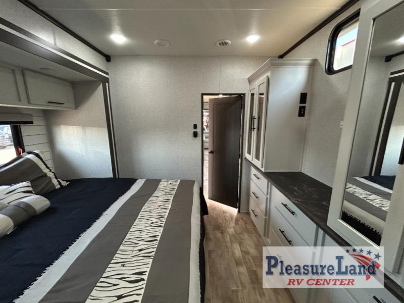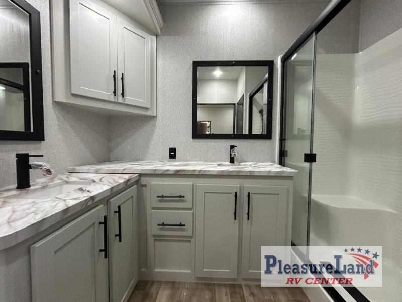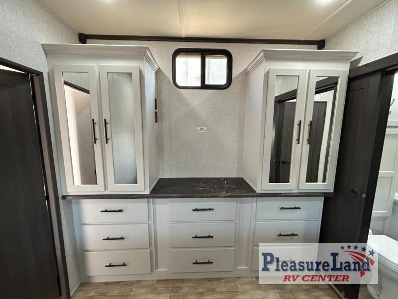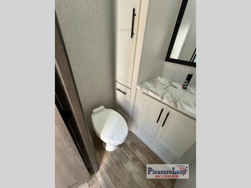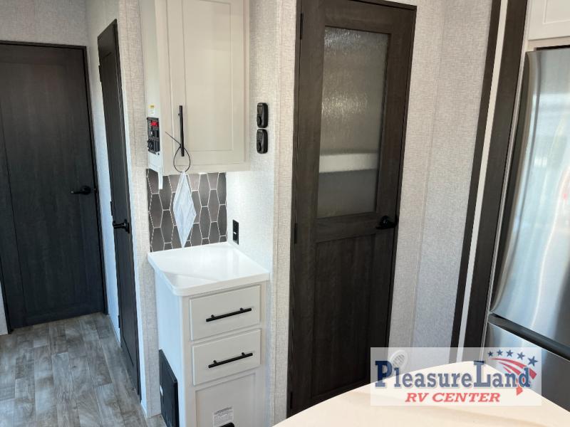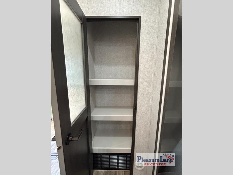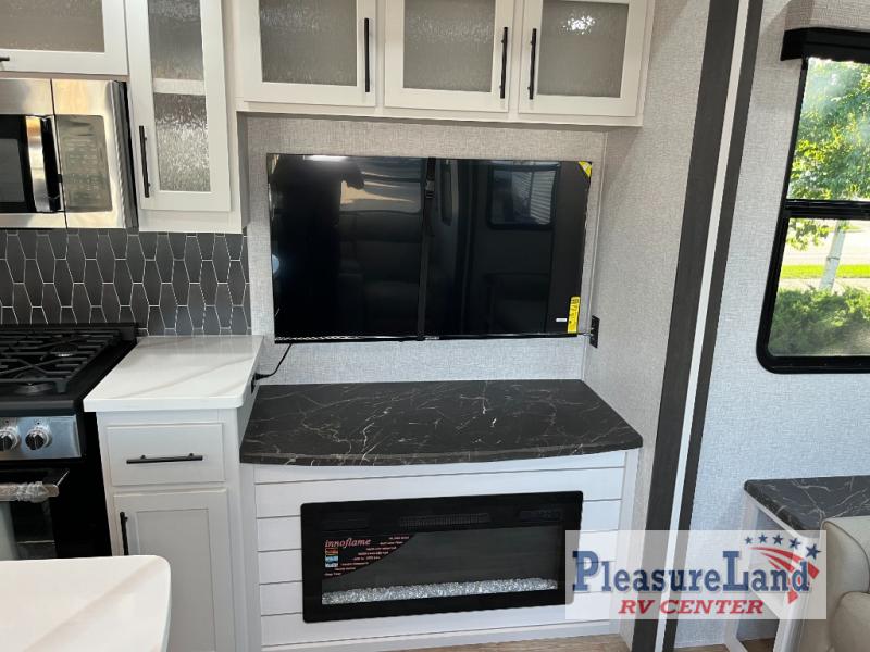 Get away to your own master suite at your favorite destination today! You can sleep on the king bed slide out with plenty of storage for your clothes on the opposite side and get cleaned up in the full bathroom in the 48" shower. There are even dual bath sinks so you both can brush your teeth at the same time. There is also a space that has been prepped for an optional washer/dryer if you like. An added convenience is the centrally located half bath across from the patio doors for easy entry and exit. The front living area provides a sofa that can double as sleeping space for your kids or overnight guests, and the theater seats allow you to clearly see the 50" lift TV with fireplace below. The cook will love the kitchen island, hutch, and pantry with a shelf, as well as the appliances. Dining or even doing a little work will be comfortable while seated at the free standing table with chairs and bench seating.