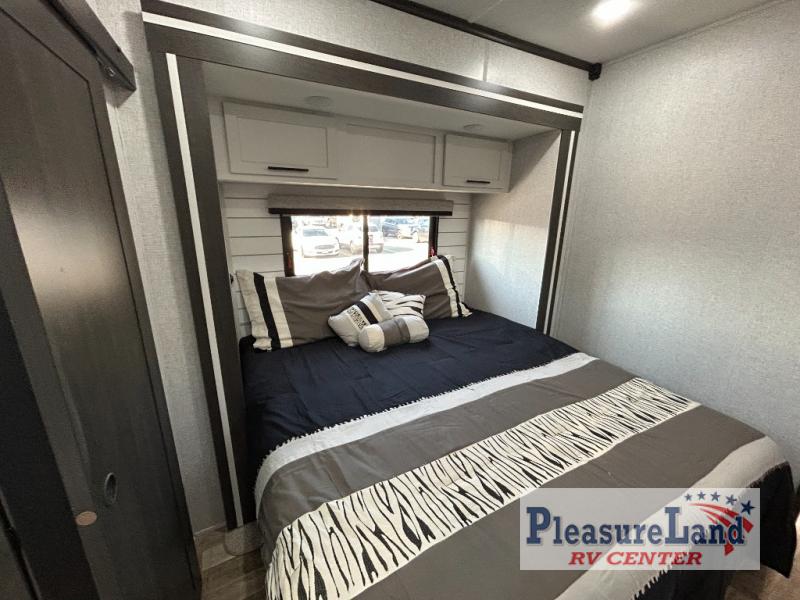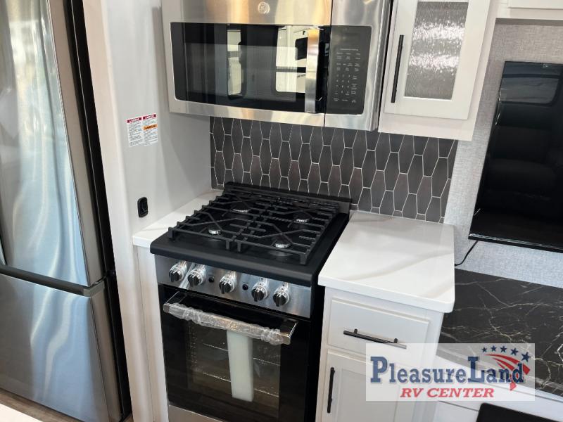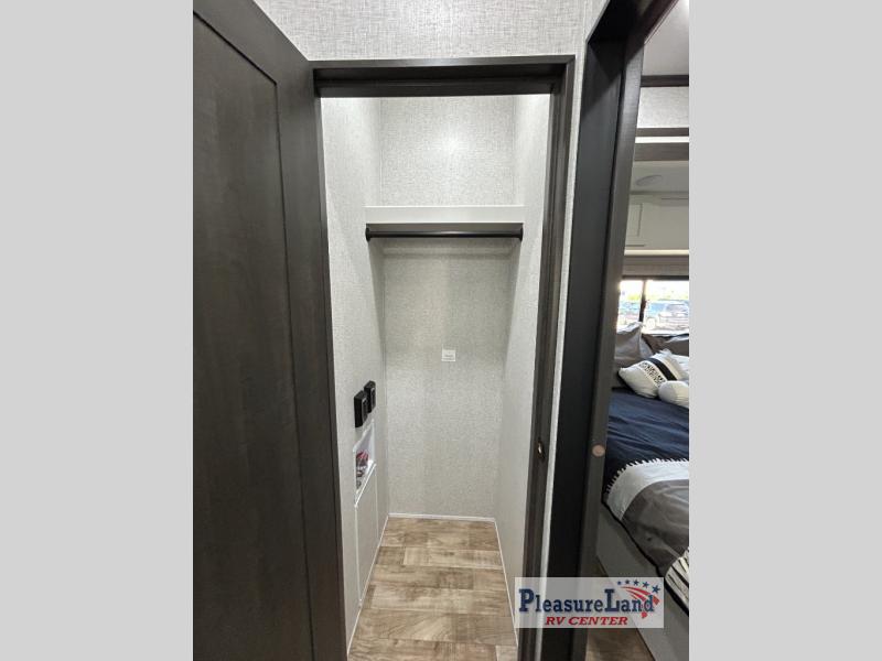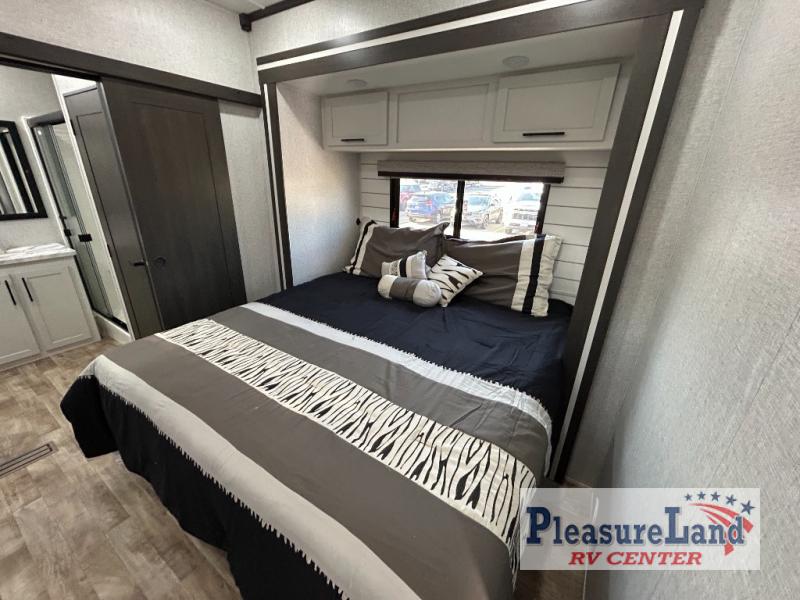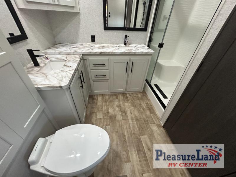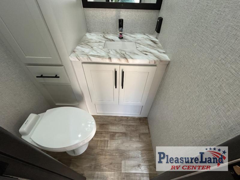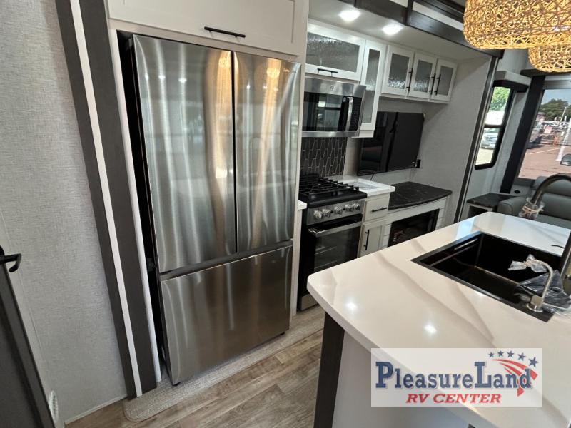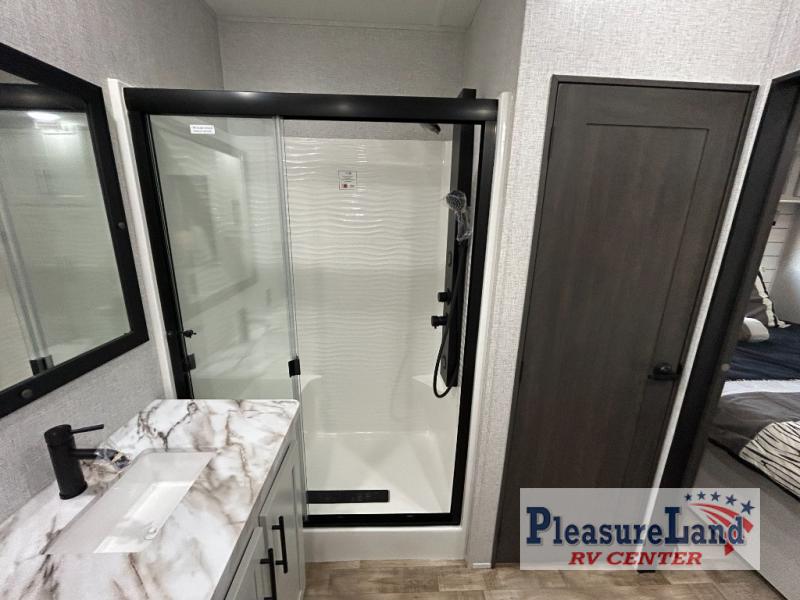 Get away to your own master suite at your favorite destination today! You can sleep on the king bed slide out with plenty of storage for your clothes on the opposite side and get cleaned up in the full bathroom in the 48" shower. There are even dual bath sinks so you both can brush your teeth at the same time. There is also a space that has been prepped for an optional washer/dryer if you like. An added convenience is the centrally located half bath across from the patio doors for easy entry and exit. The front living area provides a sofa that can double as sleeping space for your kids or overnight guests, and the theater seats allow you to clearly see the 50" lift TV with fireplace below. The cook will love the kitchen island, hutch, and pantry with a shelf, as well as the appliances. Dining or even doing a little work will be comfortable while seated at the free standing table with chairs and bench seating.