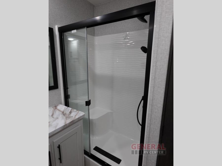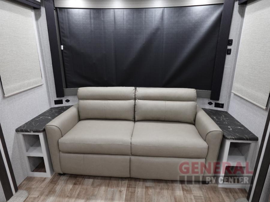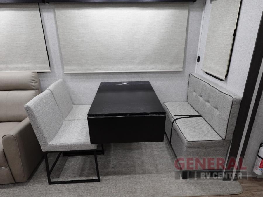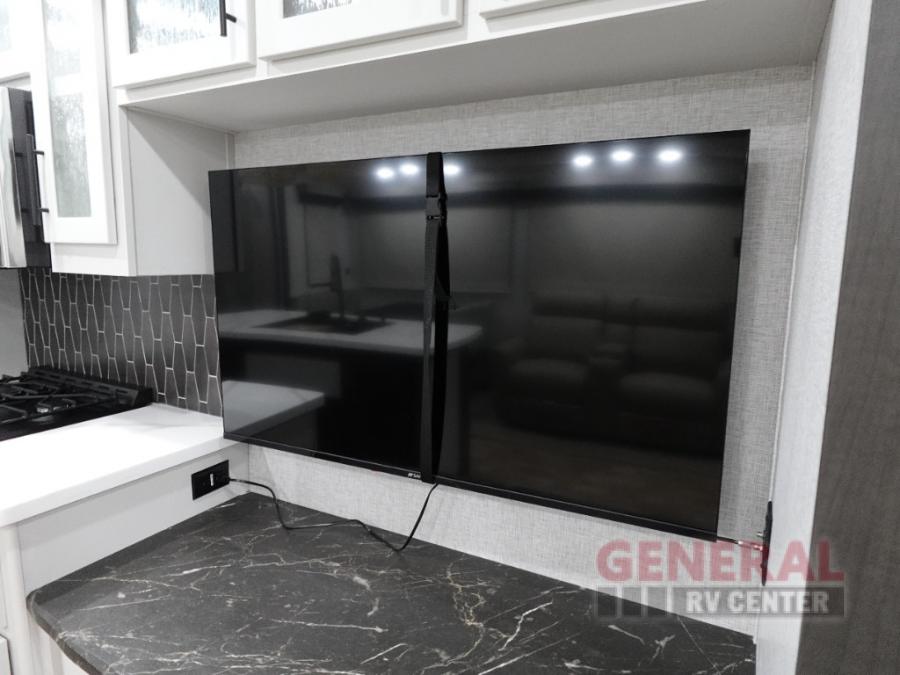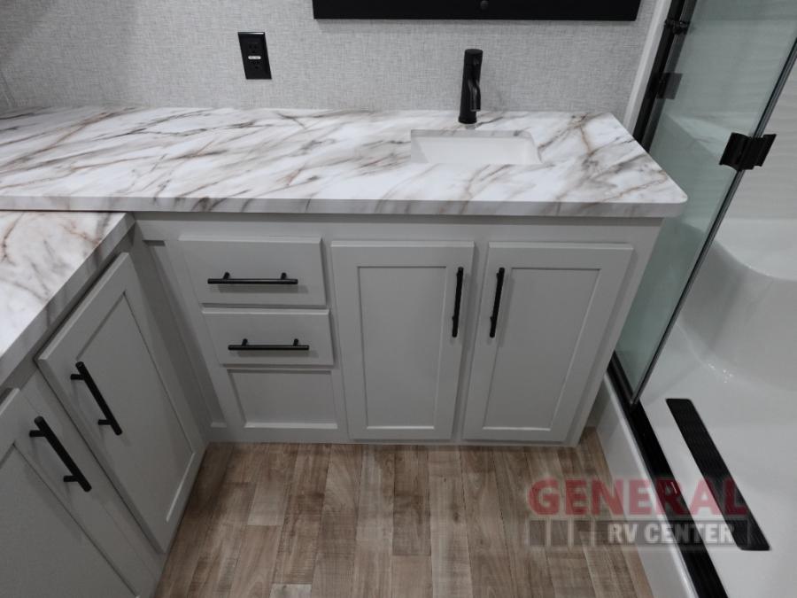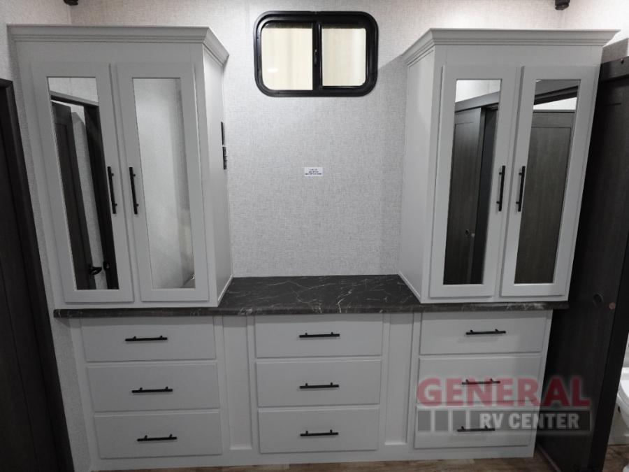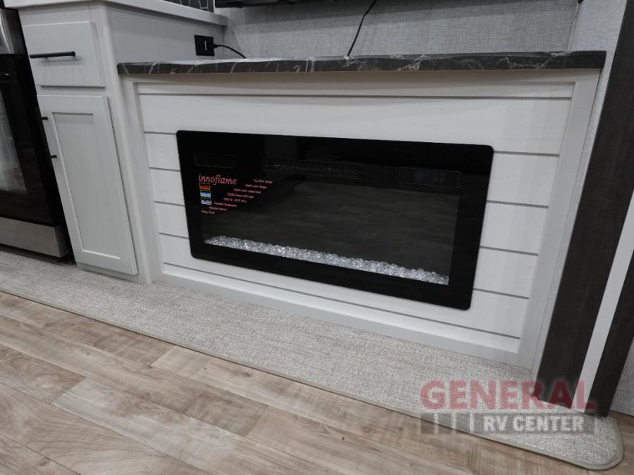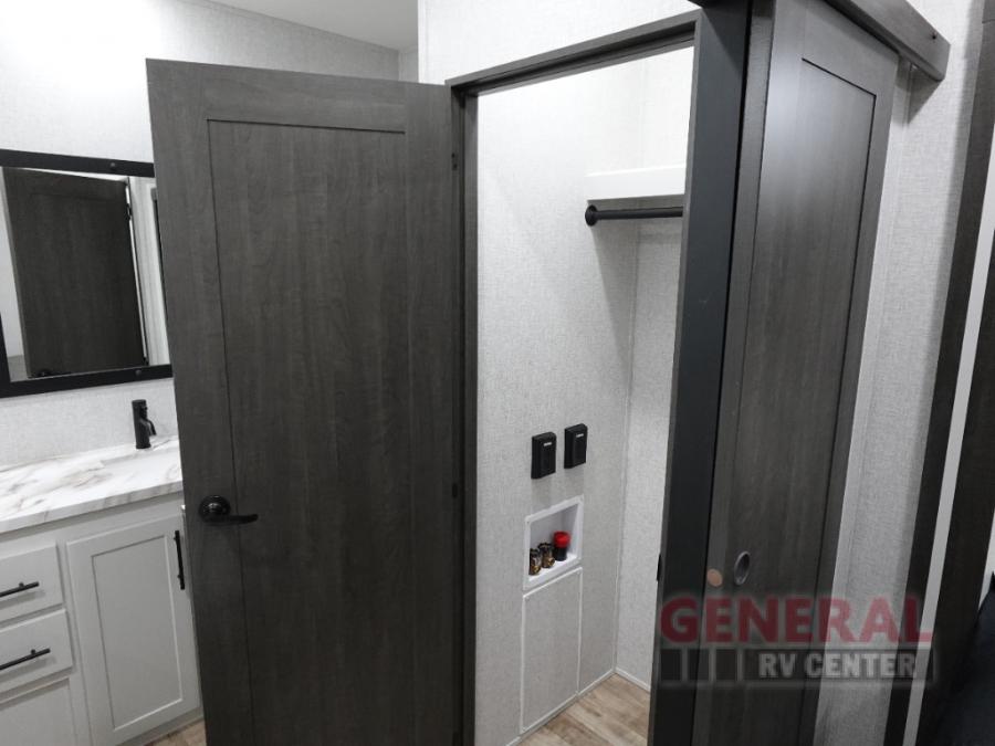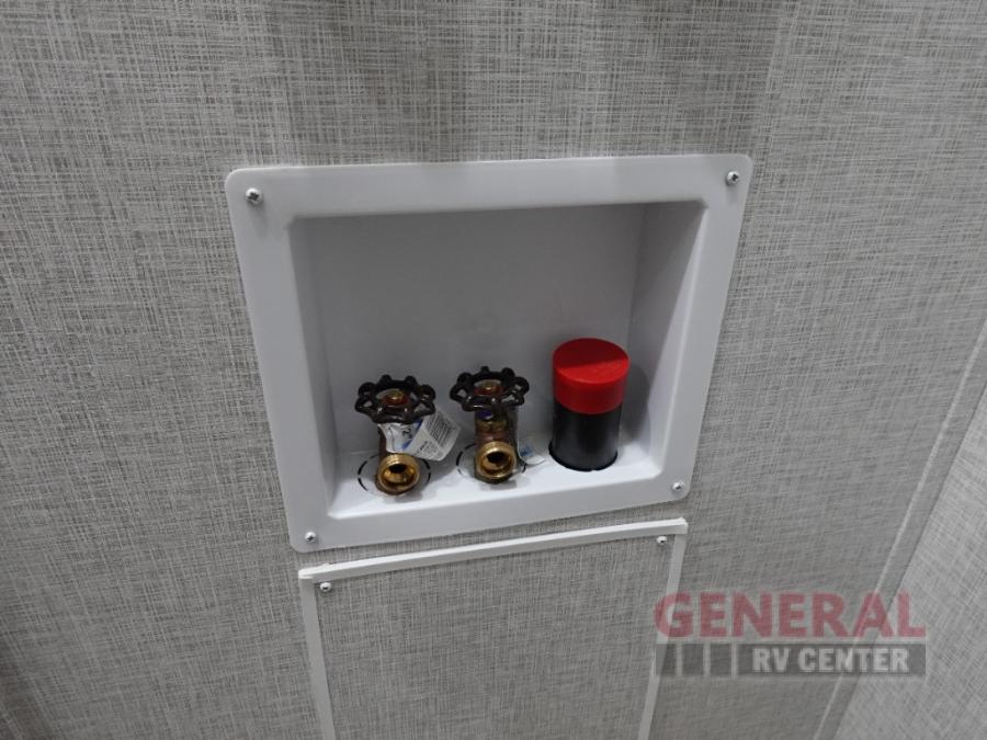 Get away to your own master suite at your favorite destination today! You can sleep on the king bed slide out with plenty of storage for your clothes on the opposite side and get cleaned up in the full bathroom in the 48" shower. There are even dual bath sinks so you both can brush your teeth at the same time. There is also a space that has been prepped for a washer/dryer if you like.  An added convenience is the centrally located half bath across from the patio doors for easy entry and exit. The front living area provides a sofa that can double as sleeping space for your kids or overnight guests, and the theater seats allow you to clearly see the 50" lift TV with fireplace below. The cook will love the kitchen island, hutch, and pantry with a shelf, as well as the appliances. Dining or even doing a little work will be comfortable while seated at the free standing table with chairs and bench seating.