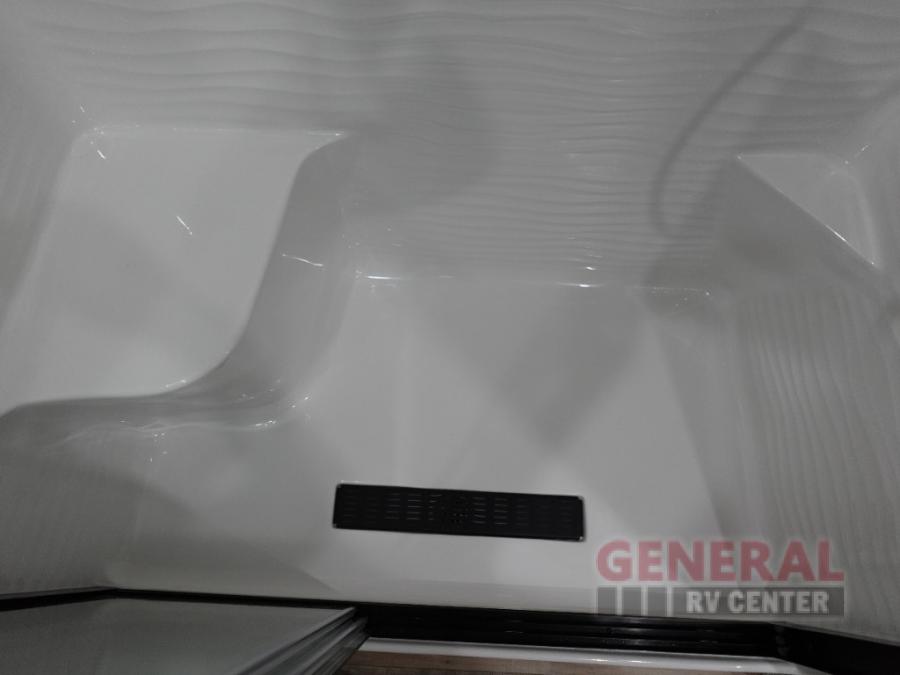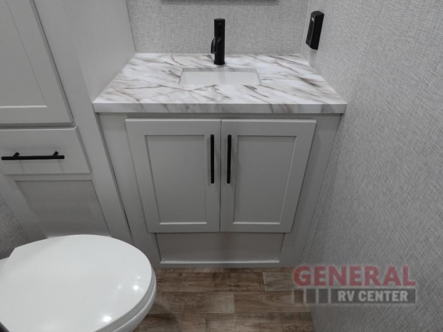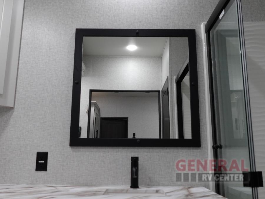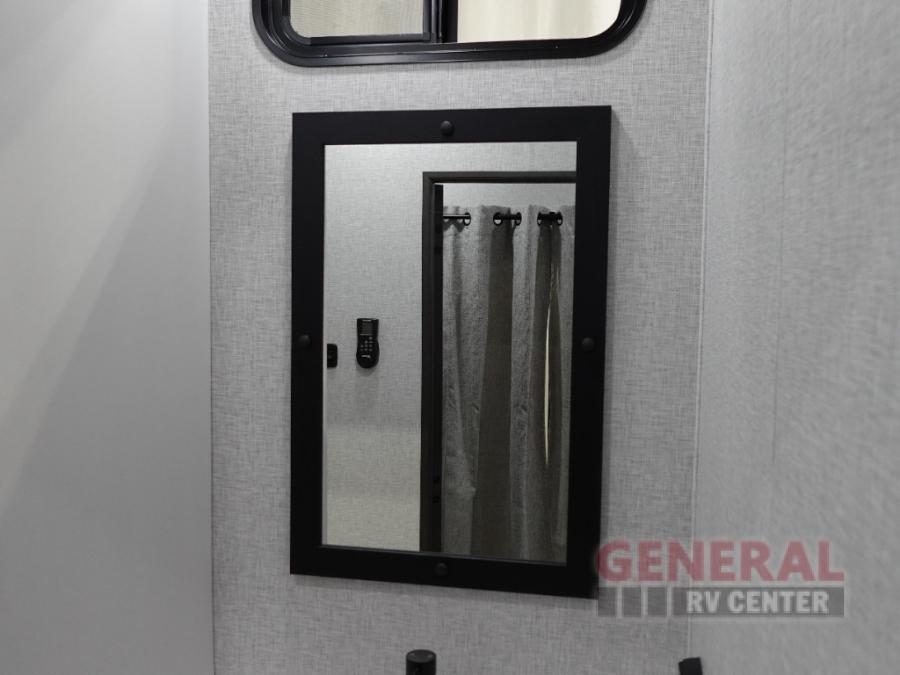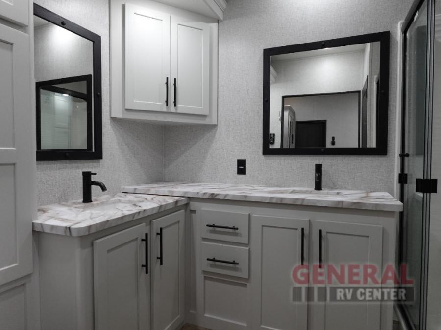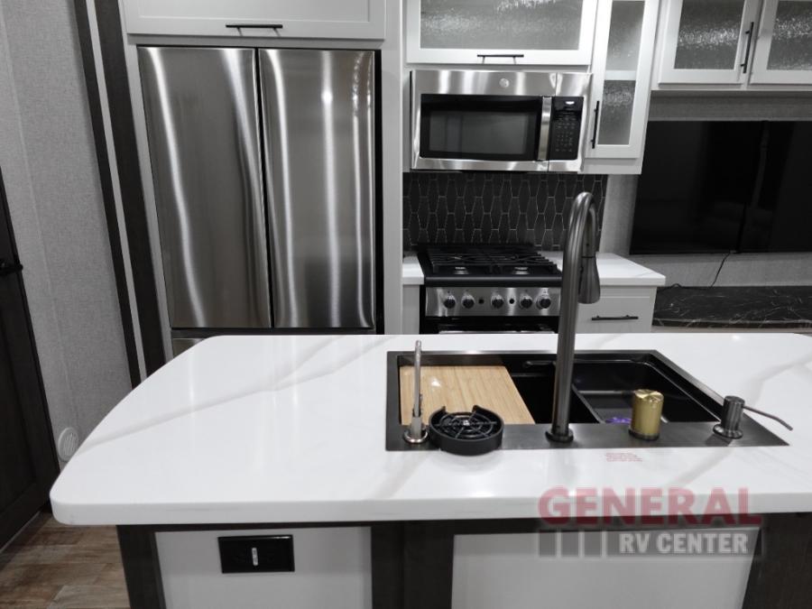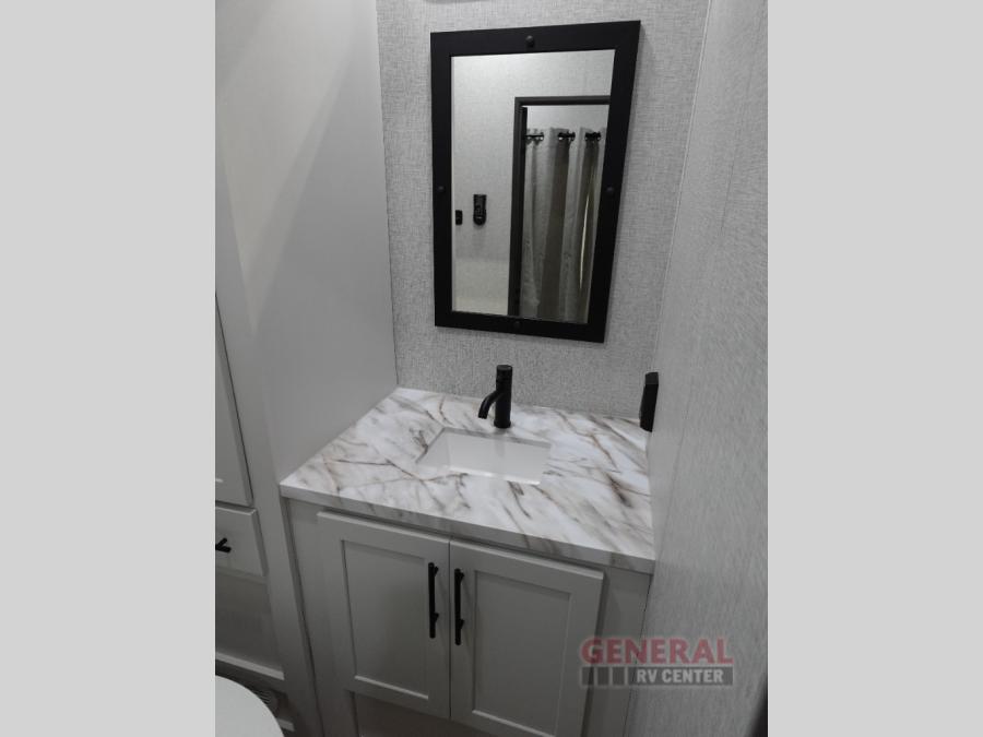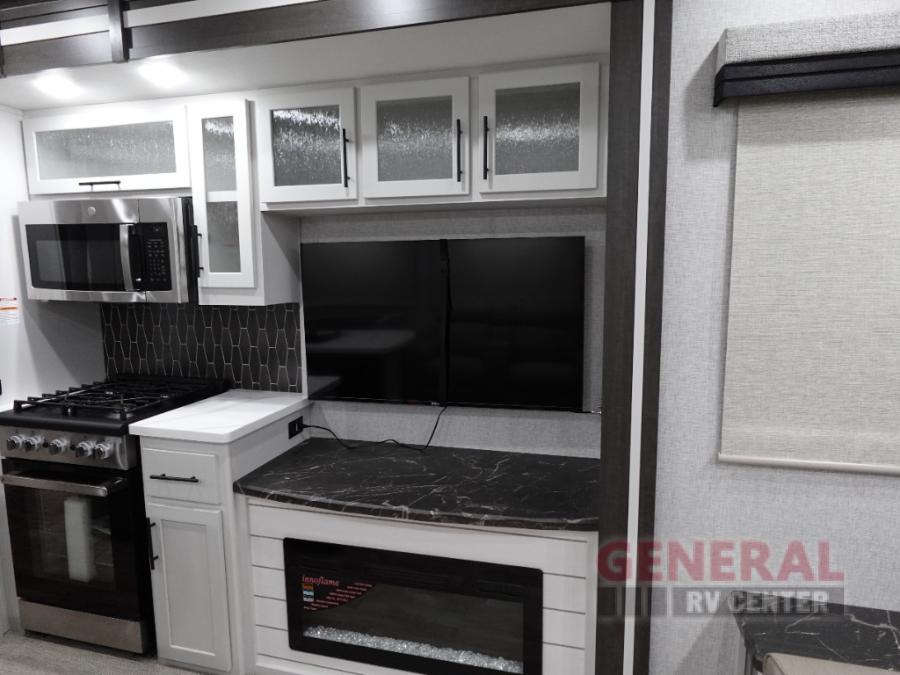 Get away to your own master suite at your favorite destination today! You can sleep on the king bed slide out with plenty of storage for your clothes on the opposite side and get cleaned up in the full bathroom in the 48" shower. There are even dual bath sinks so you both can brush your teeth at the same time. There is also a space that has been prepped for a washer/dryer if you like.  An added convenience is the centrally located half bath across from the patio doors for easy entry and exit. The front living area provides a sofa that can double as sleeping space for your kids or overnight guests, and the theater seats allow you to clearly see the 50" lift TV with fireplace below. The cook will love the kitchen island, hutch, and pantry with a shelf, as well as the appliances. Dining or even doing a little work will be comfortable while seated at the free standing table with chairs and bench seating.