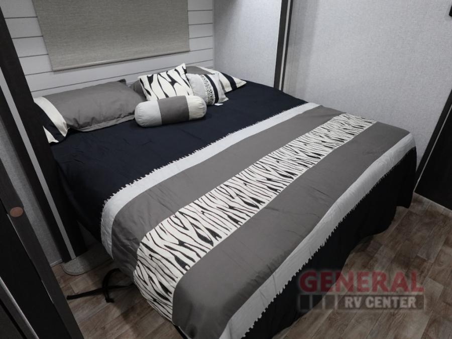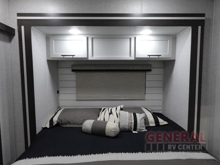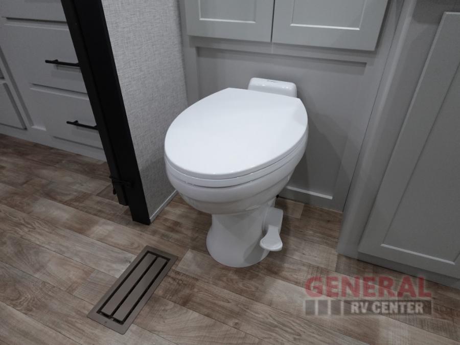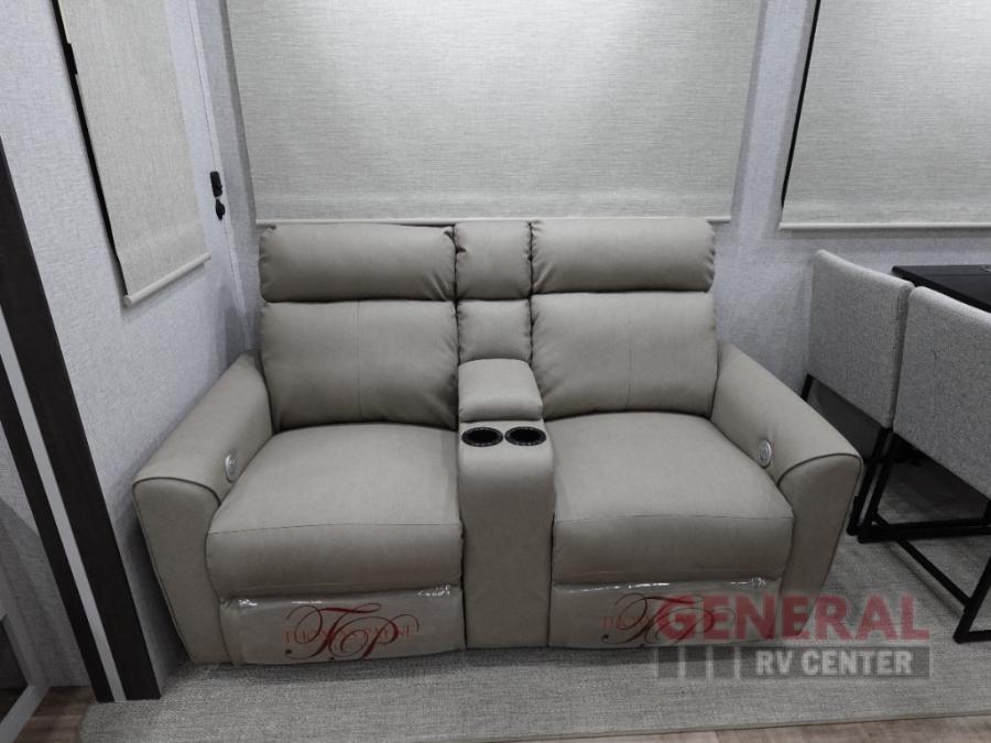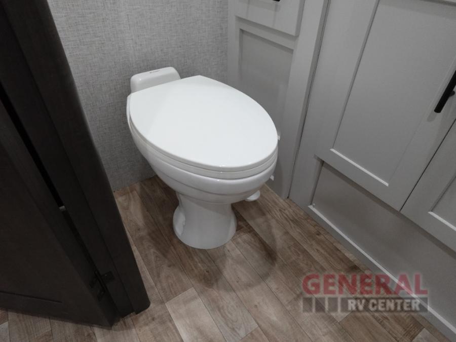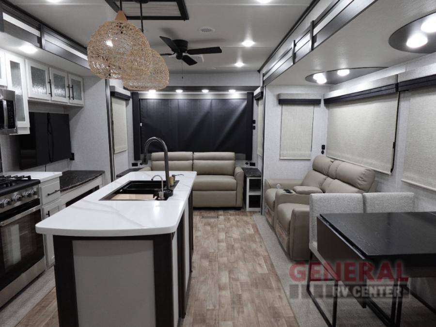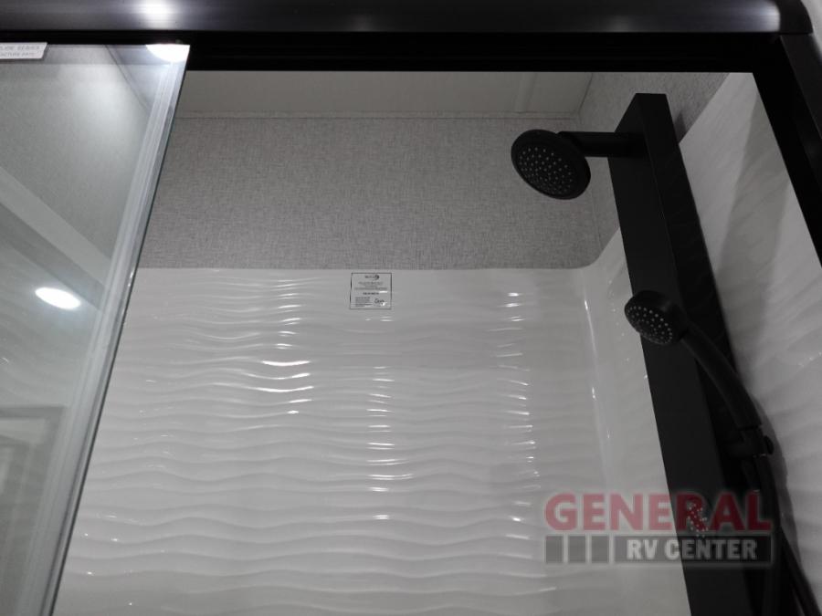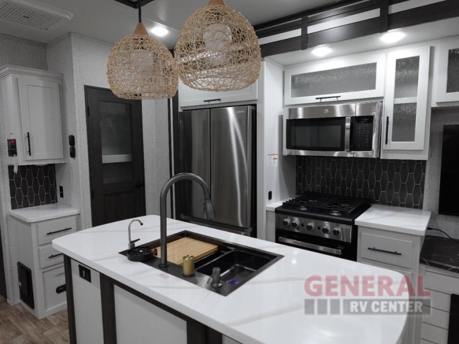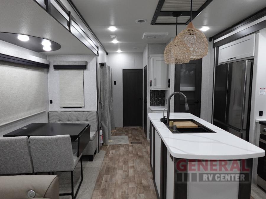 Get away to your own master suite at your favorite destination today! You can sleep on the king bed slide out with plenty of storage for your clothes on the opposite side and get cleaned up in the full bathroom in the 48" shower. There are even dual bath sinks so you both can brush your teeth at the same time. There is also a space that has been prepped for a washer/dryer if you like.  An added convenience is the centrally located half bath across from the patio doors for easy entry and exit. The front living area provides a sofa that can double as sleeping space for your kids or overnight guests, and the theater seats allow you to clearly see the 50" lift TV with fireplace below. The cook will love the kitchen island, hutch, and pantry with a shelf, as well as the appliances. Dining or even doing a little work will be comfortable while seated at the free standing table with chairs and bench seating.
