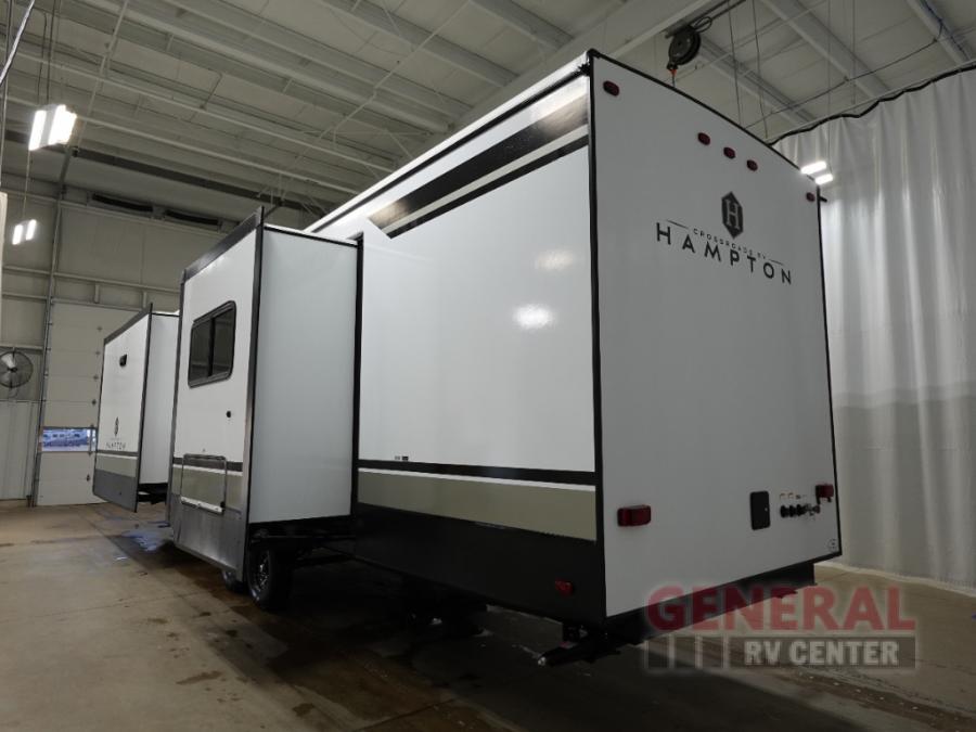Each Hampton destination trailer by CrossRoads RV includes a one-piece fiberglass front cap, tinted glass windows, and an outside faucet that will surely come in handy when wanting to rinse off your hands or even shoes after exploring outdoors. Each is constructed with a fiberglass roof and floor insulation with radiant tech foil, an enclosed underbelly, and severe weather welded mounts and rain gutters along the entire roof line. And, the Convenience package that comes standard includes KeyTV, a microwave, a quilted bedspread, a power vent in the bathroom, and more. Other interior features offered include decorative accent lighting, an 8-foot floor to ceiling height, a patio door with a swing-out assist rail, and two-toned wood fascia. So choose your destination, select your favorite Hampton, and start feeling at home when you are actually on vacation!