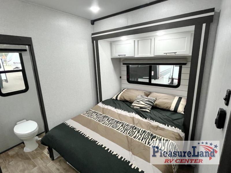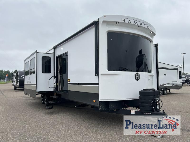Each Hampton destination trailer by CrossRoads RV includes a one-piece fiberglass front cap, tinted glass windows, and an outside faucet that will surely come in handy when wanting to rinse off your hands or even shoes after exploring outdoors. Each is constructed with a fiberglass roof and floor insulation with radiant tech foil, an enclosed underbelly, and severe weather welded mounts and rain gutters along the entire roof line. And, the Convenience package that comes standard includes KeyTV, a microwave, a quilted bedspread, a power vent in the bathroom, and more. Other interior features offered include decorative accent lighting, an 8-foot floor to ceiling height, a patio door with a swing-out assist rail, and two-toned wood fascia. So choose your destination, select your favorite Hampton, and start feeling at home when you are actually on vacation!