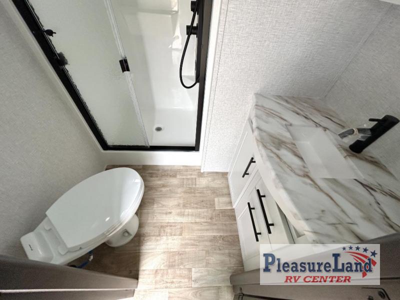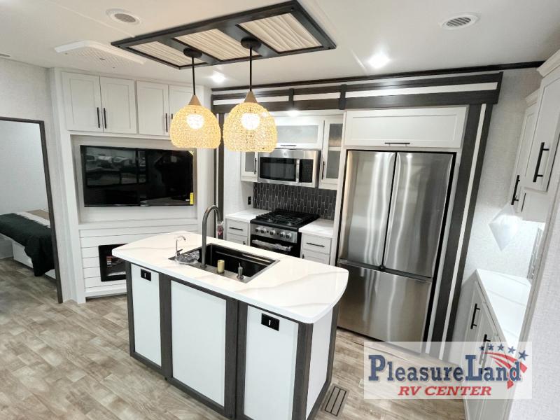 Wow! Check out this destination trailer with four slides, two private bedrooms, and two full baths! Now you can camp for longer periods of time and soak up the nature around you. The kitchen island includes plenty of counter space, a deep stainless steel sink for easy clean up, and a hutch for more storage. After dinner is cleaned up you can relax on the power theater seating in great view of the 50" TV, or you may just want to play a game of cards at the free-standing table with chairs and a bench seat.