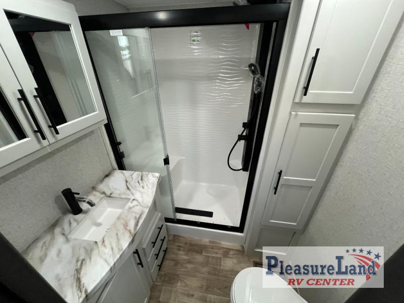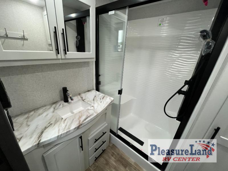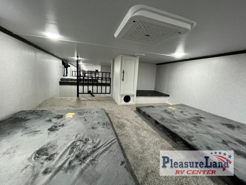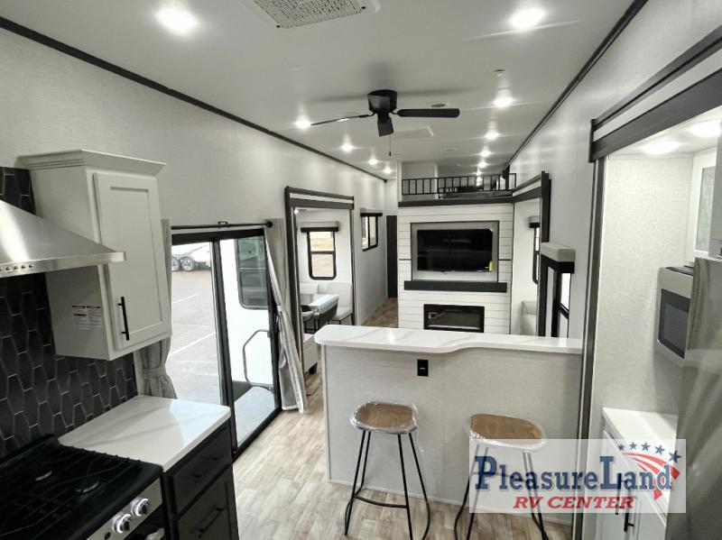 Are you looking for a destination trailer that can fit your whole crew? Look no further than this unit with four slides, three bunk mats in the loft areas, plus a spacious full bath that will allow everyone to stay clean each day. The front kitchen is any chef's dream with its ample counter space, pantry/cabinet, residential four burner range, and residential refrigerator. After dinner is cleaned up, everyone can meet in the middle living area to watch a movie on the 50" TV, and the fireplace here will make it feel more like home.