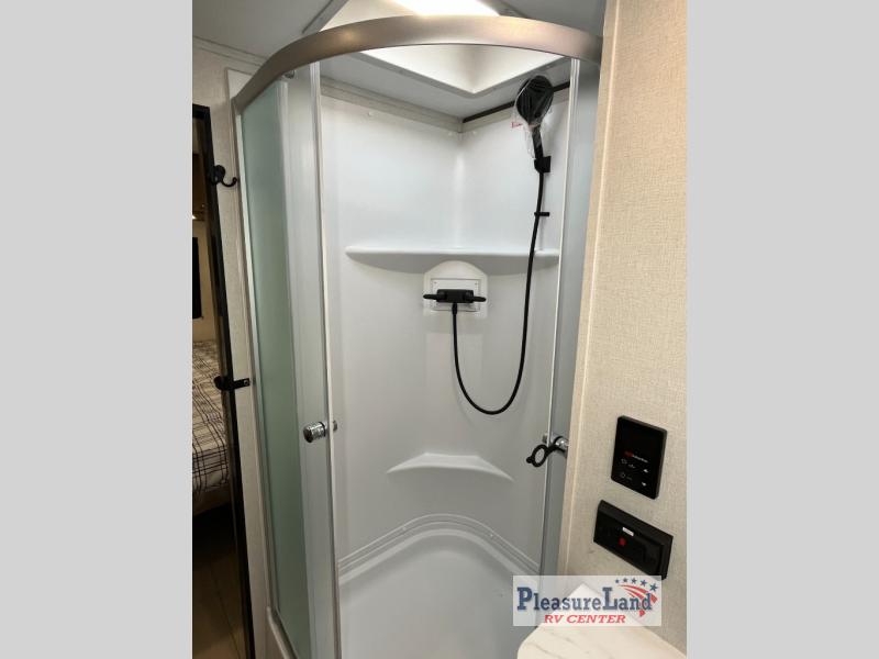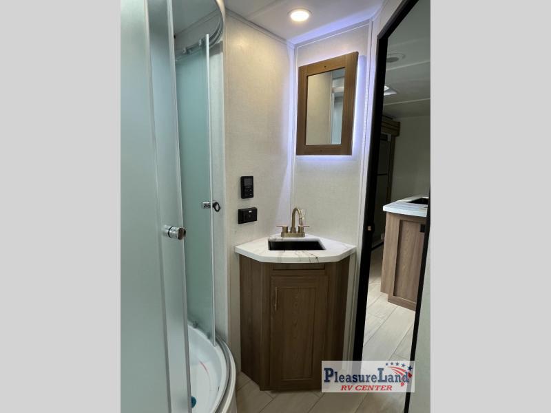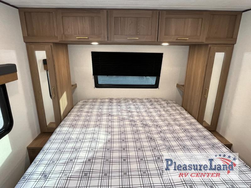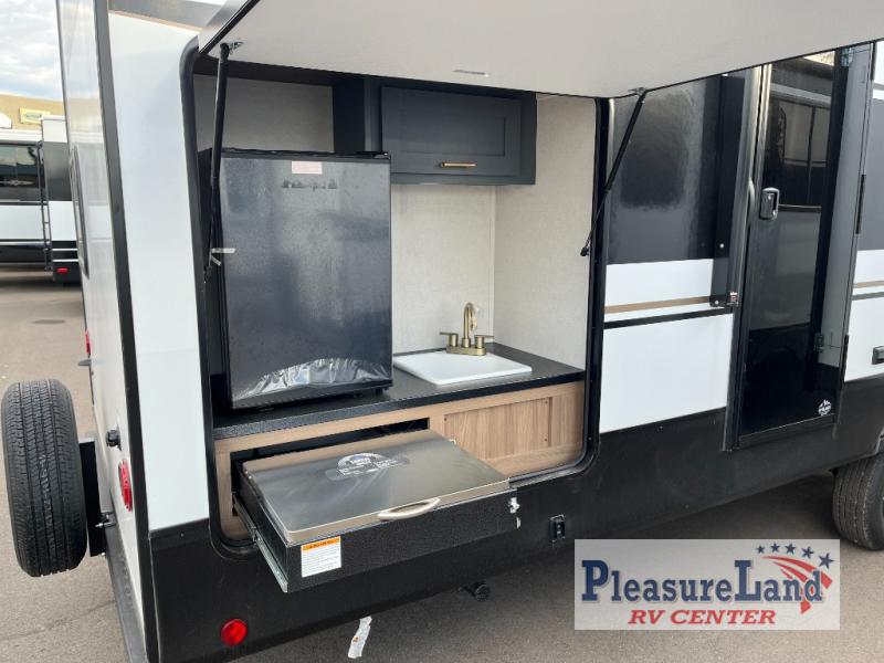 This travel trailer is packed with convenient features and luxury comforts for a camping trip you won't soon forget. Once you arrive at the campground, put out the electric awning and make a quick lunch on the exterior camp kitchen. The kitchen island inside will be the perfect place to cut up all the fixings for the burgers and you can grab the chips from the pantry. The kids will love the private bunkhouse that includes two bunks, a jackknife sofa with a kick, plus a dual entry half bath for convenience. The full walk-through bath will create a front master bedroom you are sure to love. Here, the king bed will provide a great night's rest and there are dual wardrobes for all your clothes.